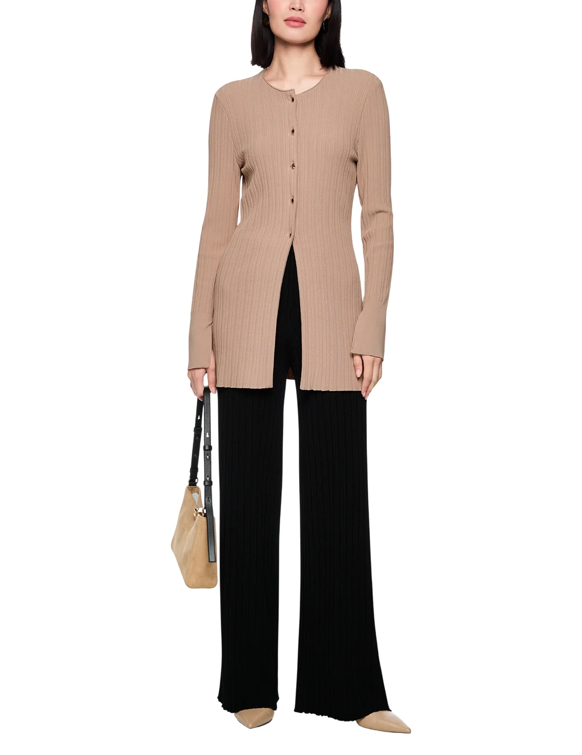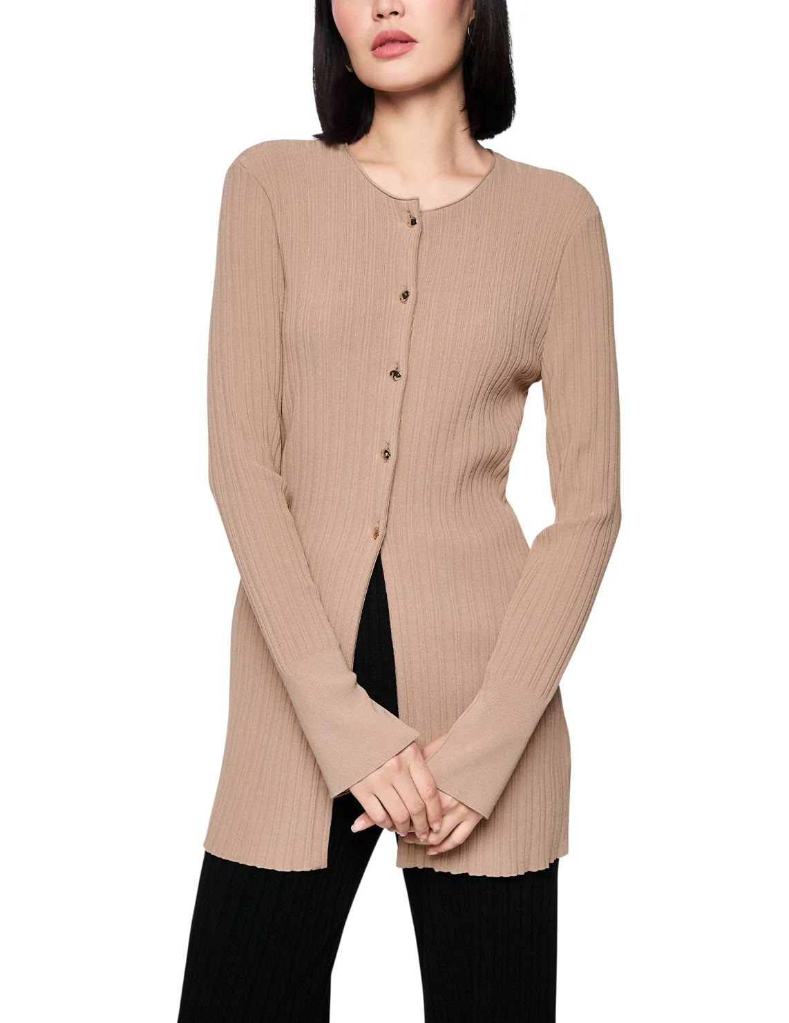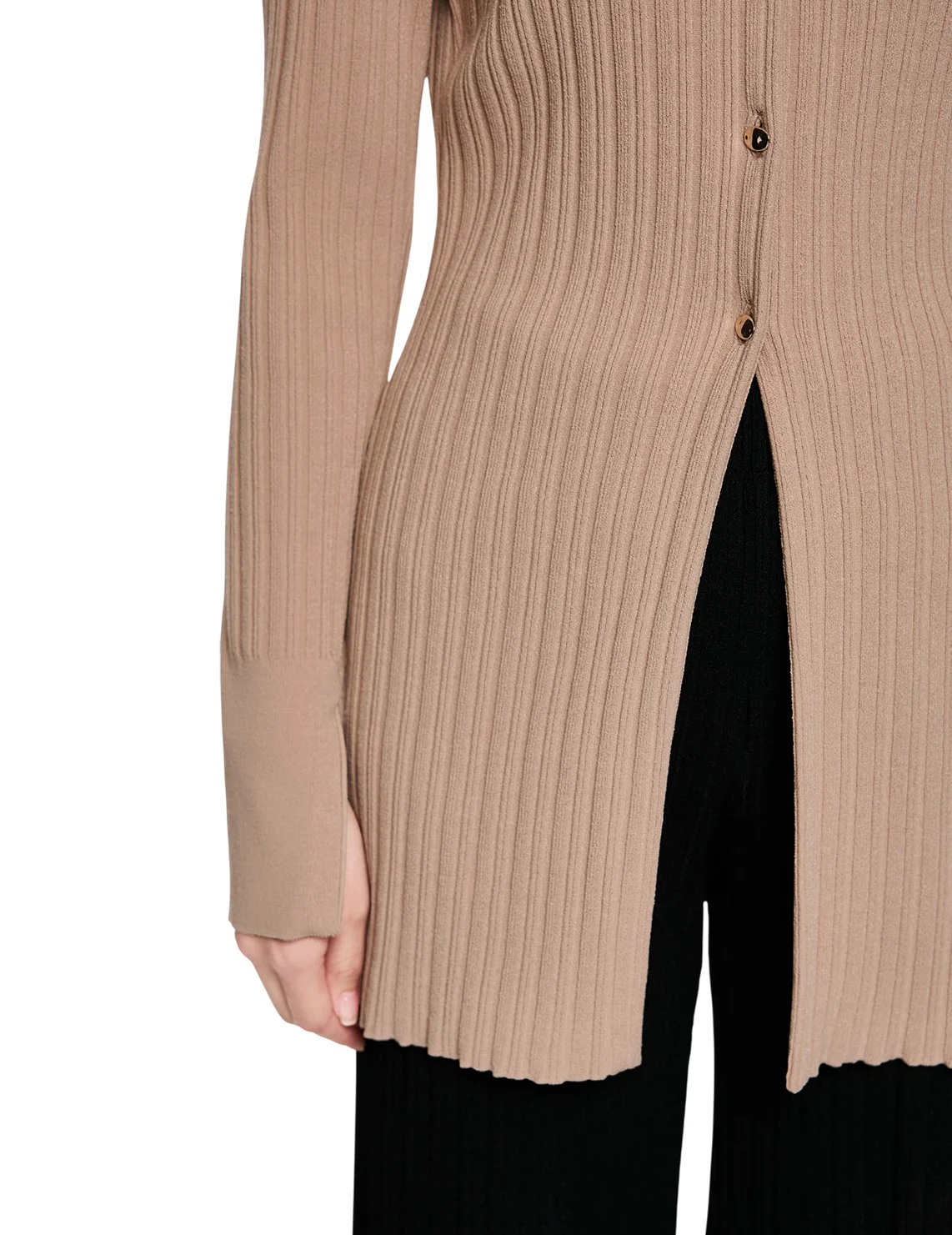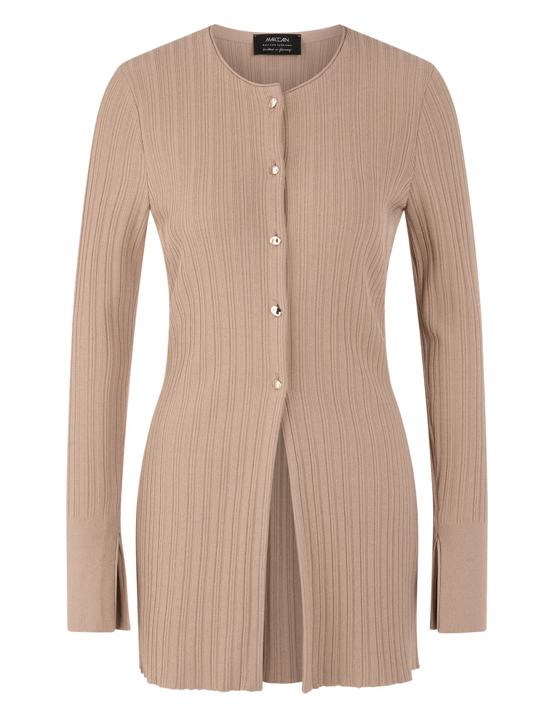 Кардиган изготовлен из вискозы и полиэстера. Модель выполнена в приталенном крое. Имеет круглый вырез горловины, длинные рукава с разрезами на манжетах и застежку на пуговицах.
