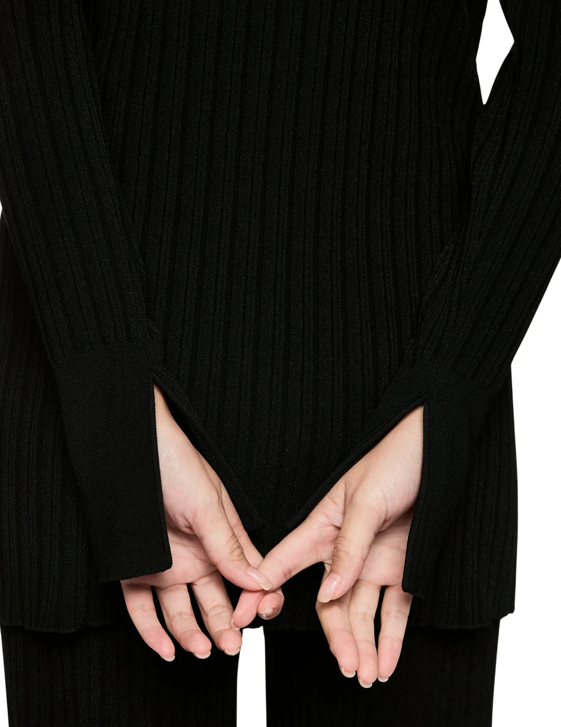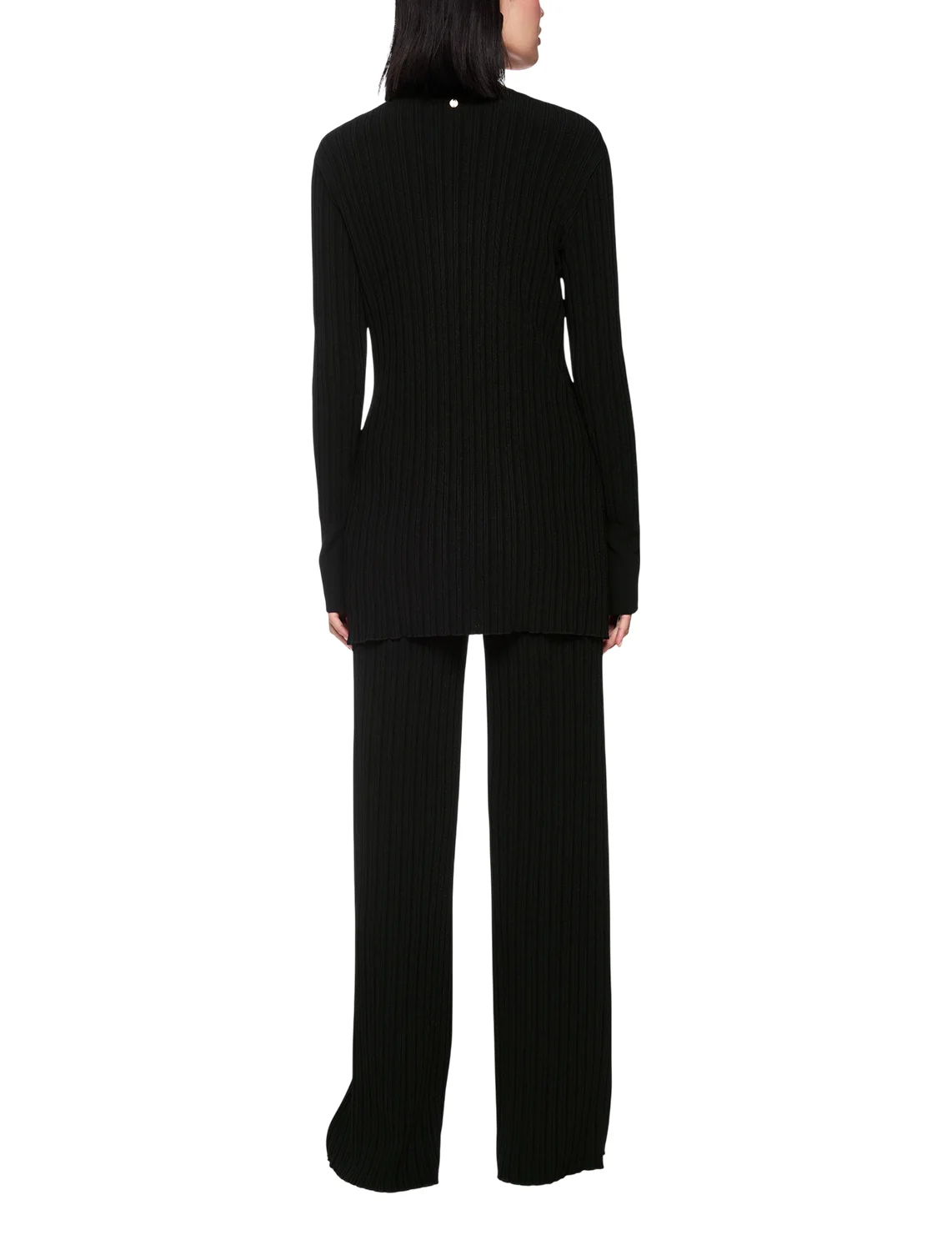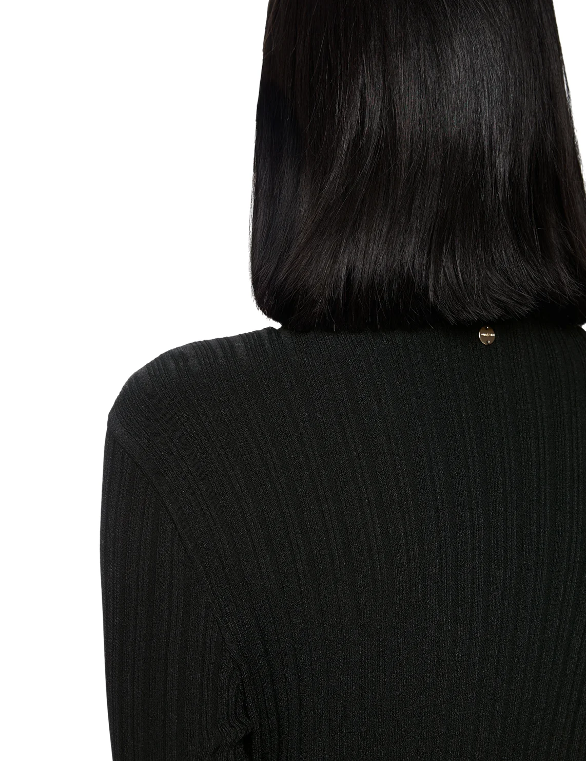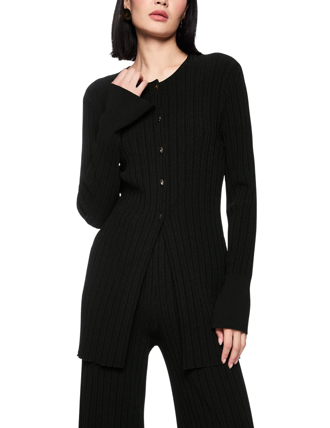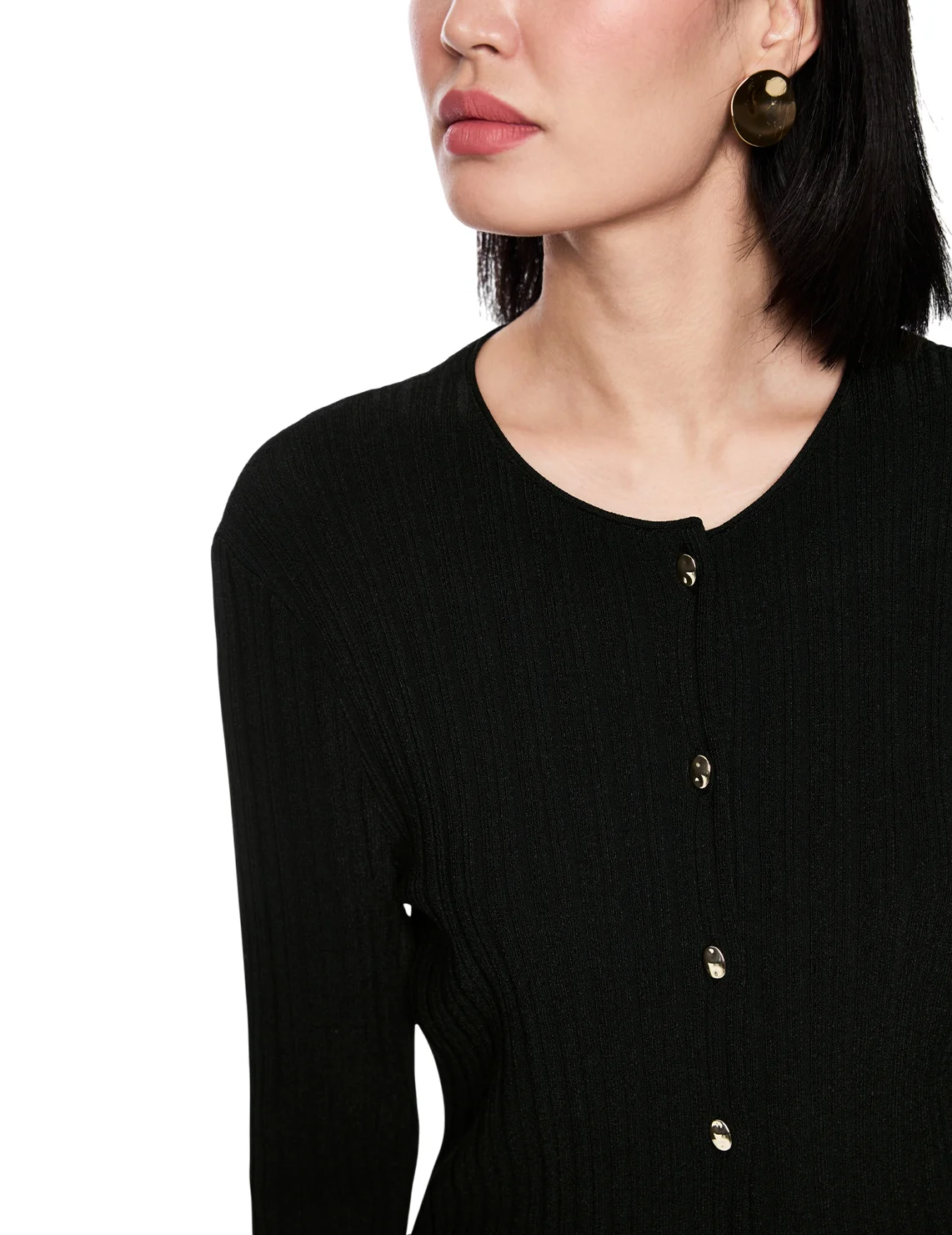 Кардиган изготовлен из вискозы и полиэстера. Модель выполнена в приталенном крое. Имеет круглый вырез горловины, длинные рукава с разрезами на манжетах и застежку на пуговицах.