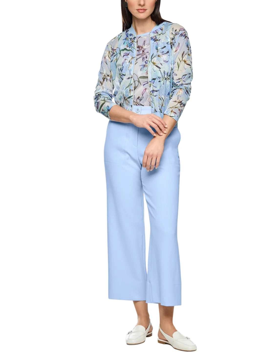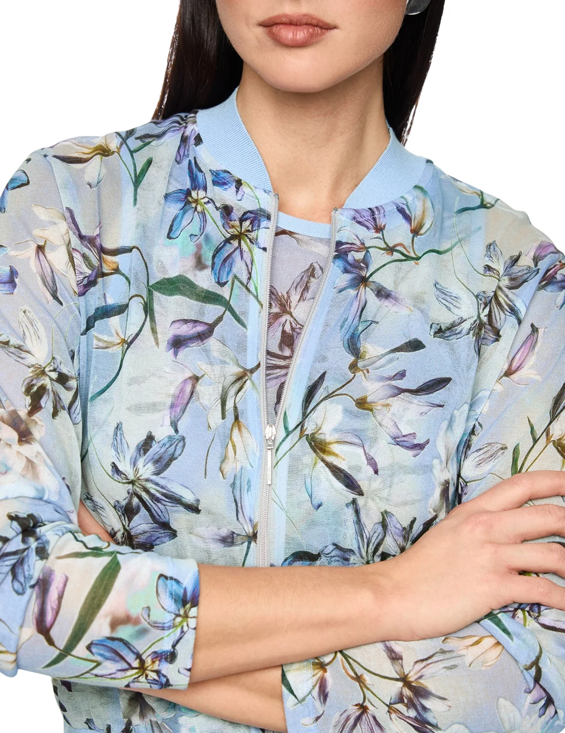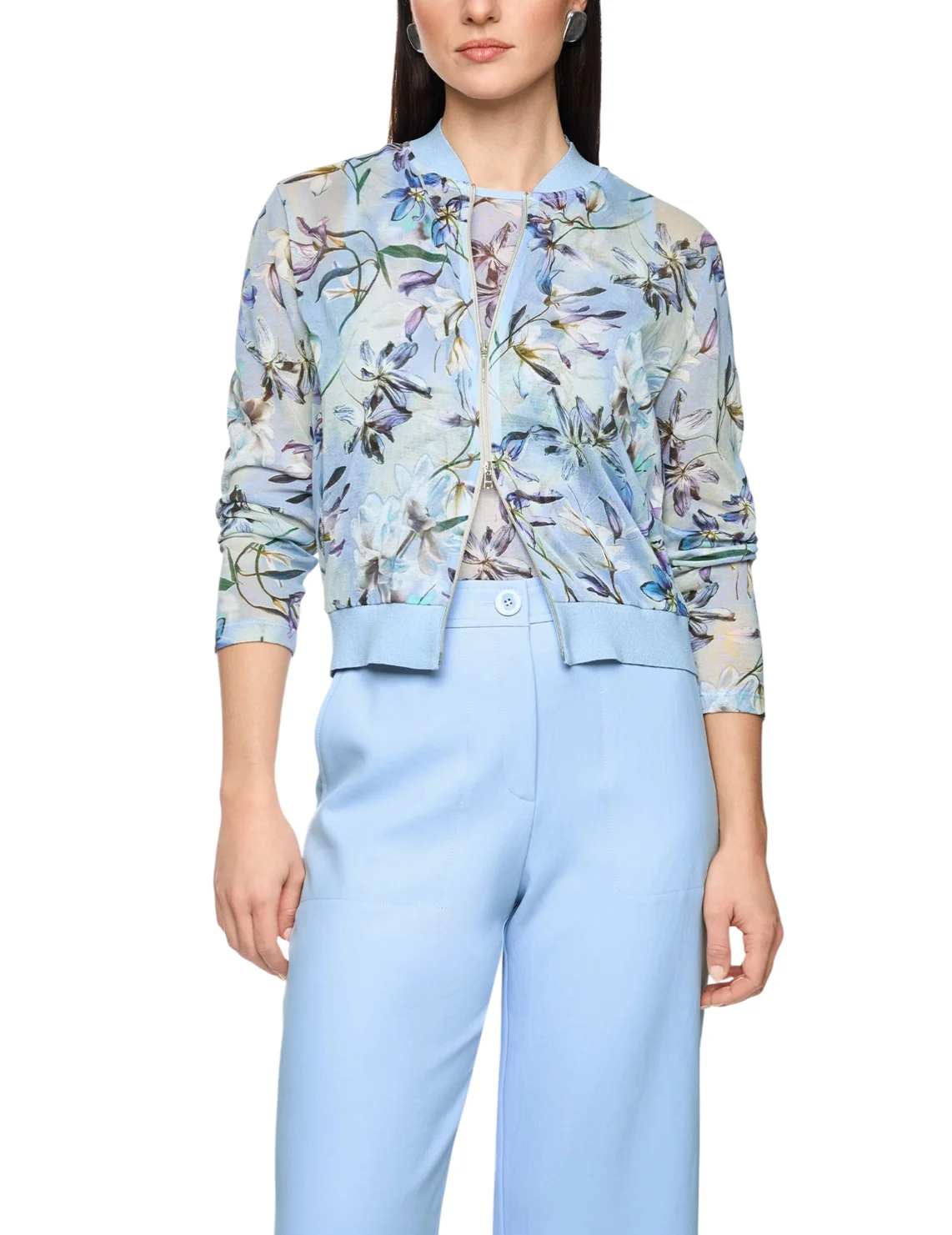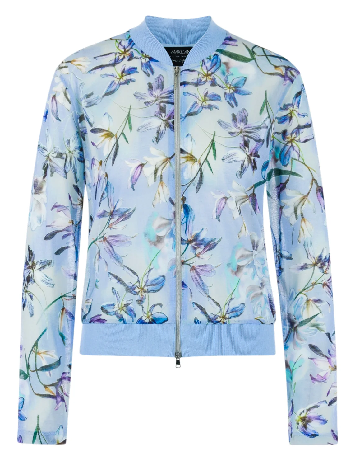 Кардиган изготовлен из хлопка и полиамида. Модель выполнена в прямом крое. Имеет воротник-стойку, двустороннюю застежку на молнии и длинные рукава с манжетами. Декорирован цветочным принтом.