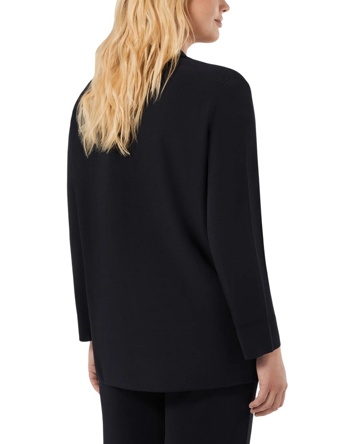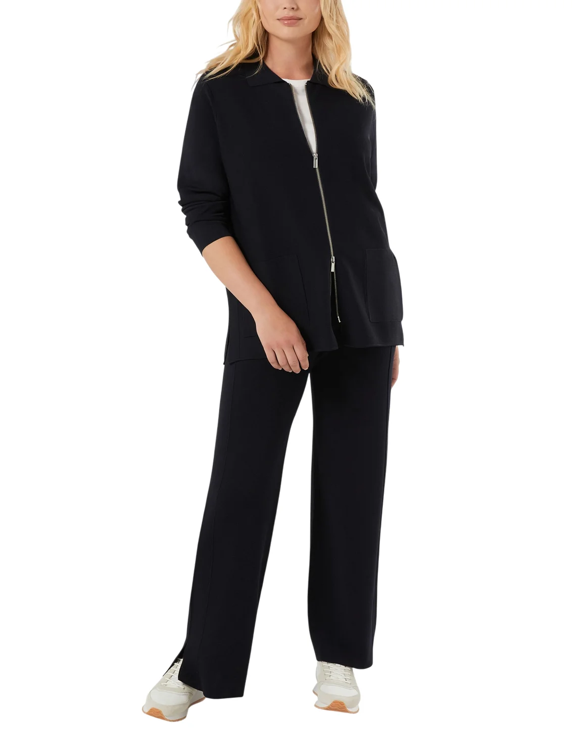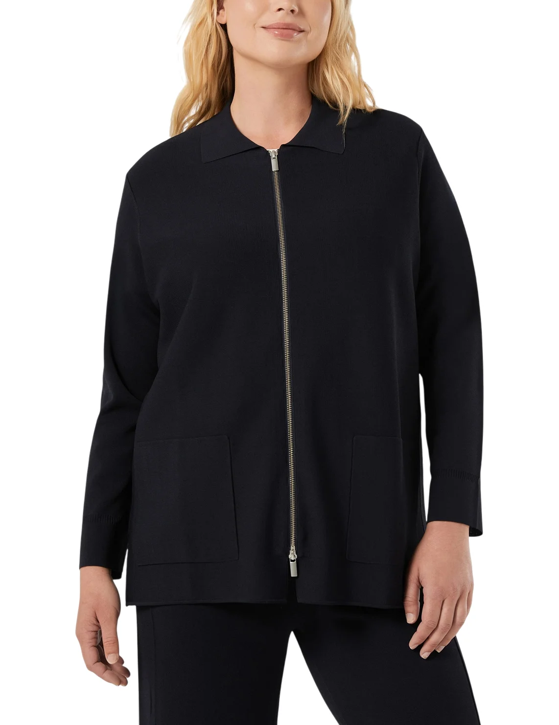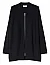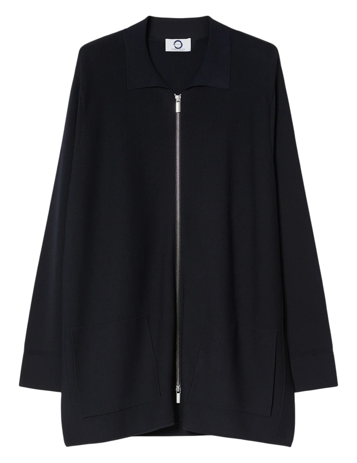 Кардиган изготовлен из вискозы и полиамида. Модель выполнена в прямом крое. Имеет отложной воротник, двустороннюю застежку на молнии, накладные карманы, боковые разрезы и длинные рукава с манжетами.