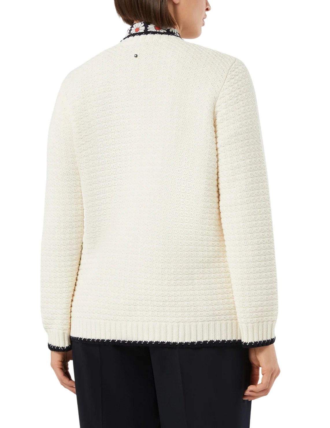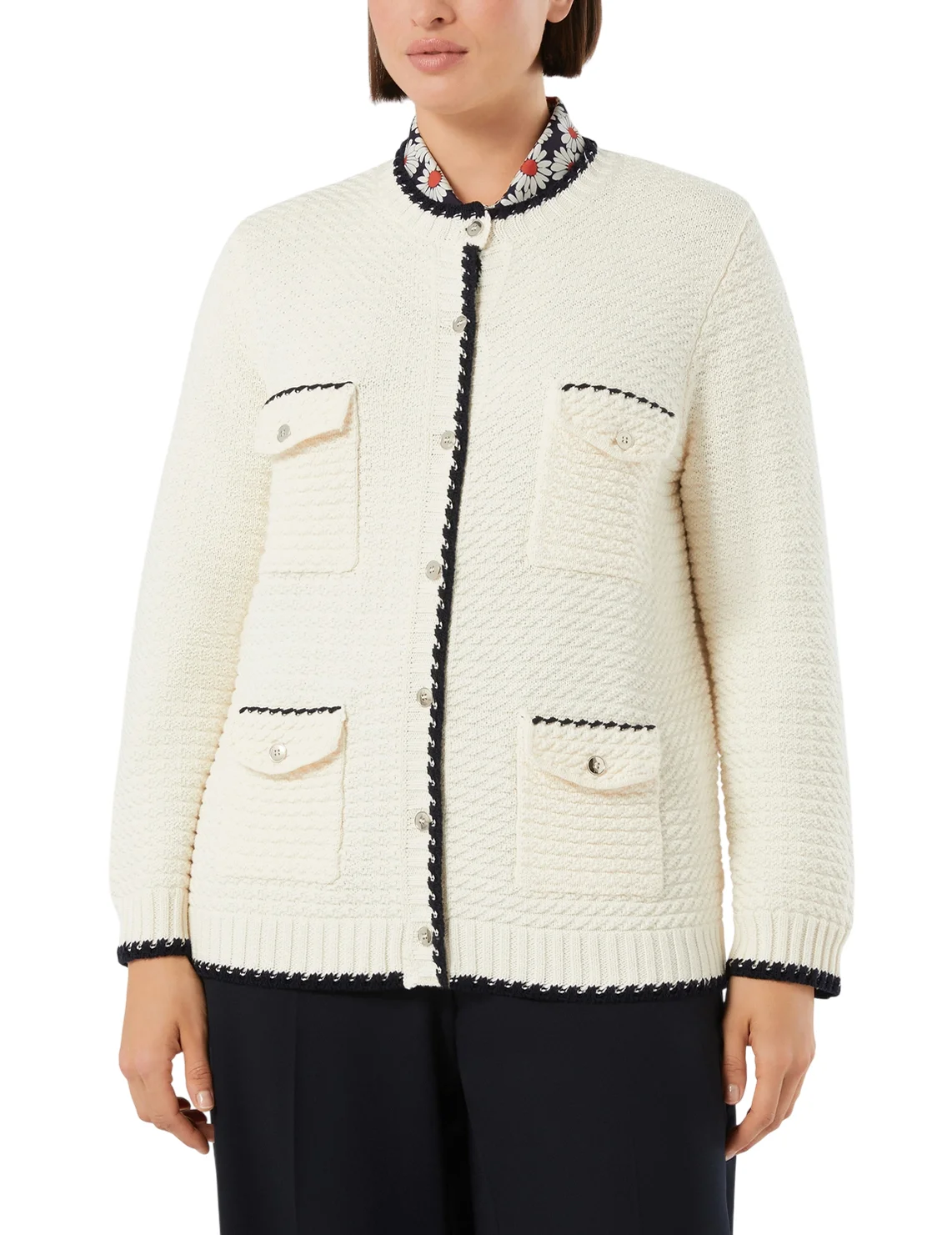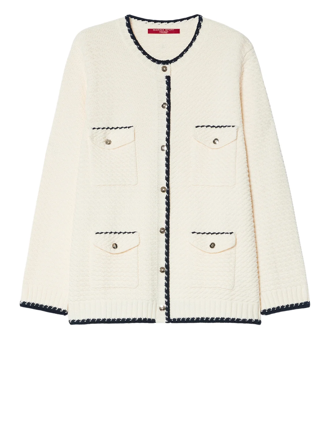 Кардиган изготовлен из 100% хлопка высокого качества. Модель выполнена в прямом крое. Имеет круглый вырез горловины, застежку на пуговицах, длинные рукава с манжетами и накладные карманы с клапанами. Декорирован контрастными полосками.