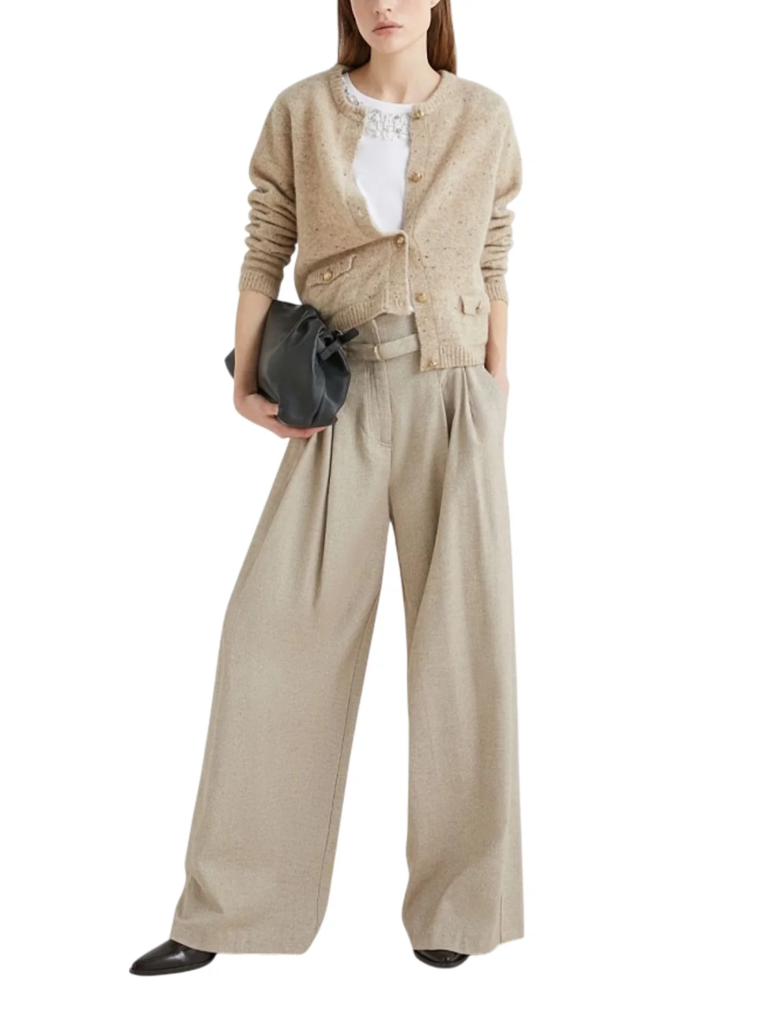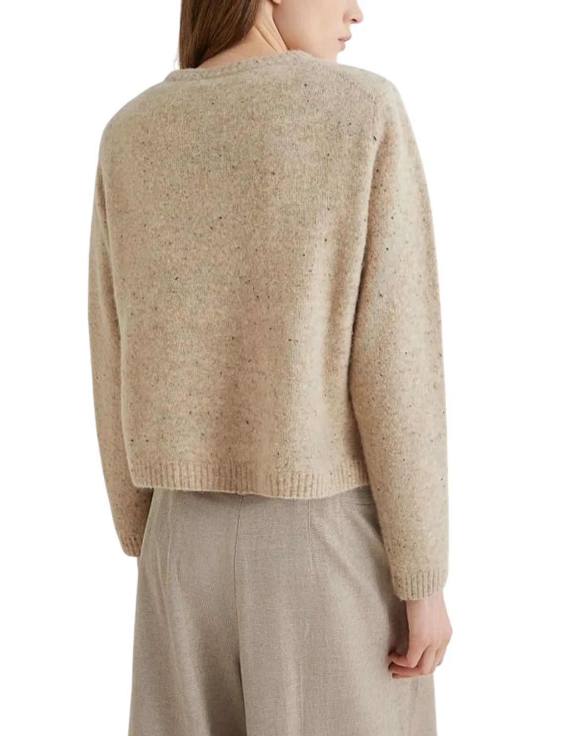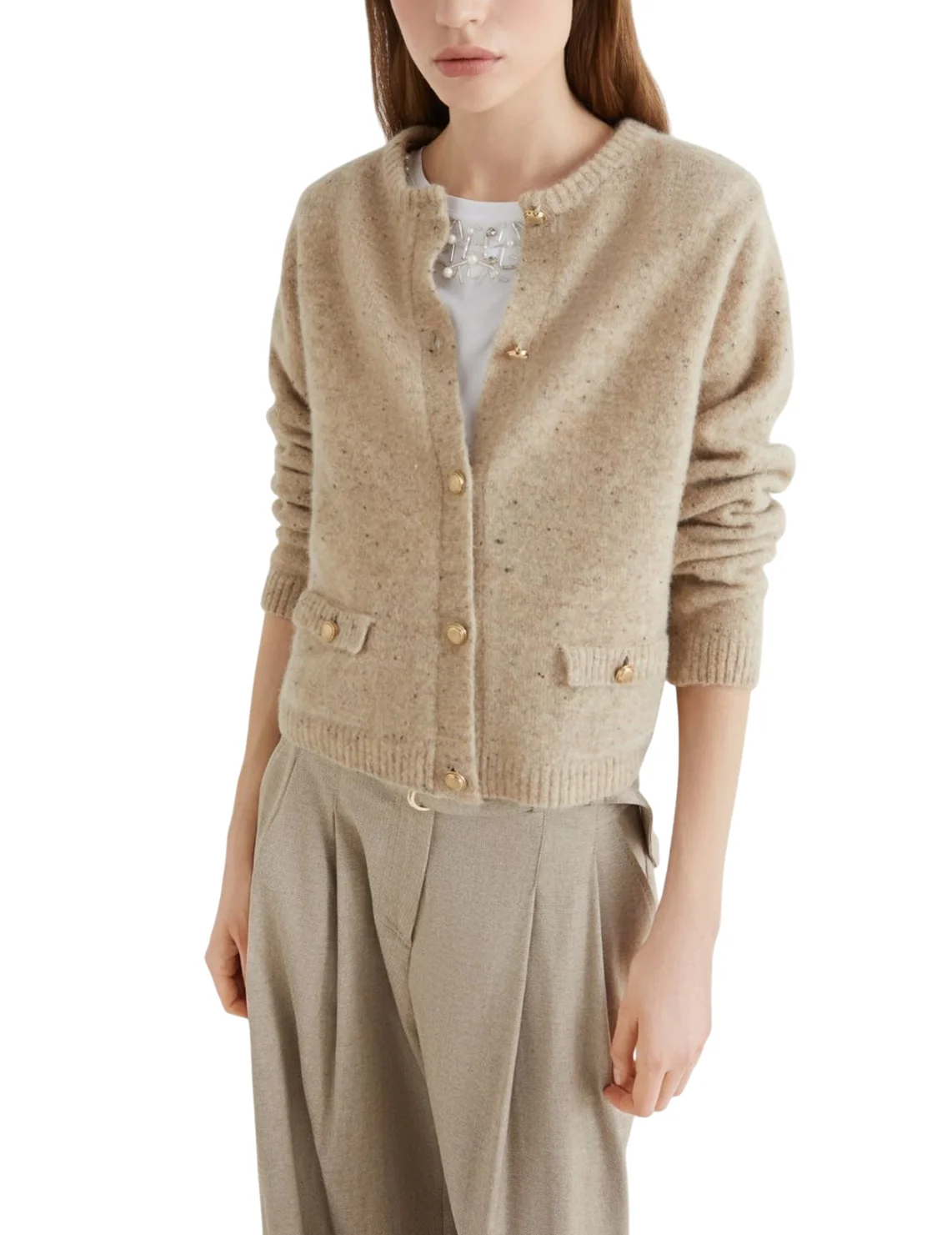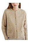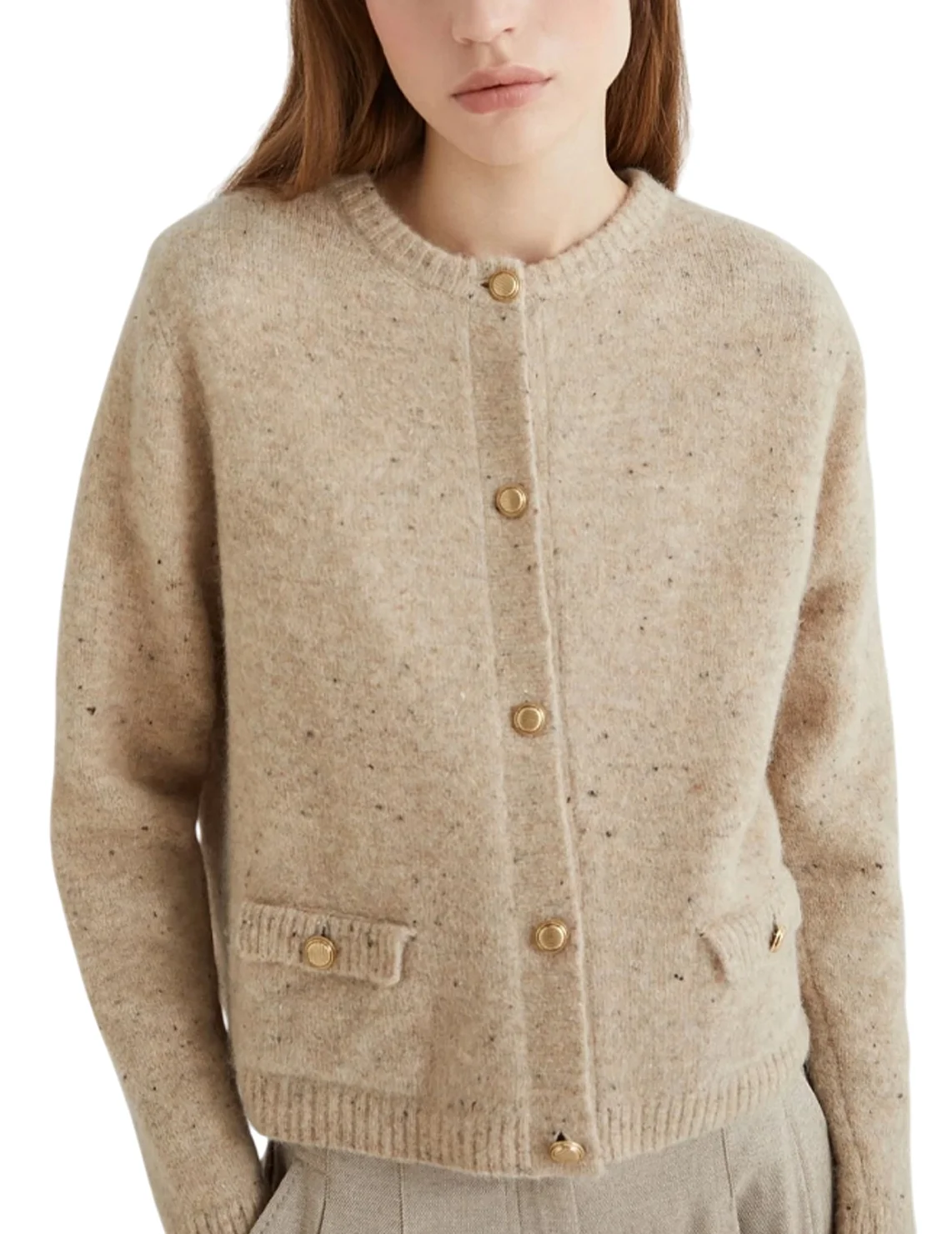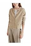 Кардиган изготовлен из альпаки, полиамида, шерсти, вискозы и эластана. Модель выполнена в прямом крое. Имеет круглый вырез горловины, застежку на пуговицах, длинные рукава с манжетами и передние карманы с клапанами.