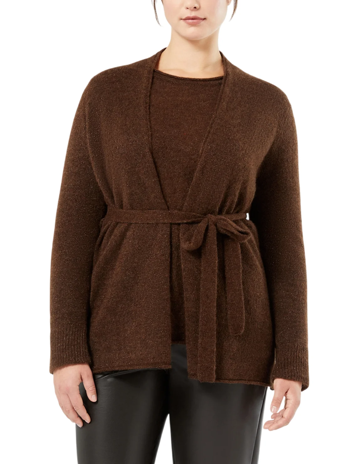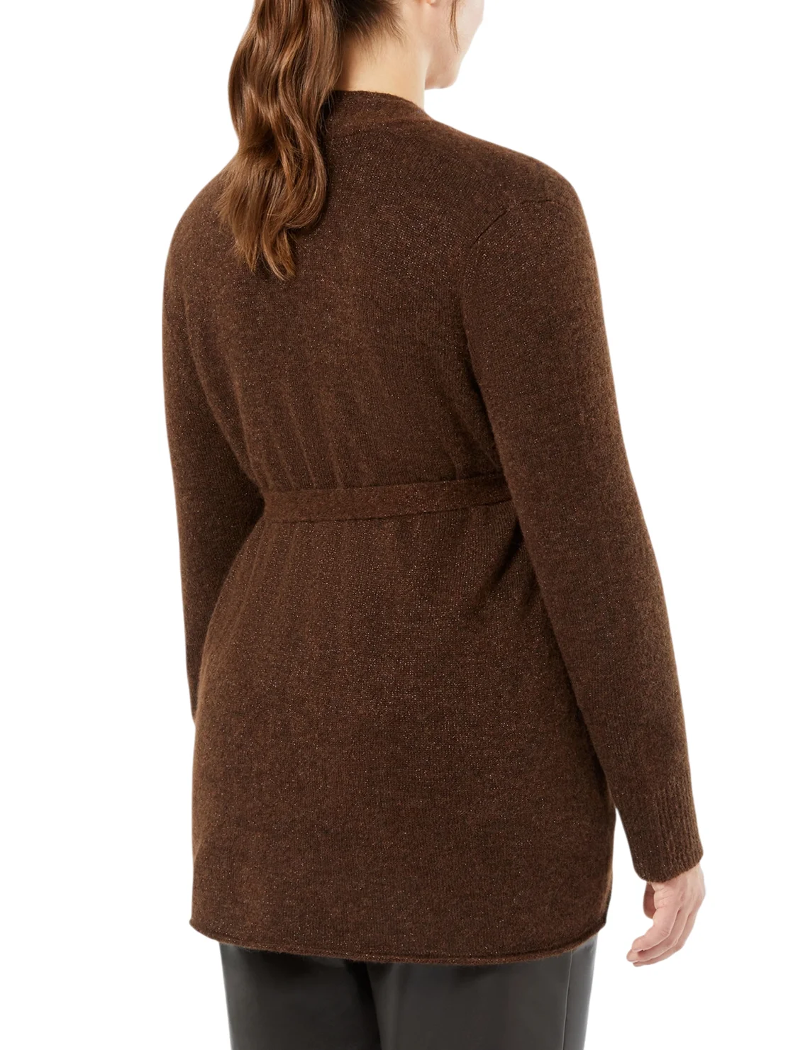 Кардиган изготовлен из альпаки, полиамида и шерсти. Модель выполнена в прямом крое. Имеет V-образный вырез горловины, тканевый пояс в тон и длинные рукава с манжетами.