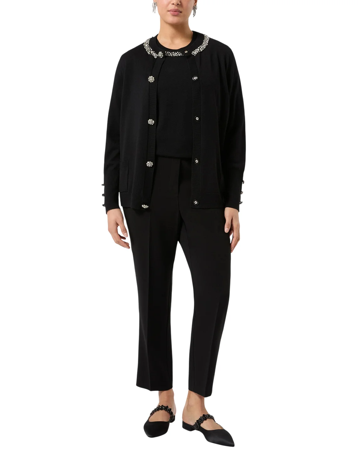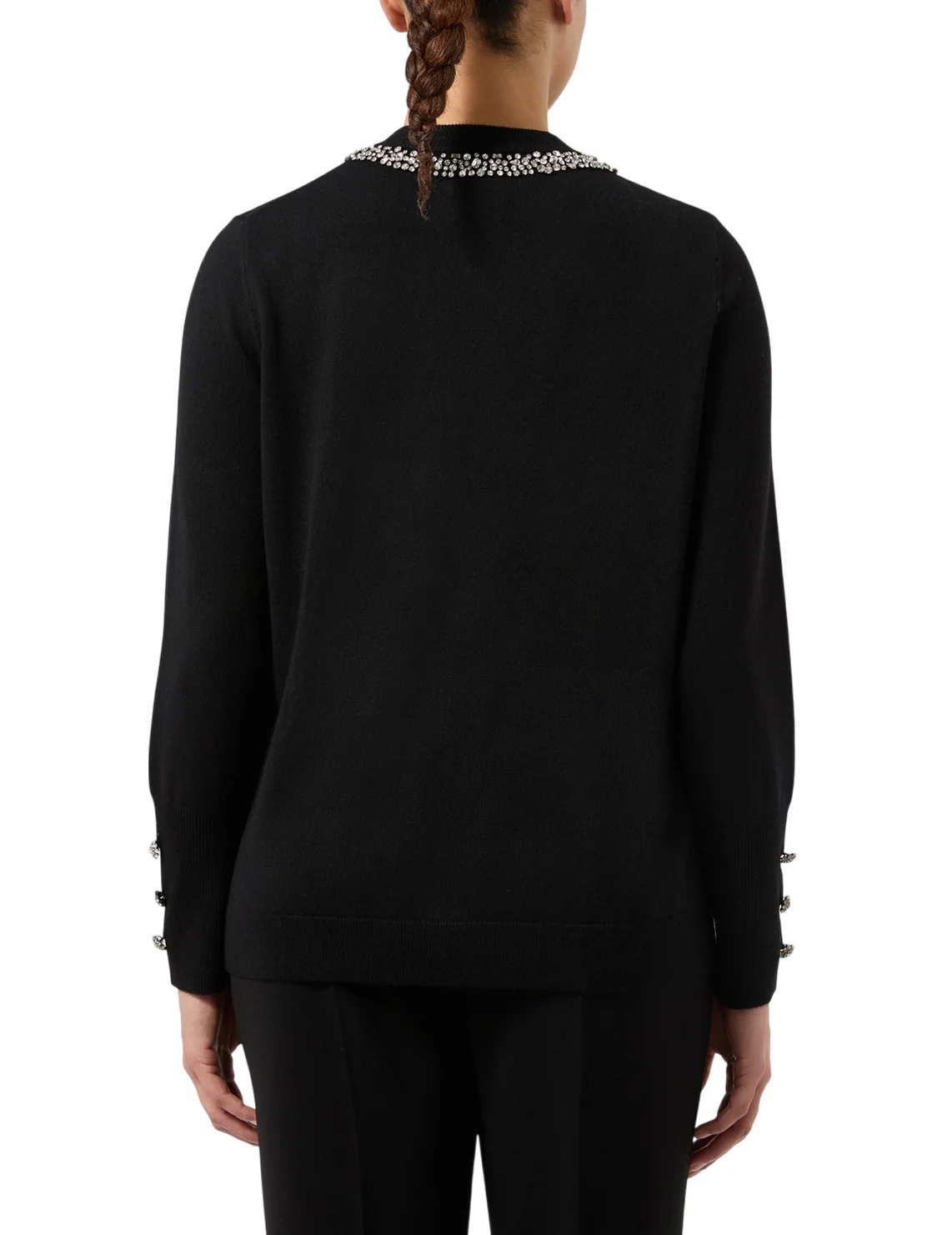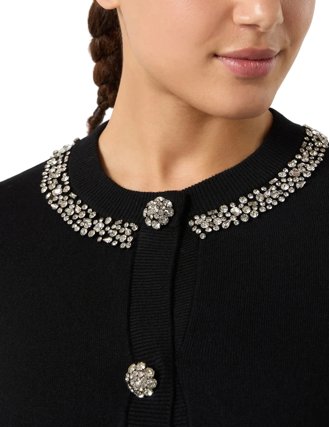 Кардиган изготовлен из смеси вискозы, полиамида, шерсти, кашемира и шелка. Модель прямого кроя. Имеет круглый вырез, длинные рукава, накладные передние карманы и застежку на пуговицах с драгоценными камнями. Декорирован хрустальными деталями.