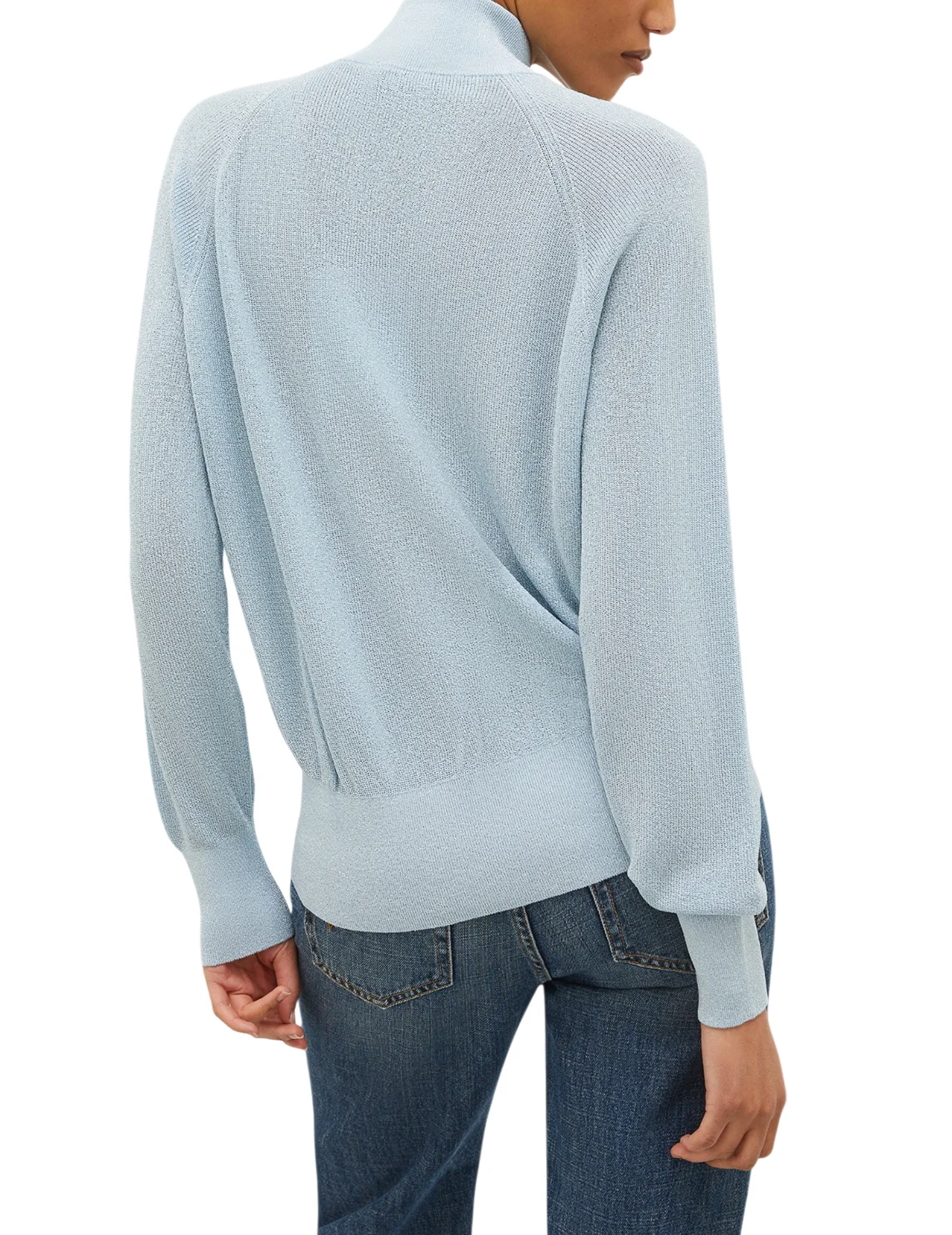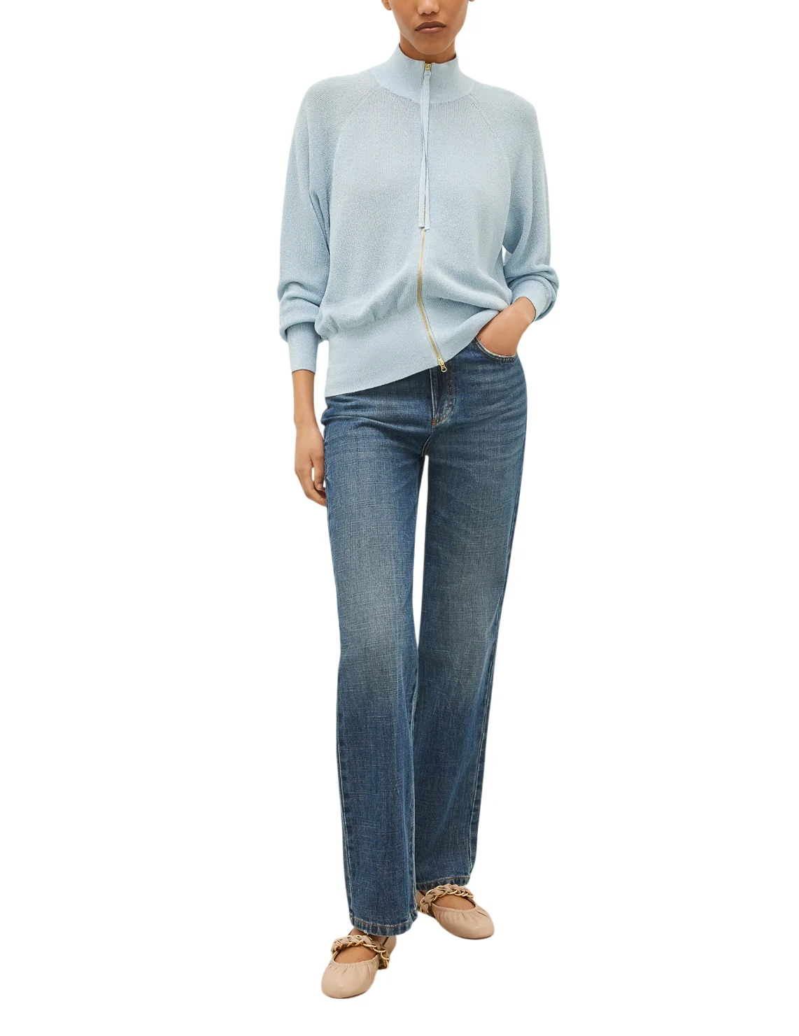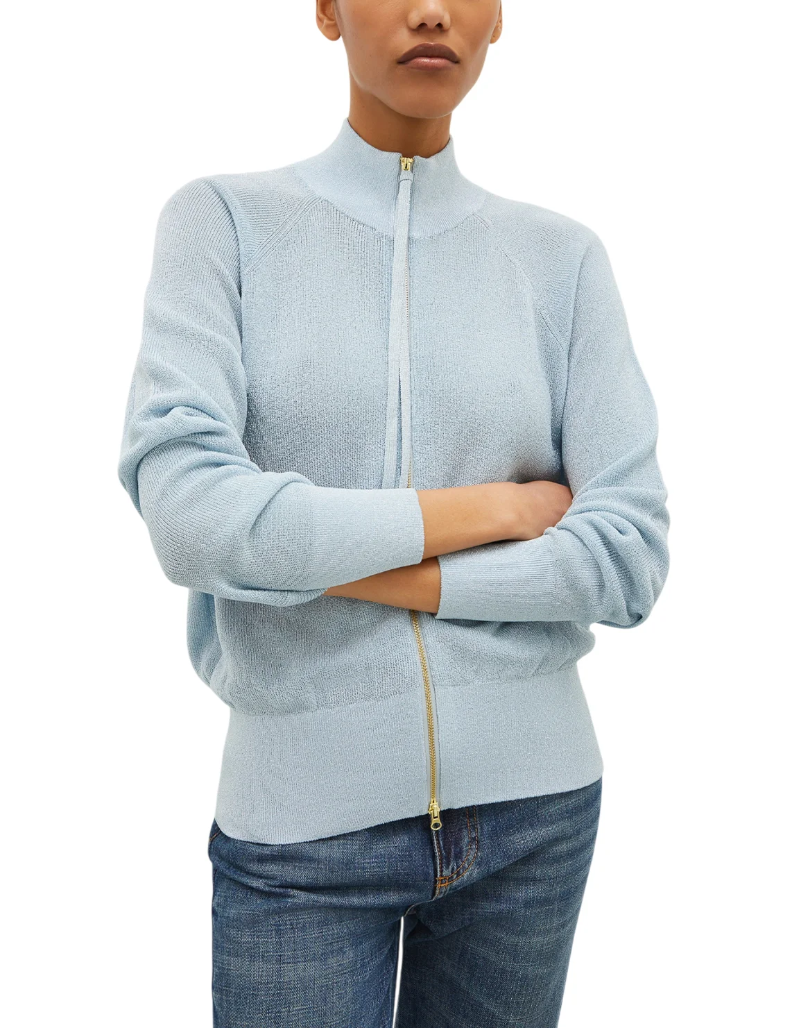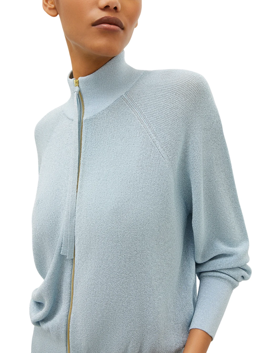 Кардиган изготовлен из вискозы, полиамида и люрекса. Модель выполнена в прямом крое. Имеет воротник-стойку, двустороннюю застежку-молнию и длинные рукава с манжетами.