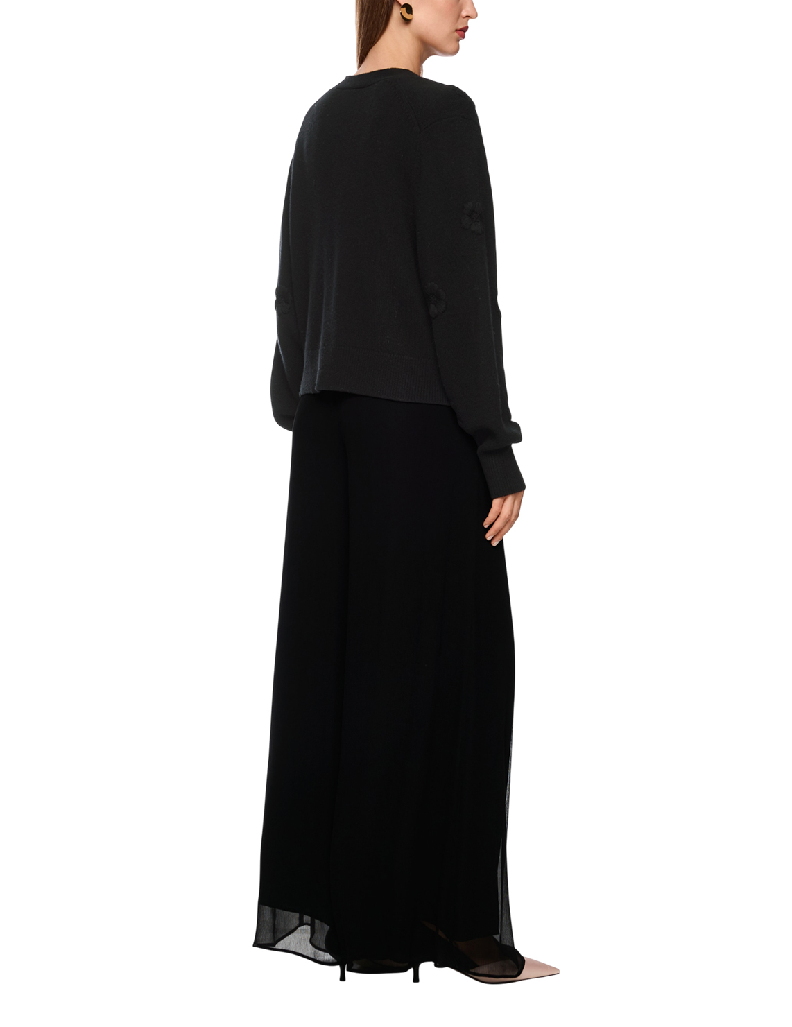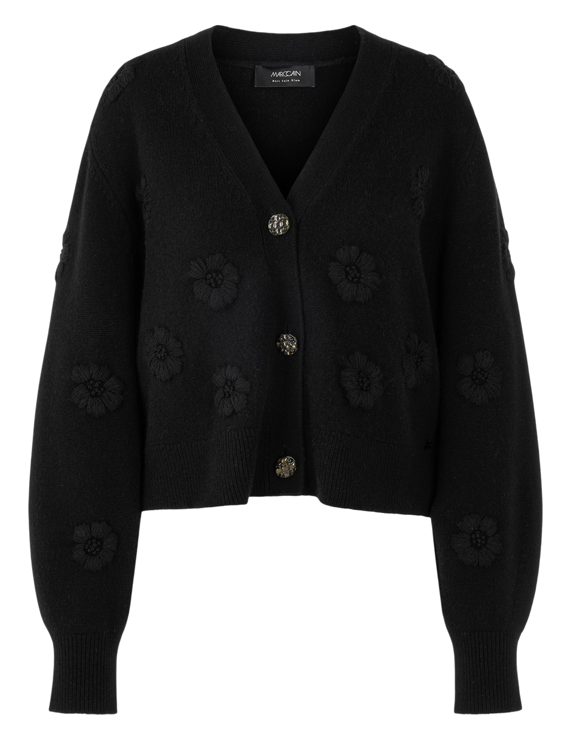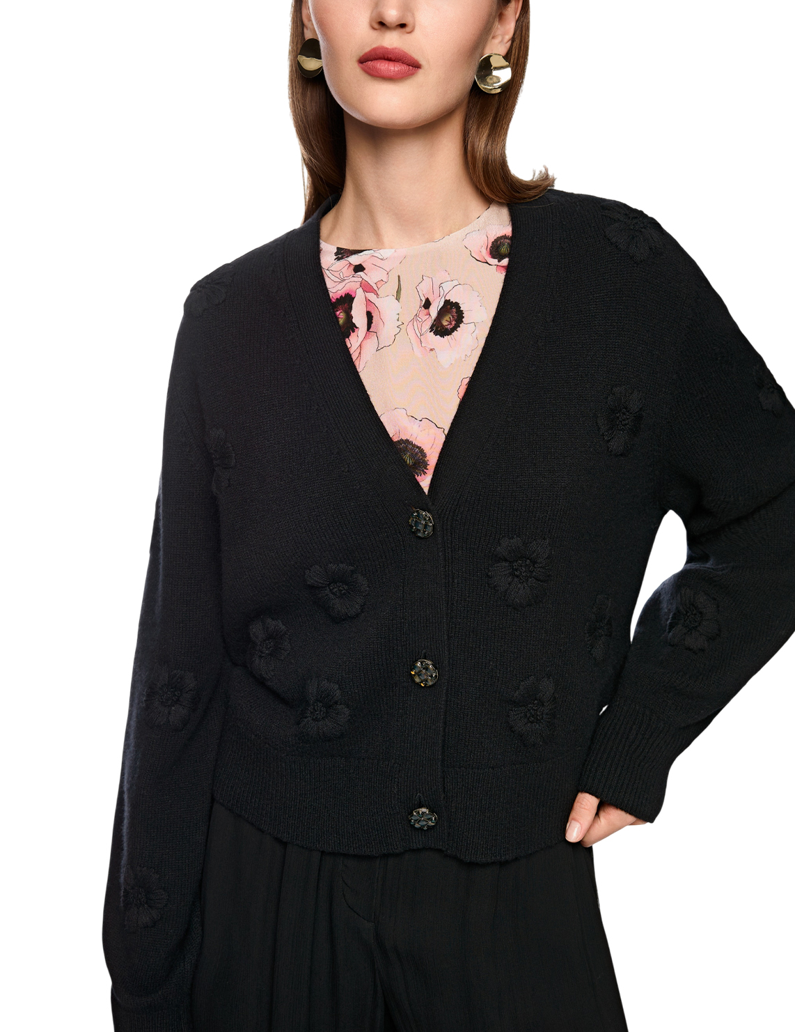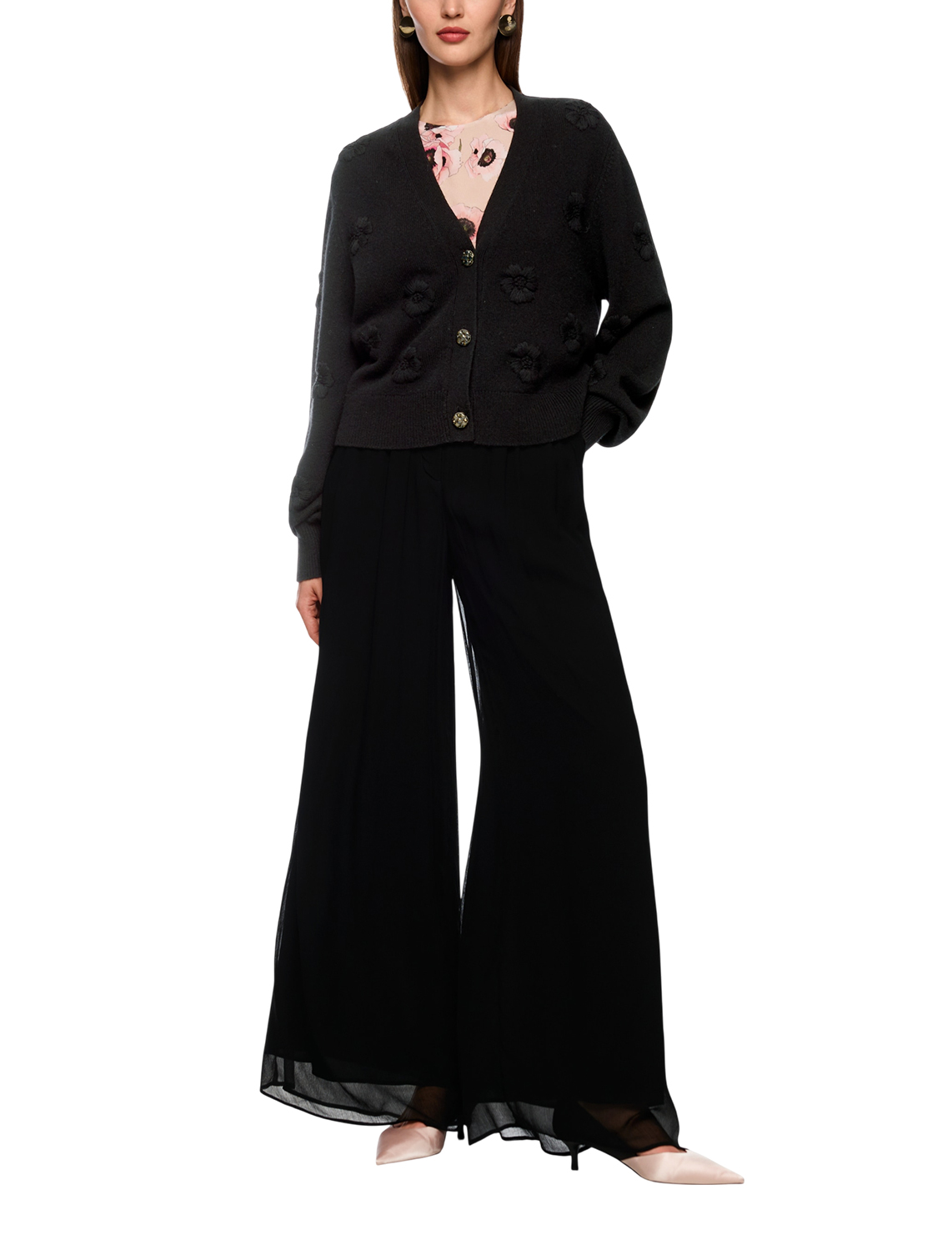 Кардиган изготовлен из шерсти и кашемира. Модель выполнена в свободном крое. Имеет V-образный вырез горловины, заниженную плечевую линию, длинные рукава с манжетами и застежку на пуговицах. Декорирован цветочной вышивкой.