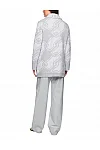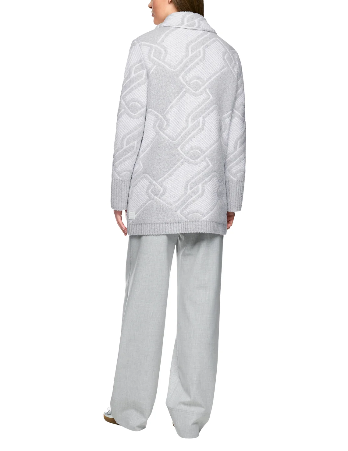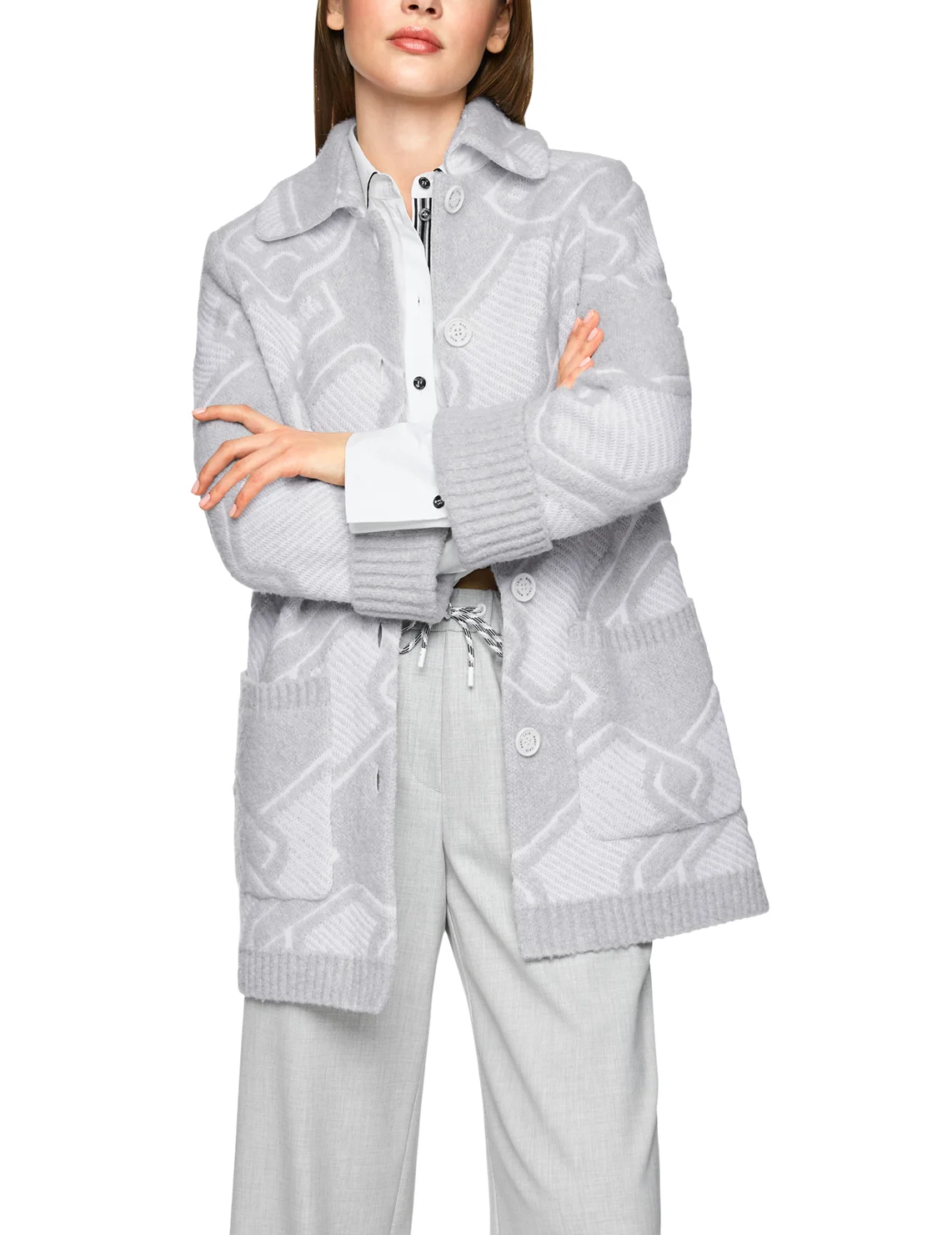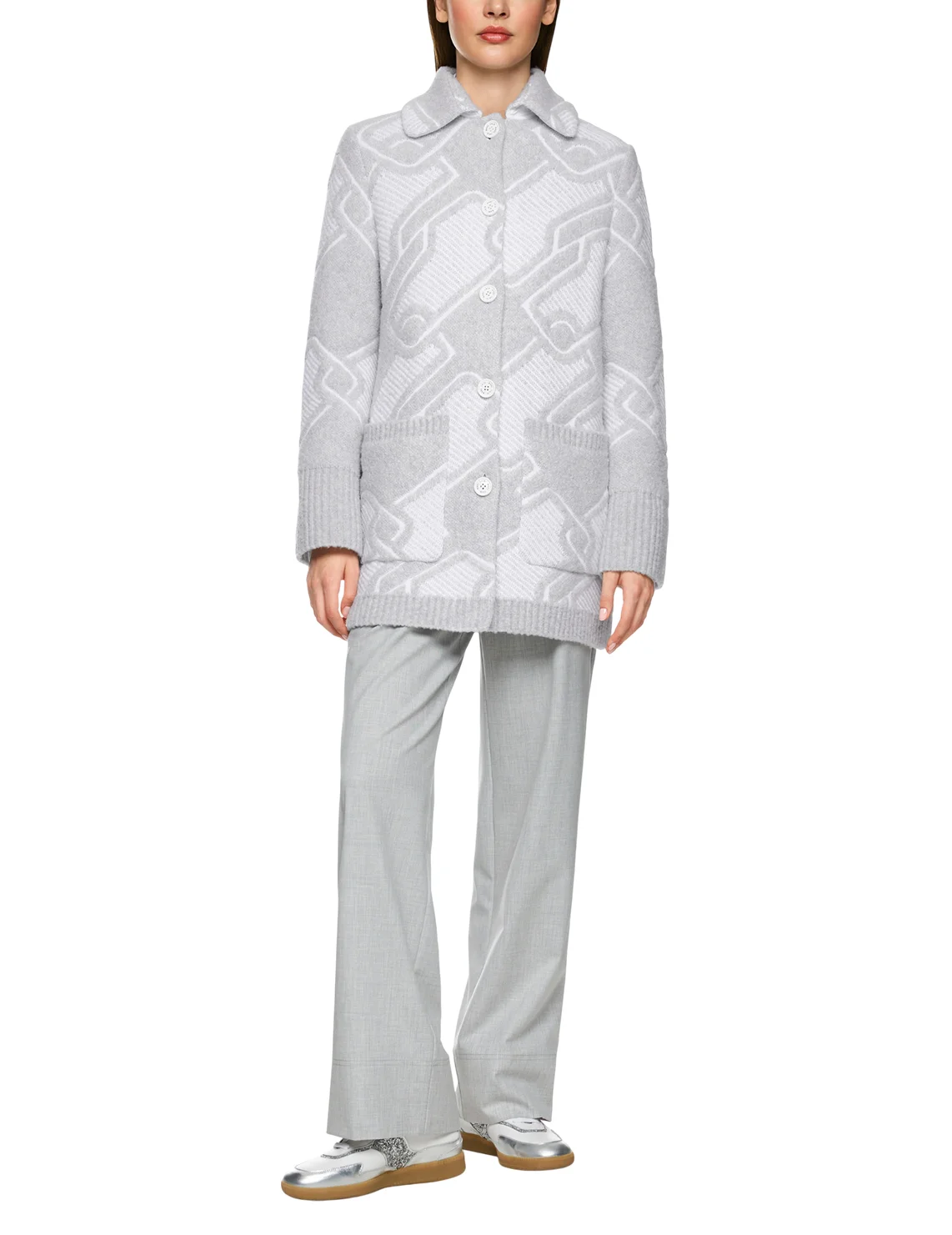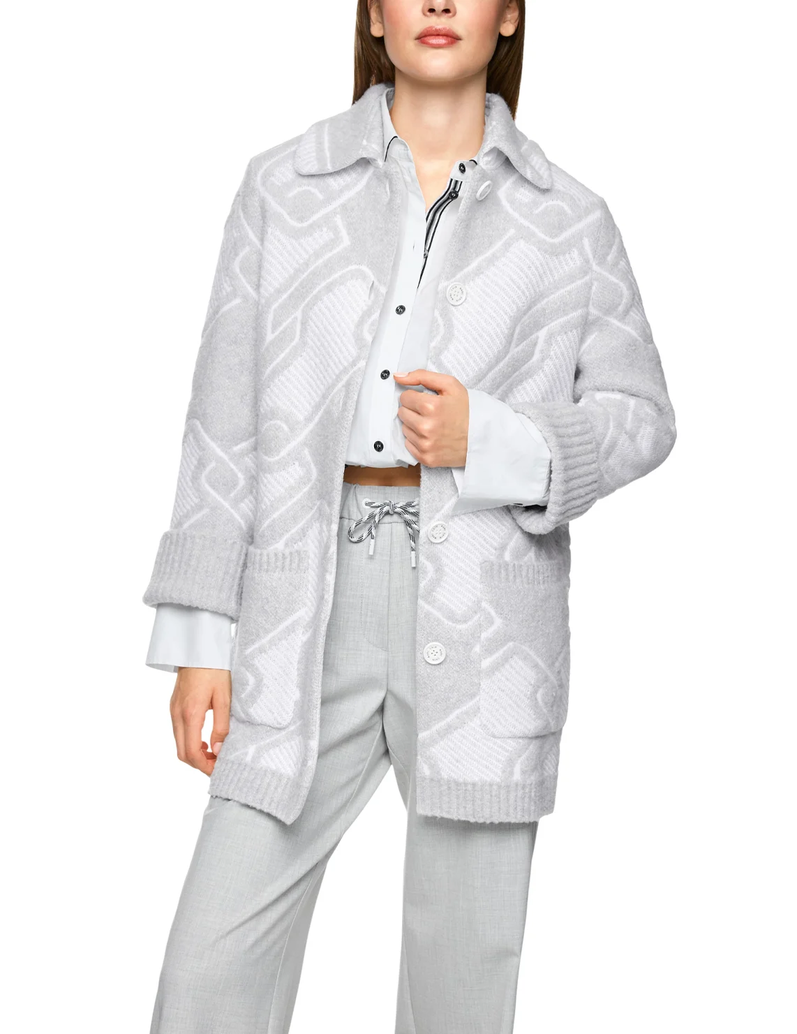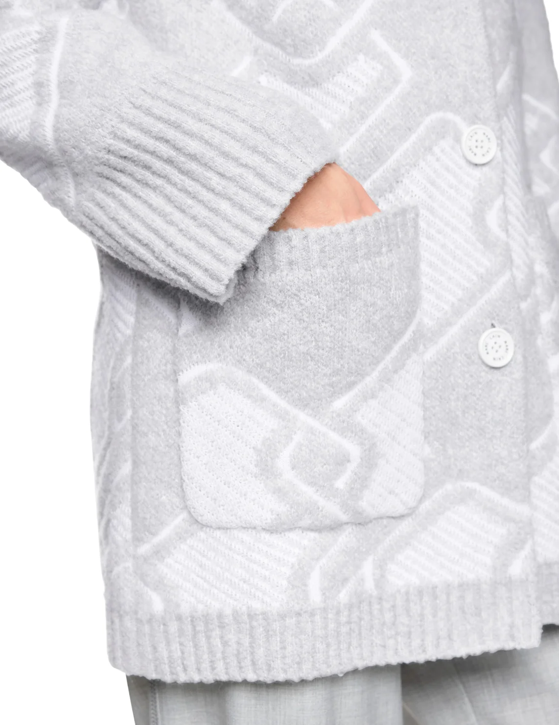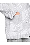 Кардиган изготовлен из шерсти, полиамида и хлопка. Модель выполнена в прямом крое. Имеет отложной воротник, застежку на пуговицах, накладные карманы и длинные рукава с манжетами. Декорирован оригинальным принтом.