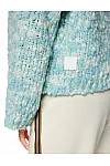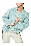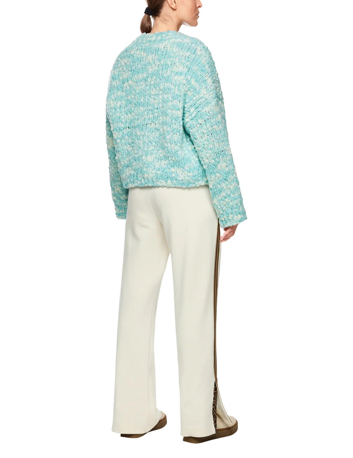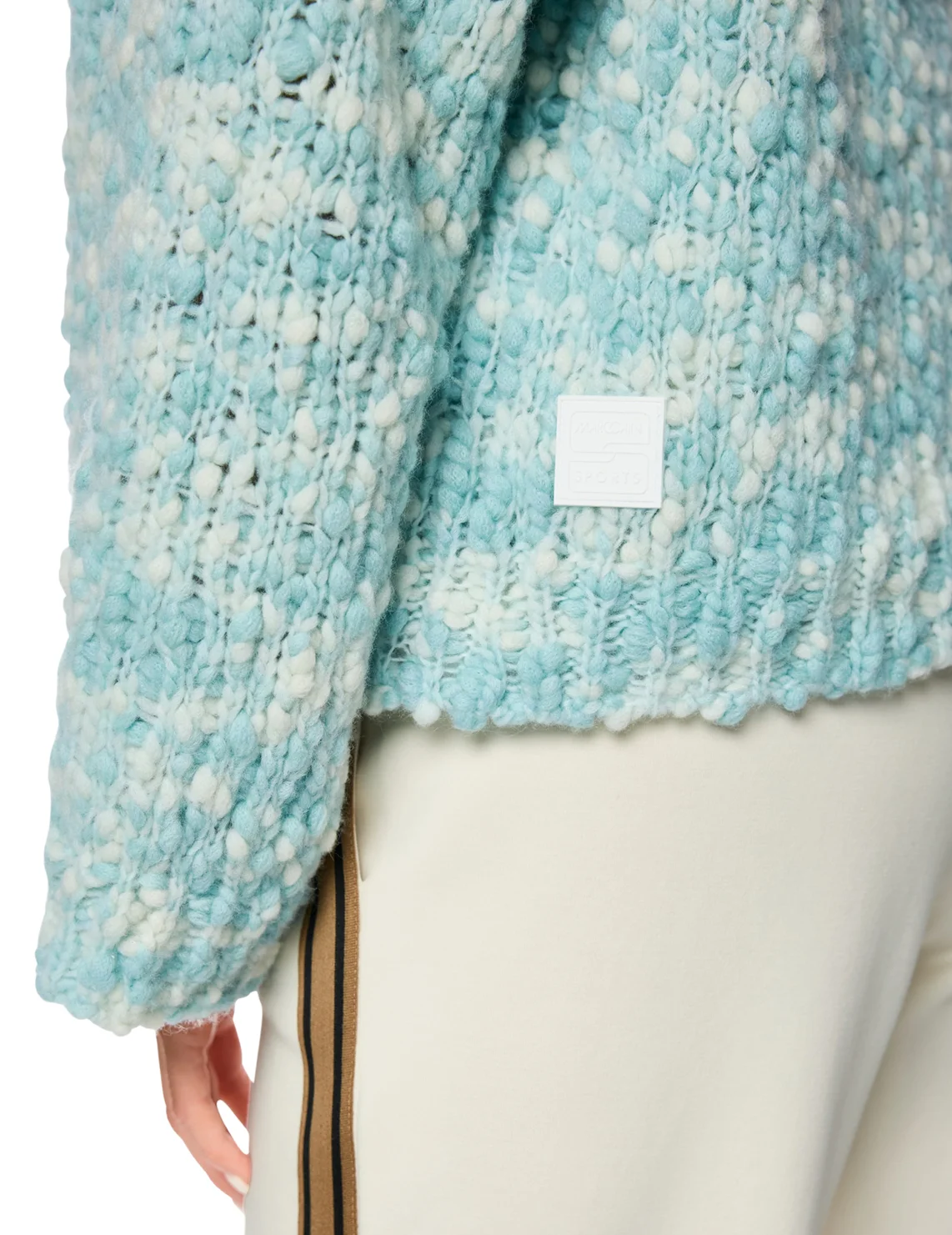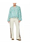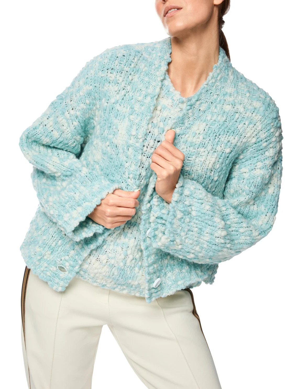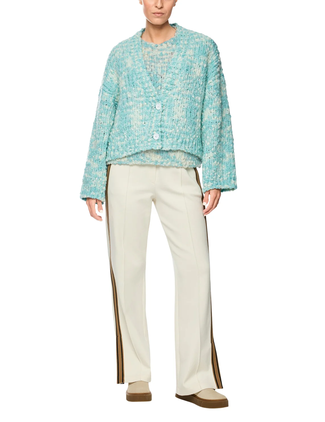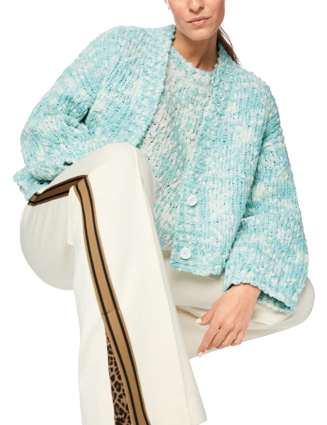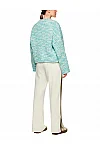 Кардиган изготовлен из шерсти и полиамида. Модель выполнена в свободном крое. Имеет V-образный вырез горловины, заниженную плечевую линию, длинные рукава и застежку на пуговицах. Декорирован оригинальным принтом.