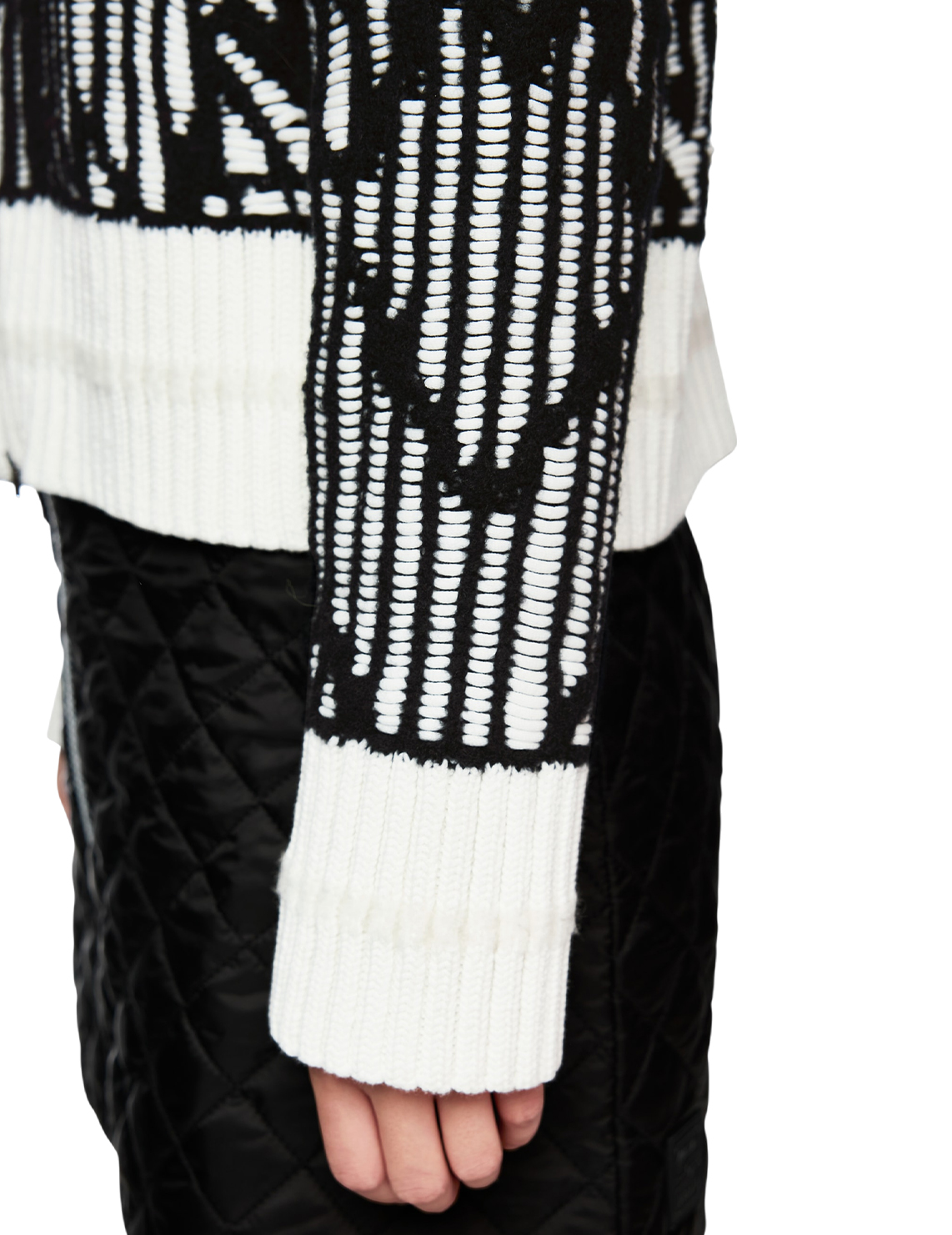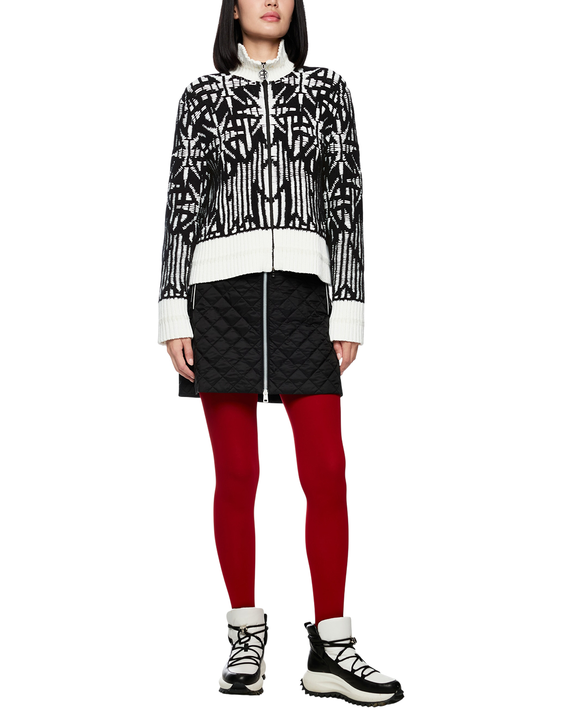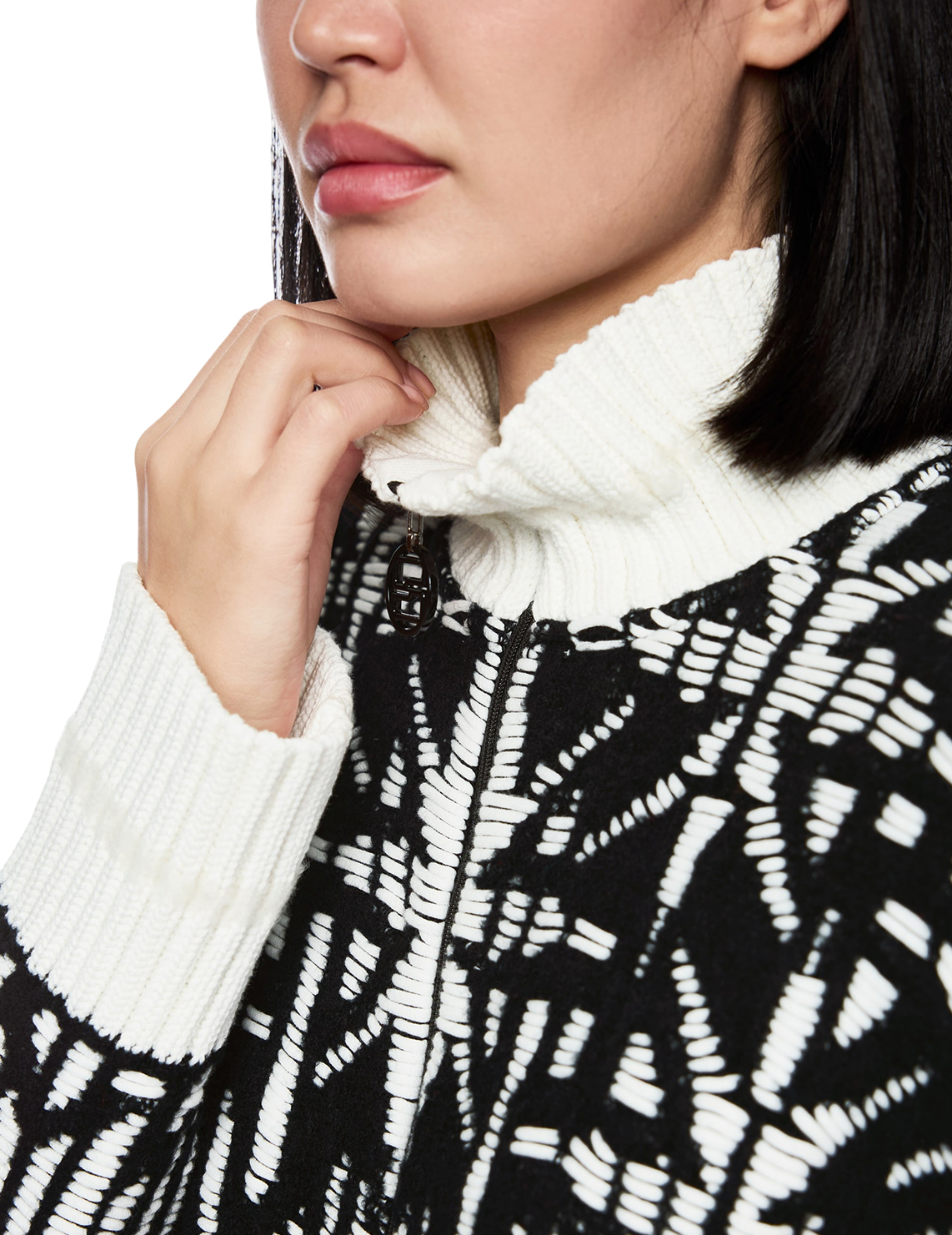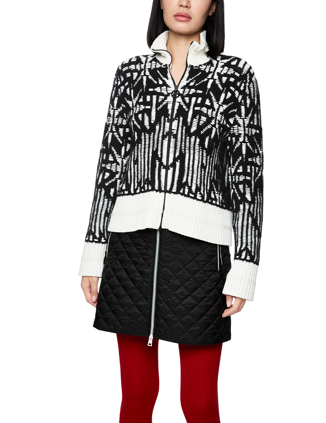 Кардиган изготовлен из хлопка, полиамида и шерсти. Модель выполнена в прямом крое. Имеет воротник-стойку, двустороннюю застежку на молнии и длинные рукава с манжетами. Декорирован оригинальным узором.
