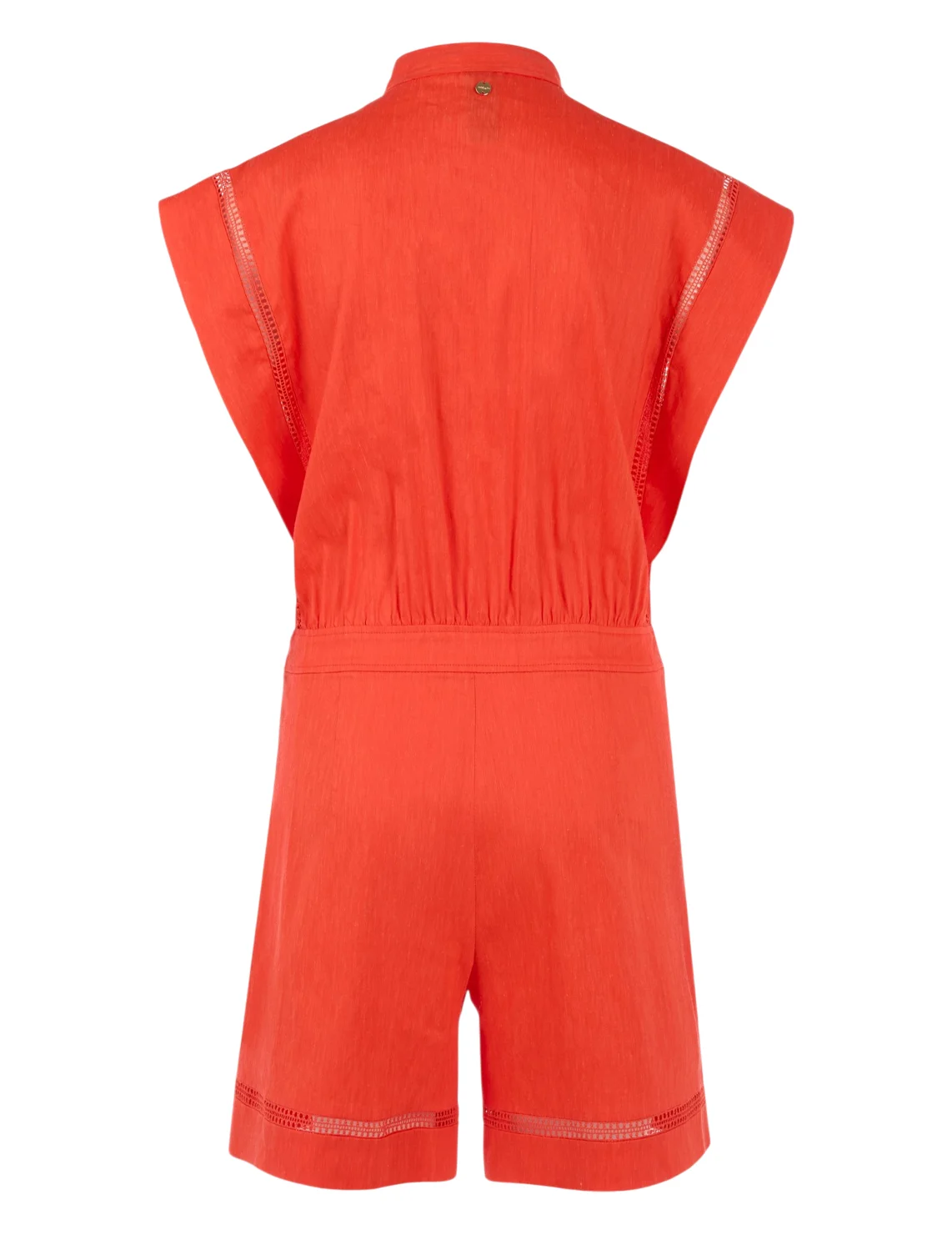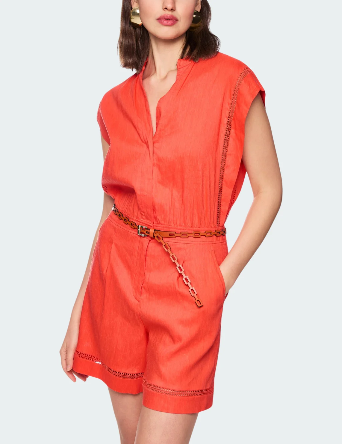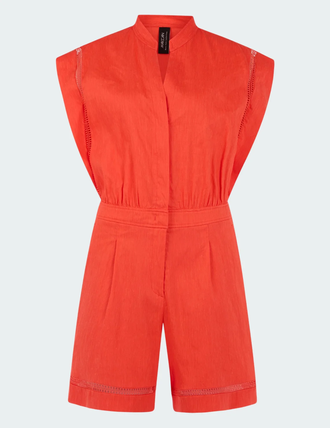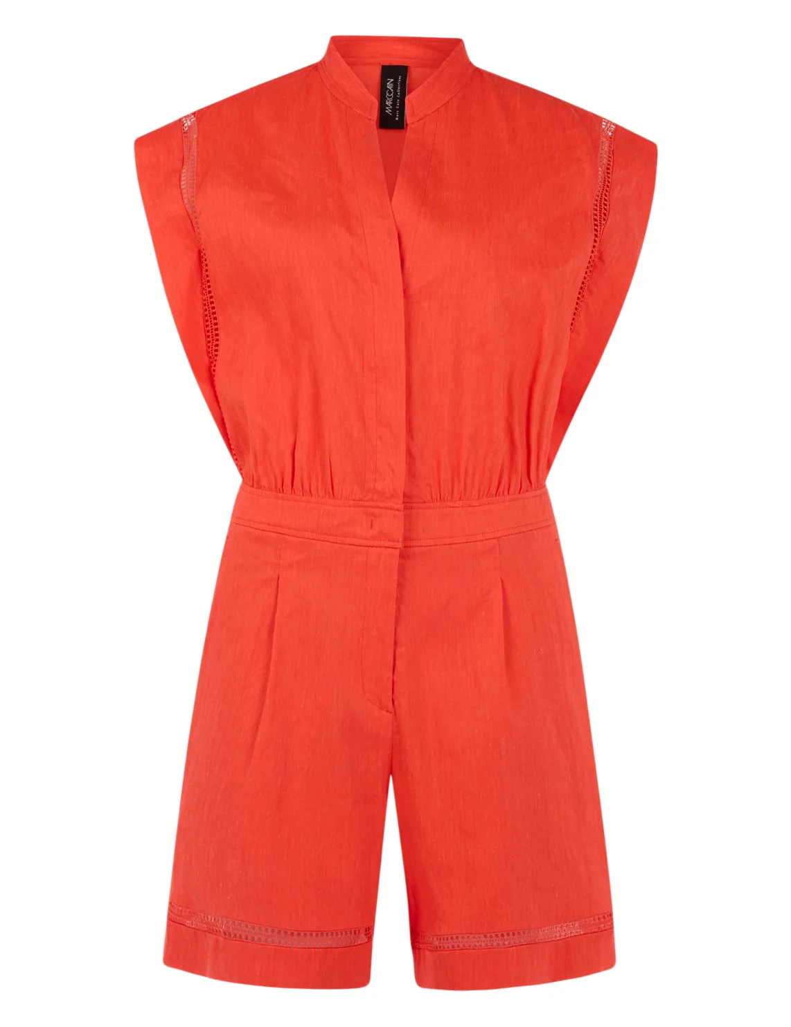 Комбинезон изготовлен из льна, вискозы и эластана. Модель приталенного кроя без рукавов. Имеет небольшой воротник-стойку с V-образным вырезом и планкой на пуговицах, боковые карманы. Застёгивается на скрытую молнию и крючок.