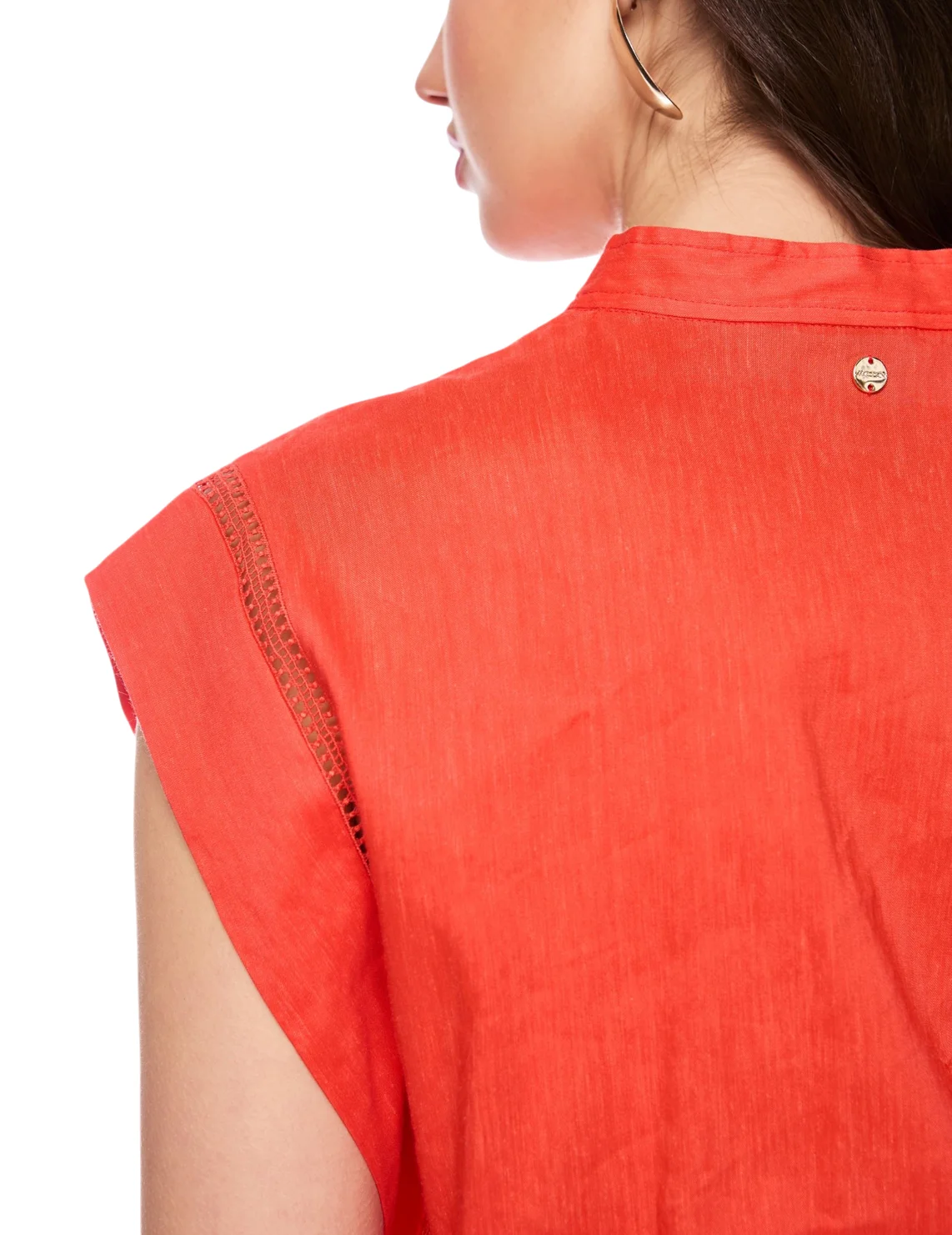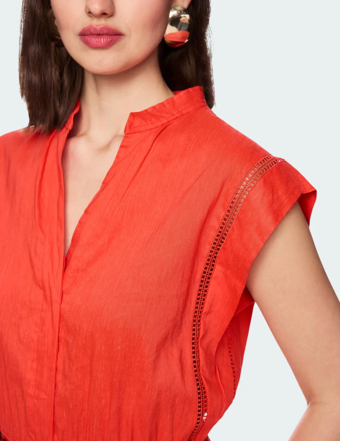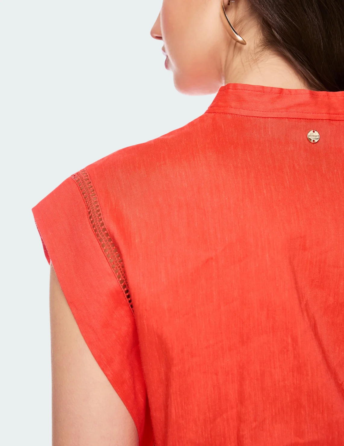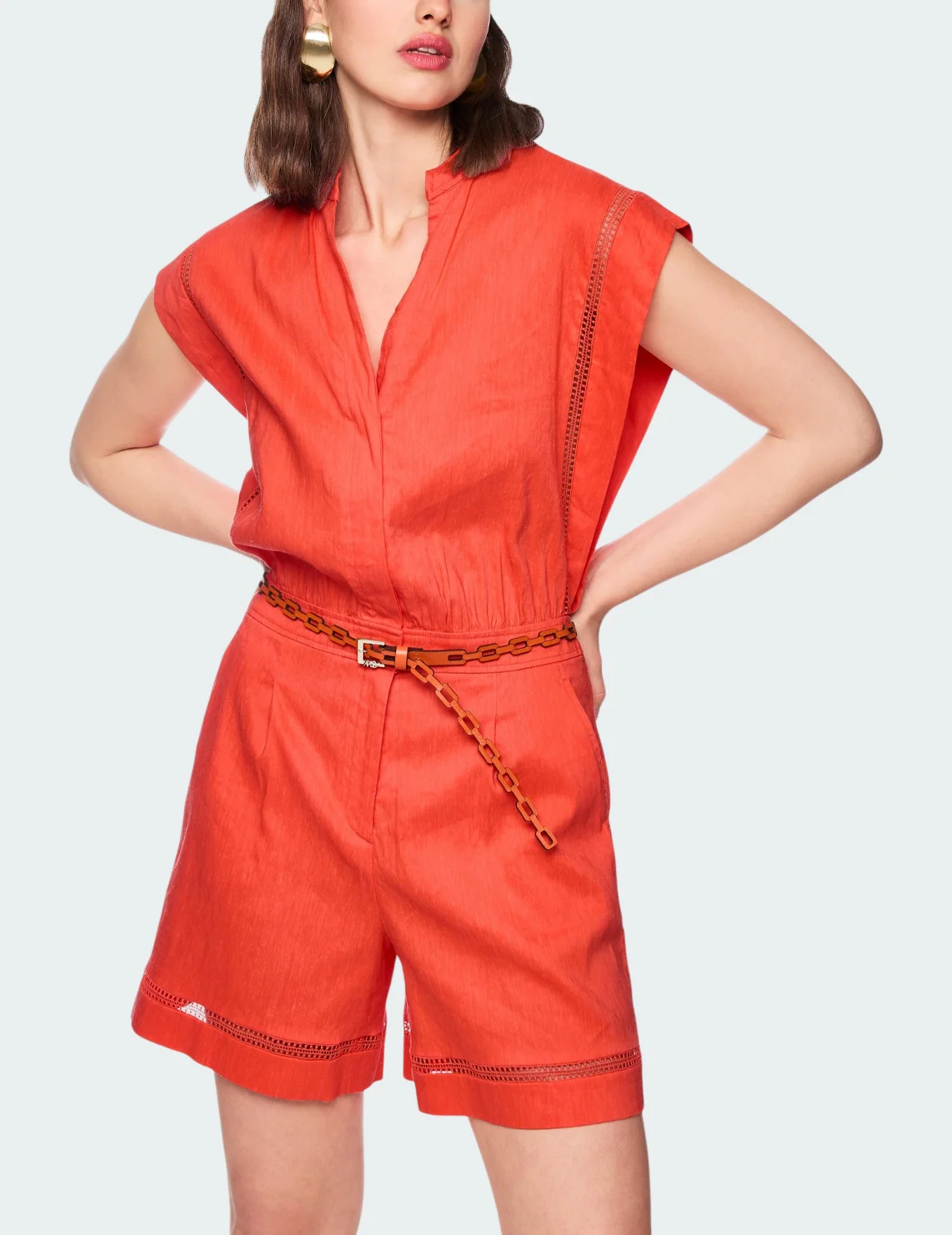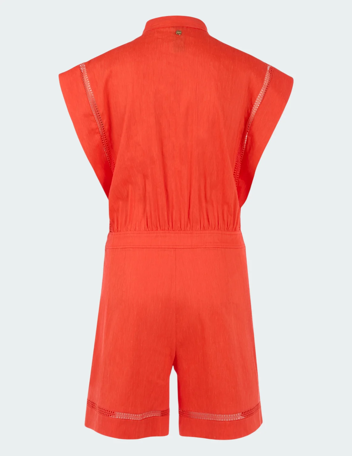 Комбинезон изготовлен из льна, вискозы и эластана. Модель приталенного кроя без рукавов. Имеет небольшой воротник-стойку с V-образным вырезом и планкой на пуговицах, боковые карманы. Застёгивается на скрытую молнию и крючок.