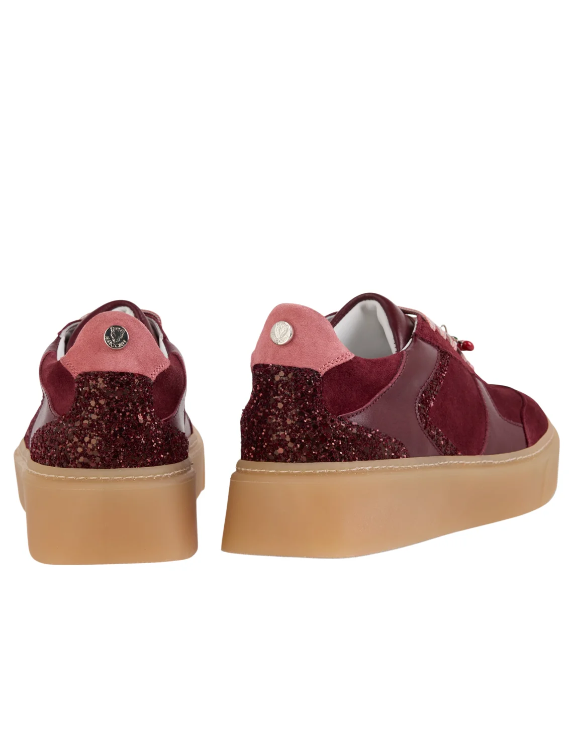 Кроссовки изготовлены из кожи высокого качества. Модель имеет ровную подошву и классическую шнуровку. Декорированы блестящими пайетками.