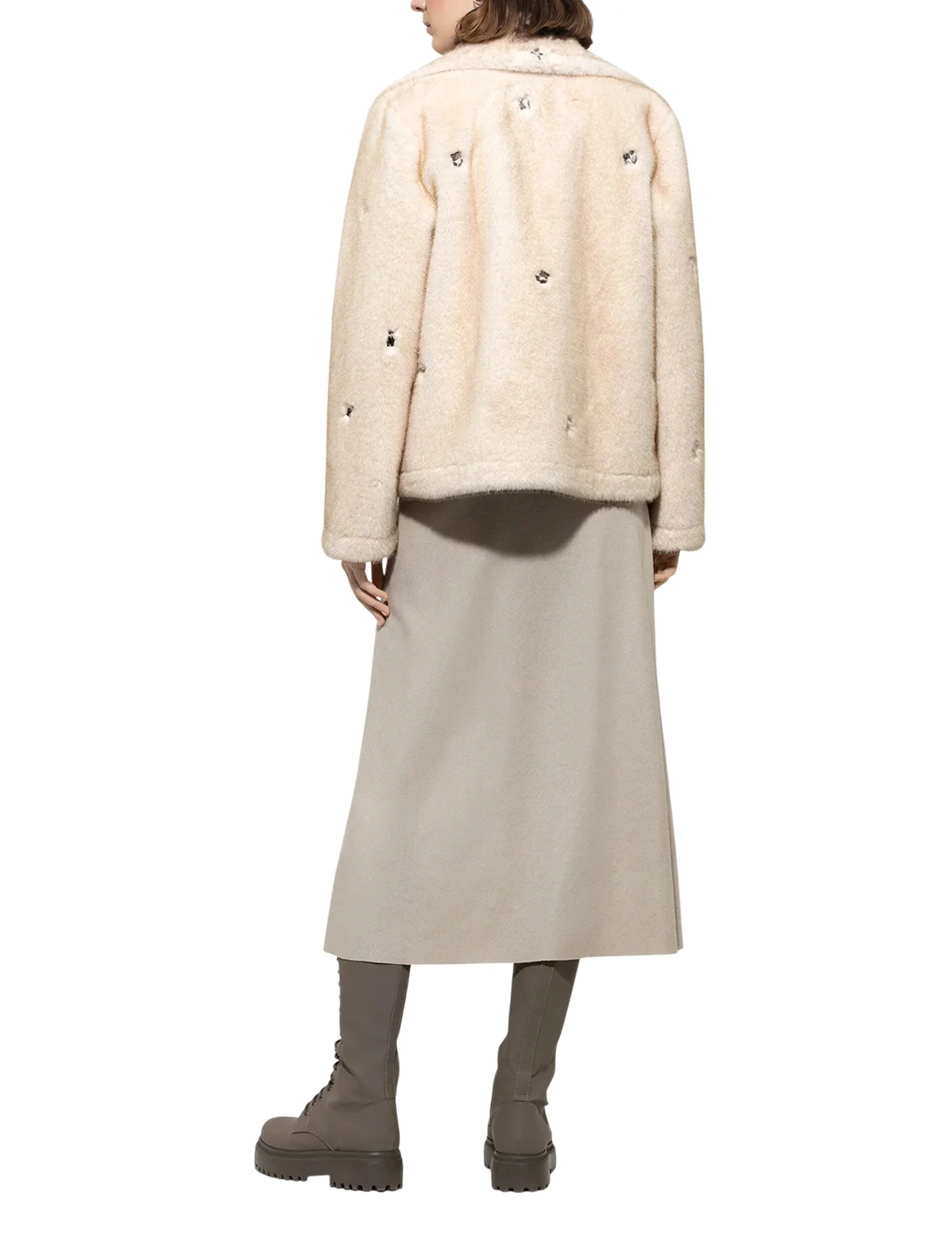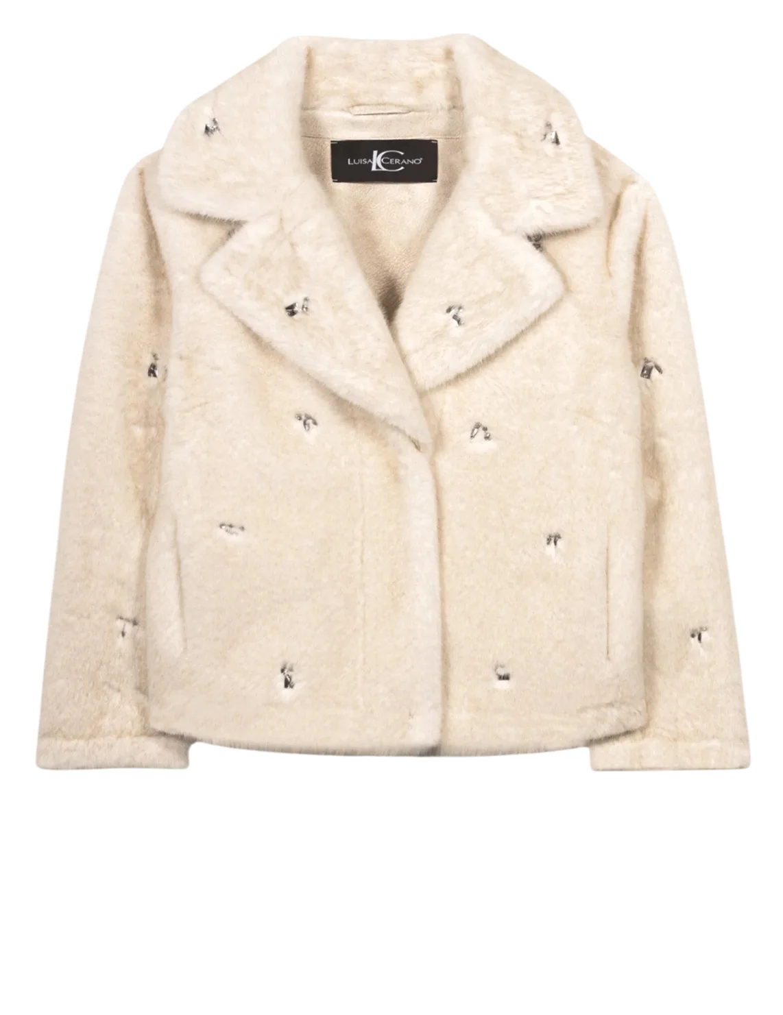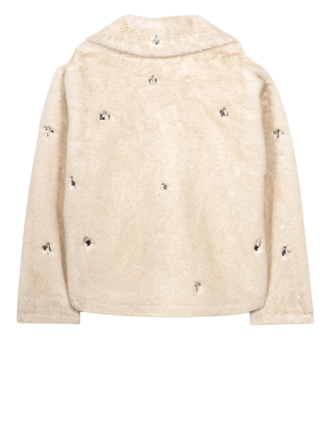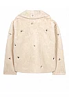 Куртка изготовлена из 100% полиэстера высокого качества. Модель выполнена в свободном крое. Имеет отложной воротник с лацканами, длинные рукава, застежку на кнопках и прорезные карманы. Декорирована стразами.