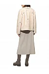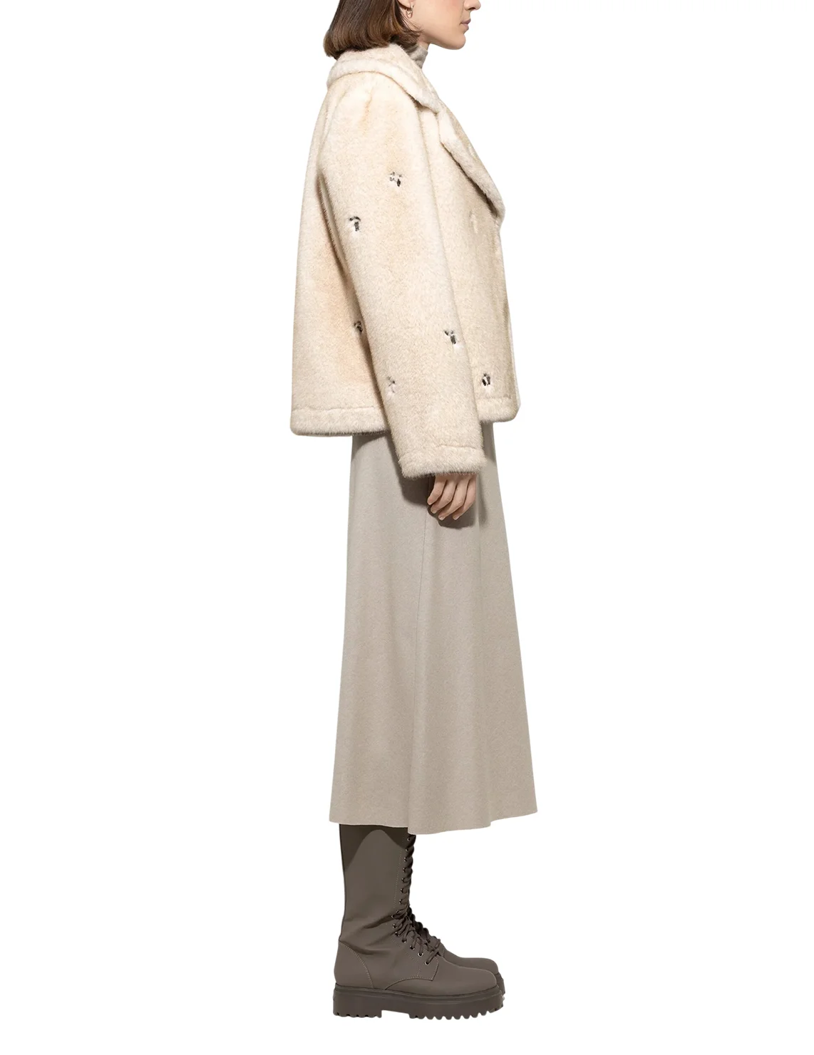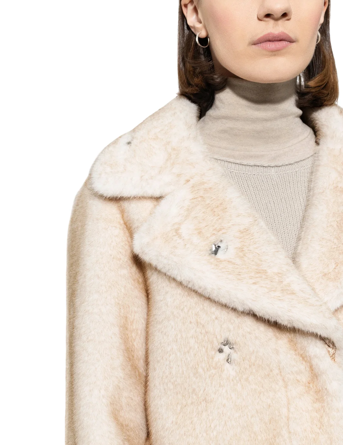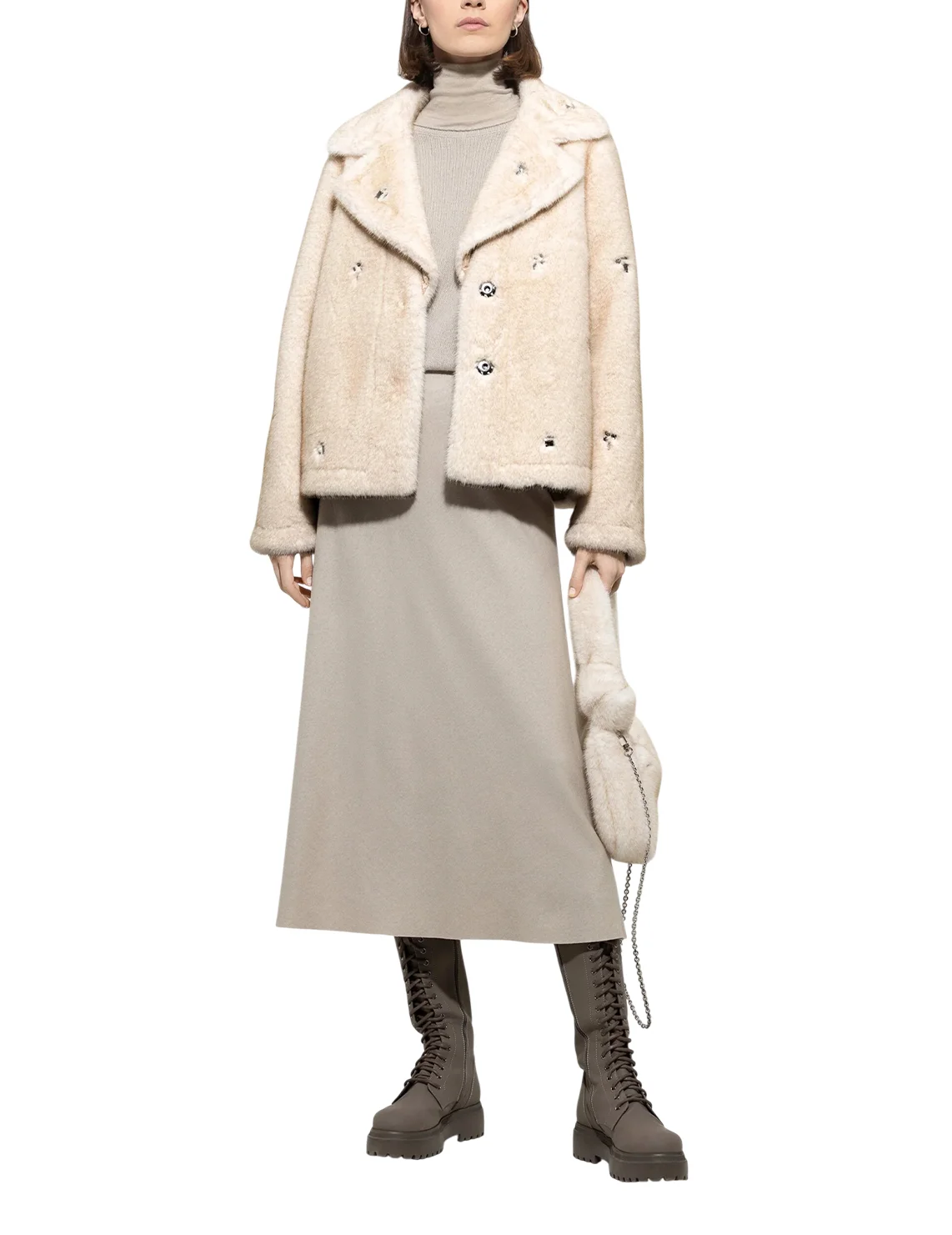Куртка изготовлена из 100% полиэстера высокого качества. Модель выполнена в свободном крое. Имеет отложной воротник с лацканами, длинные рукава, застежку на кнопках и прорезные карманы. Декорирована стразами.