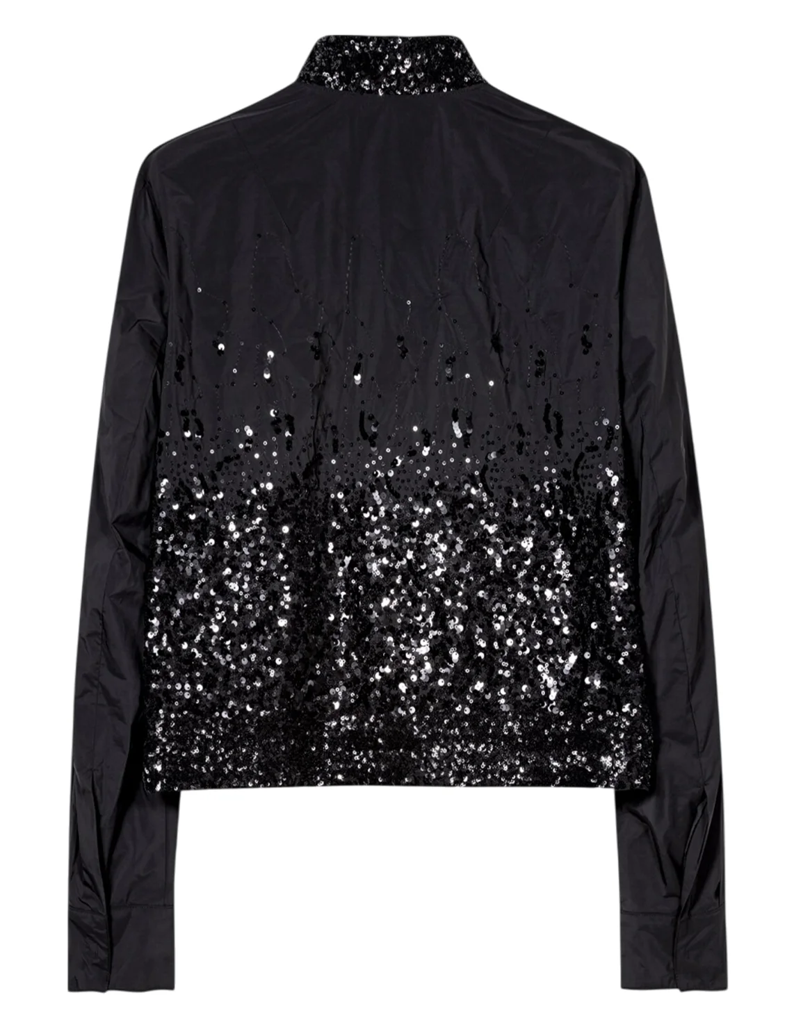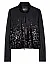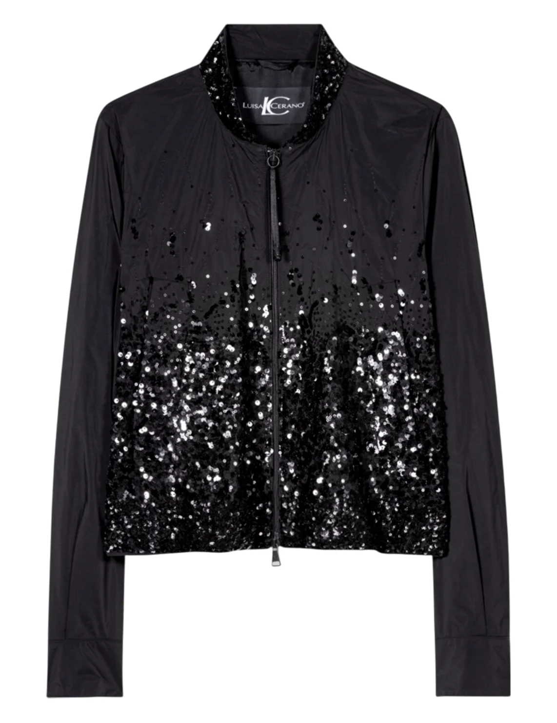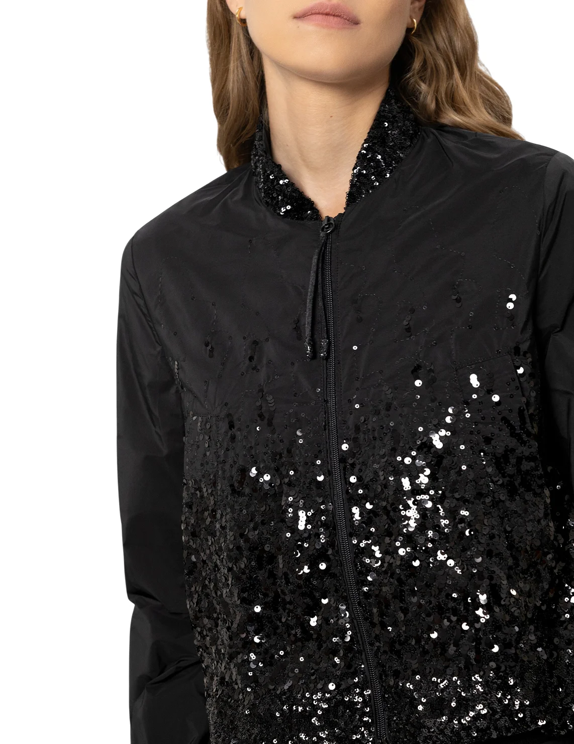 Куртка изготовлена из 100% полиэстера, подкладка из вискозы и полиэстера. Модель выполнена в прямом крое. Имеет воротник-стойку, длинные рукава с манжетами на кнопках и двустороннюю застежку-молнию. Декорирована пайетками.