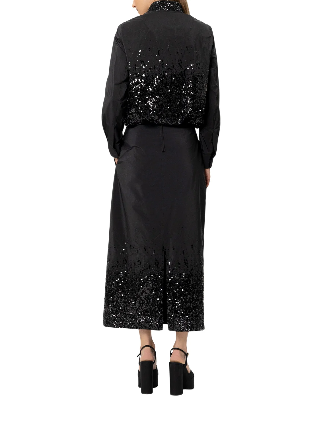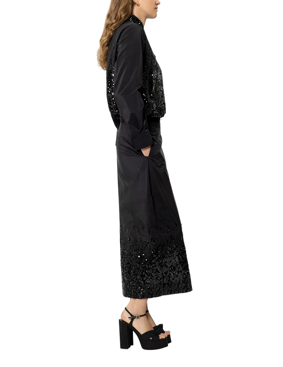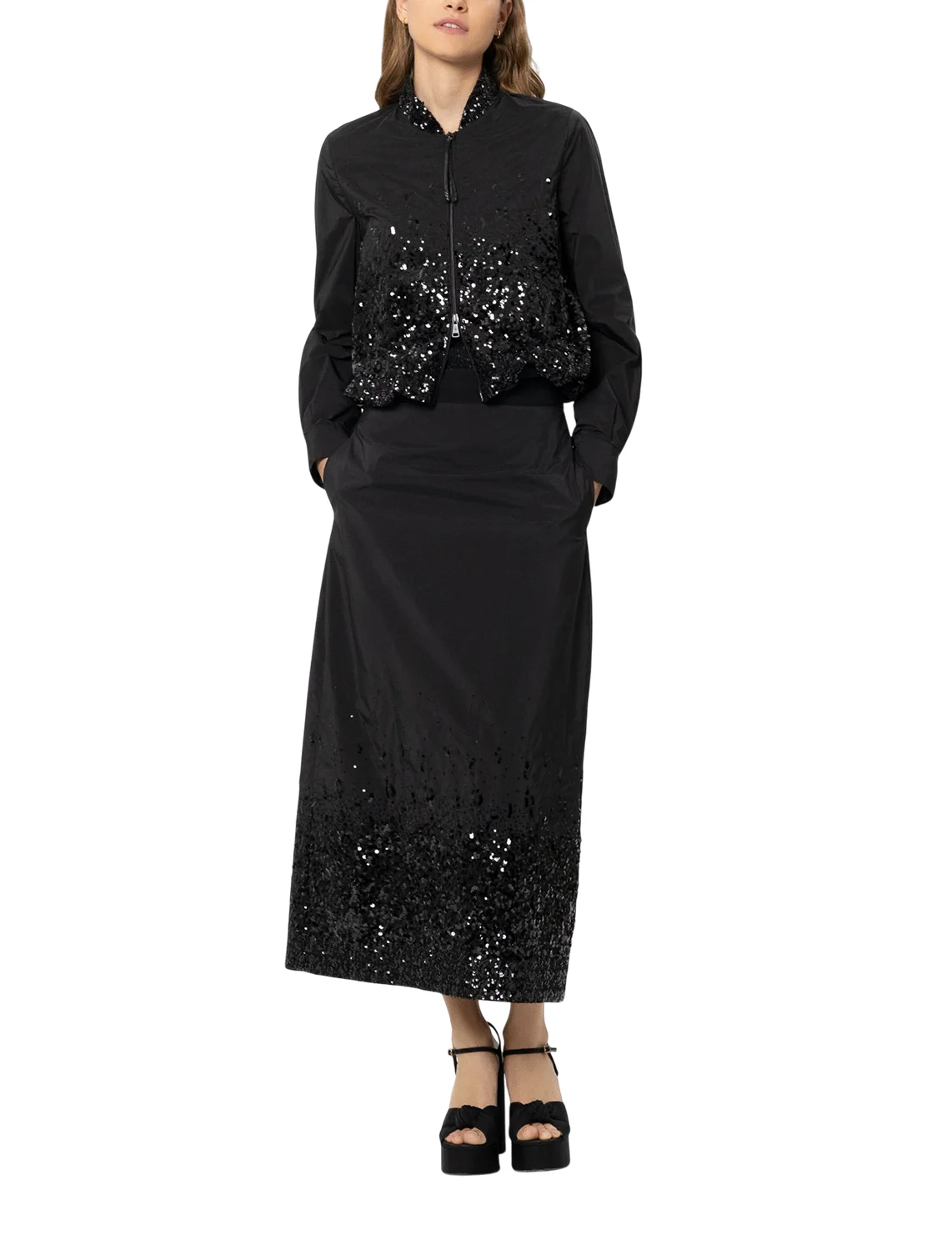 Куртка изготовлена из 100% полиэстера, подкладка из вискозы и полиэстера. Модель выполнена в прямом крое. Имеет воротник-стойку, длинные рукава с манжетами на кнопках и двустороннюю застежку-молнию. Декорирована пайетками.