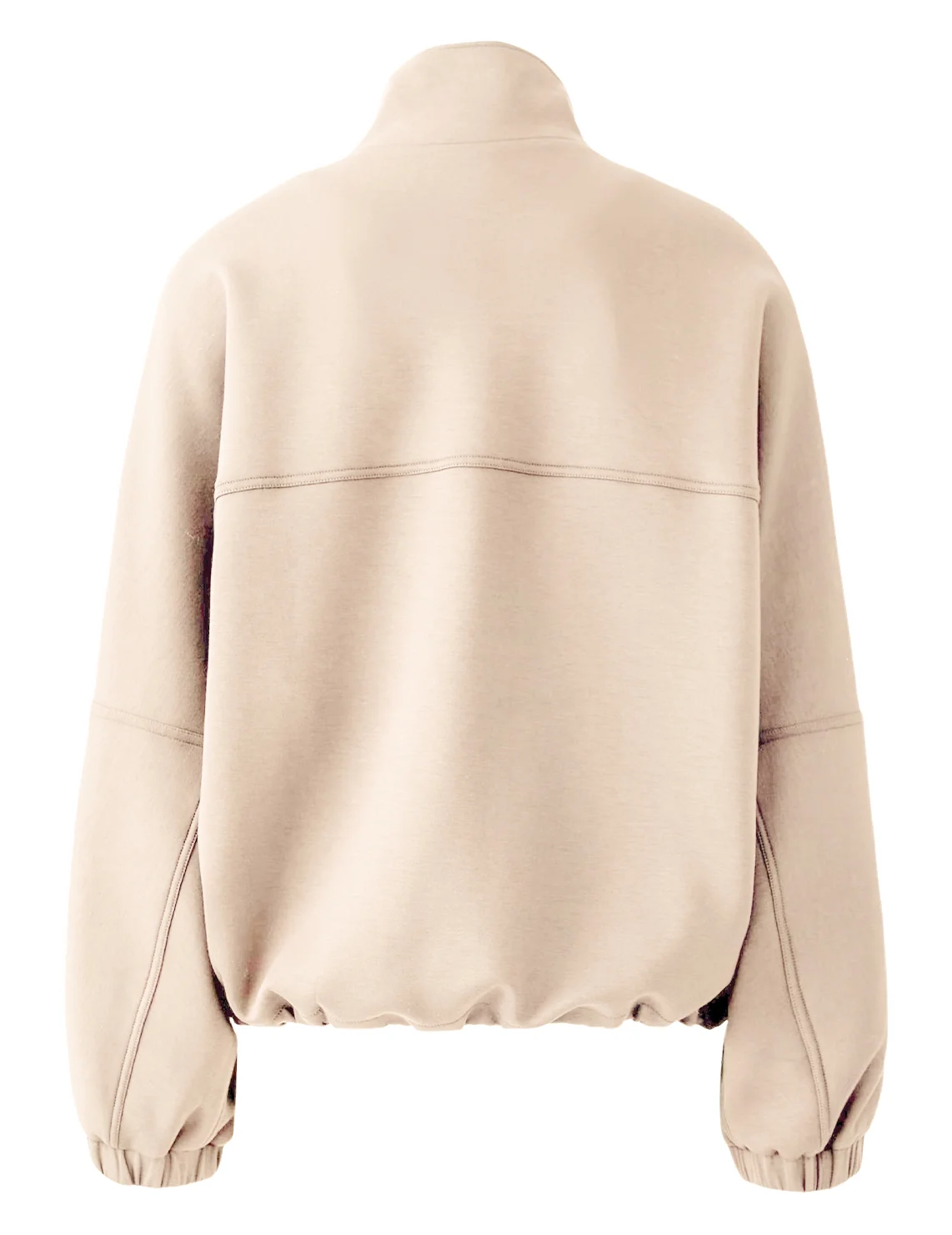 Куртка изготовлена из полиэстера, вискозы и эластана. Модель выполнена в свободном крое. Имеет воротник-стойку, передние накладные карманы с клапанами, длинные рукава с манжетами, кулиску по низу изделия, застежку на молнии и кнопках.