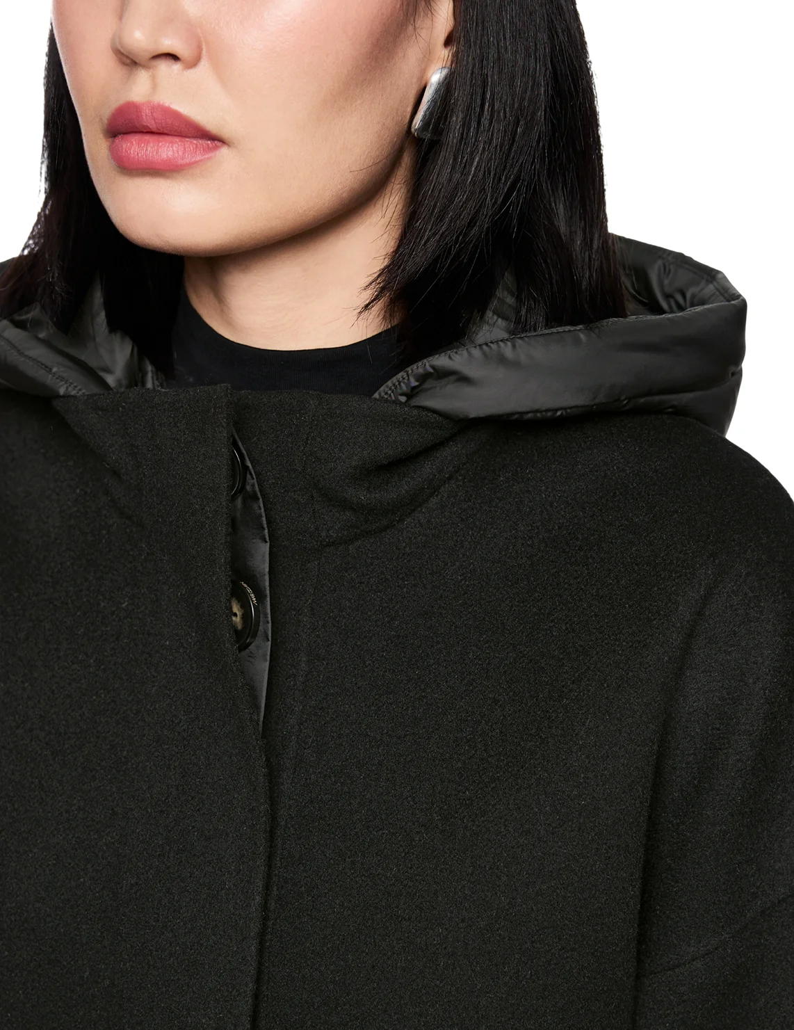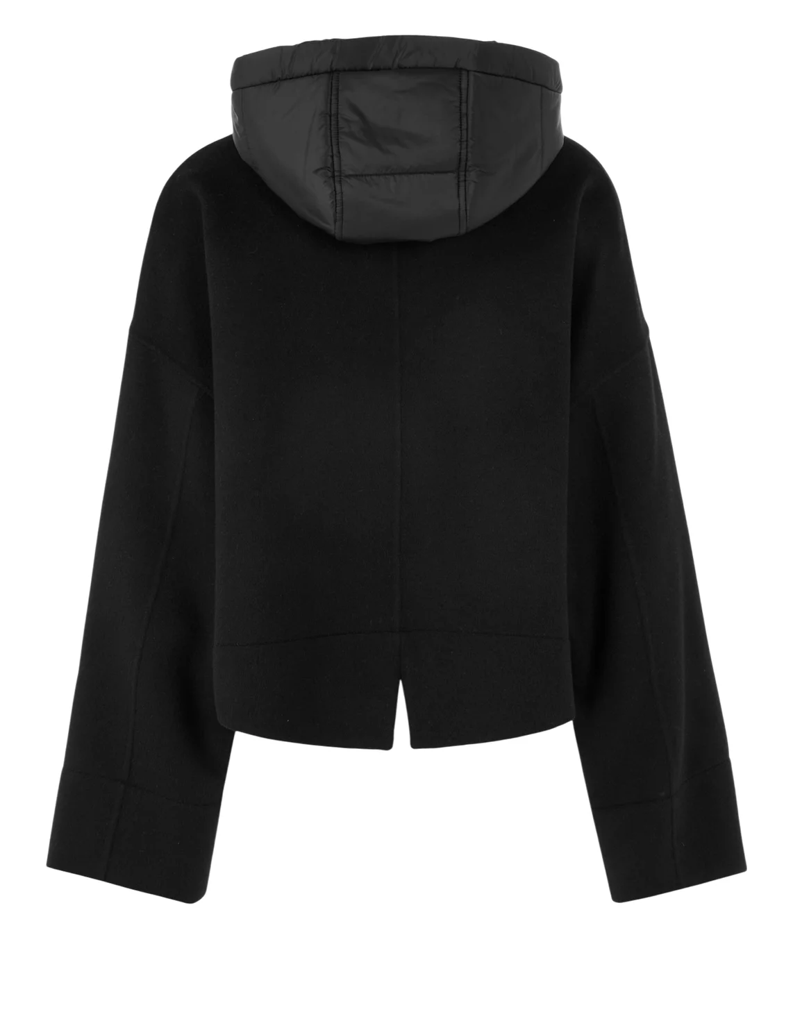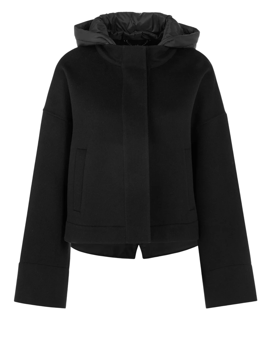 Куртка изготовлена из 100% шерсти, капюшон из 100% полиэстера. Модель выполнена в свободном крое. Имеет воротник-стойку, съемный капюшон, прорезные карманы, разрез сзади, заниженную плечевую линию, длинные рукава и скрытую застежку на пуговицах.
