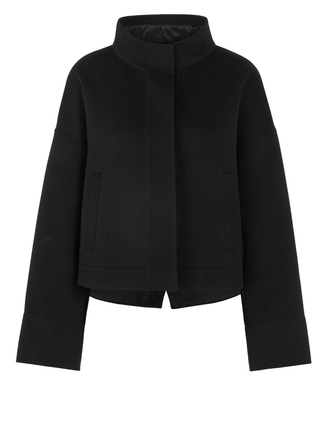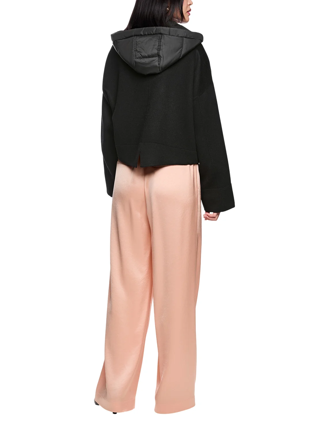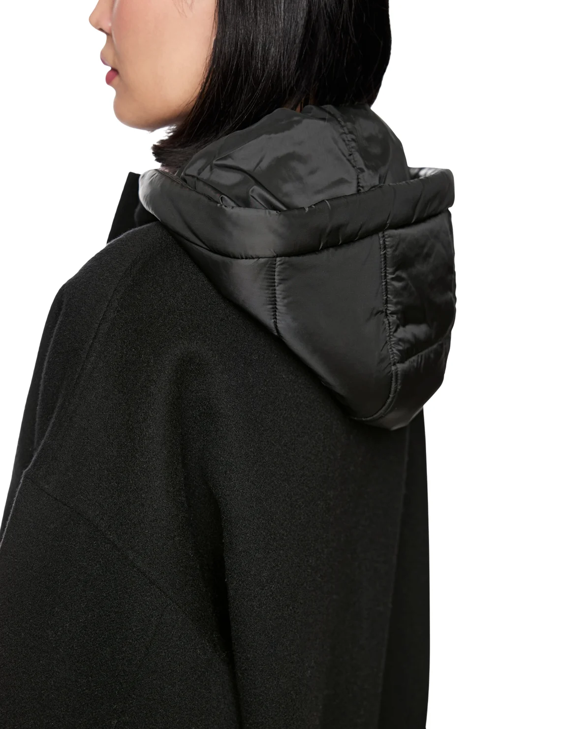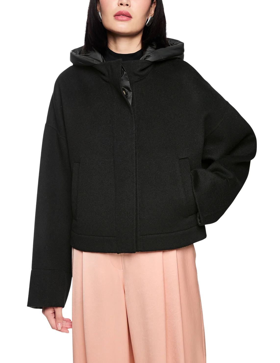 Куртка изготовлена из 100% шерсти, капюшон из 100% полиэстера. Модель выполнена в свободном крое. Имеет воротник-стойку, съемный капюшон, прорезные карманы, разрез сзади, заниженную плечевую линию, длинные рукава и скрытую застежку на пуговицах.