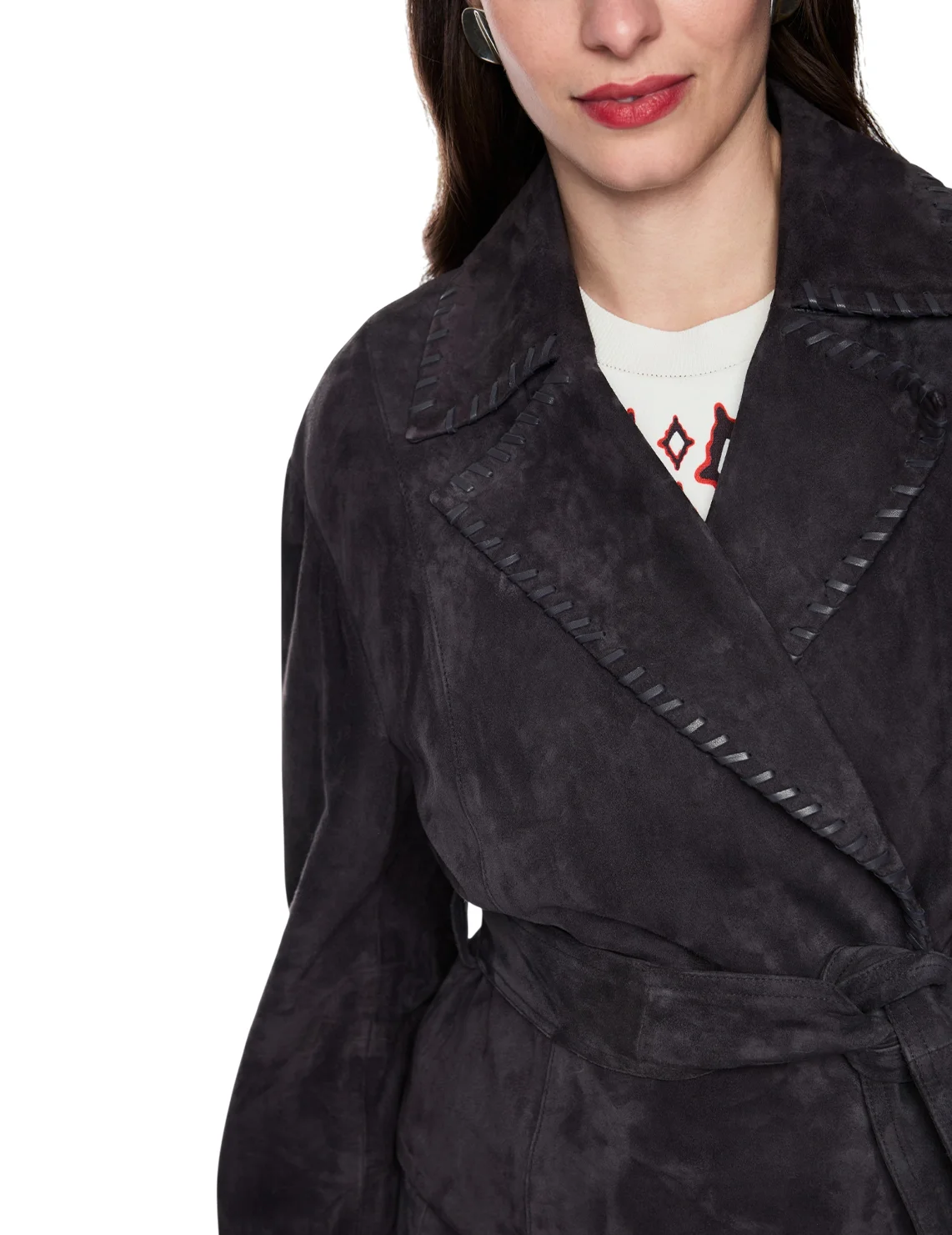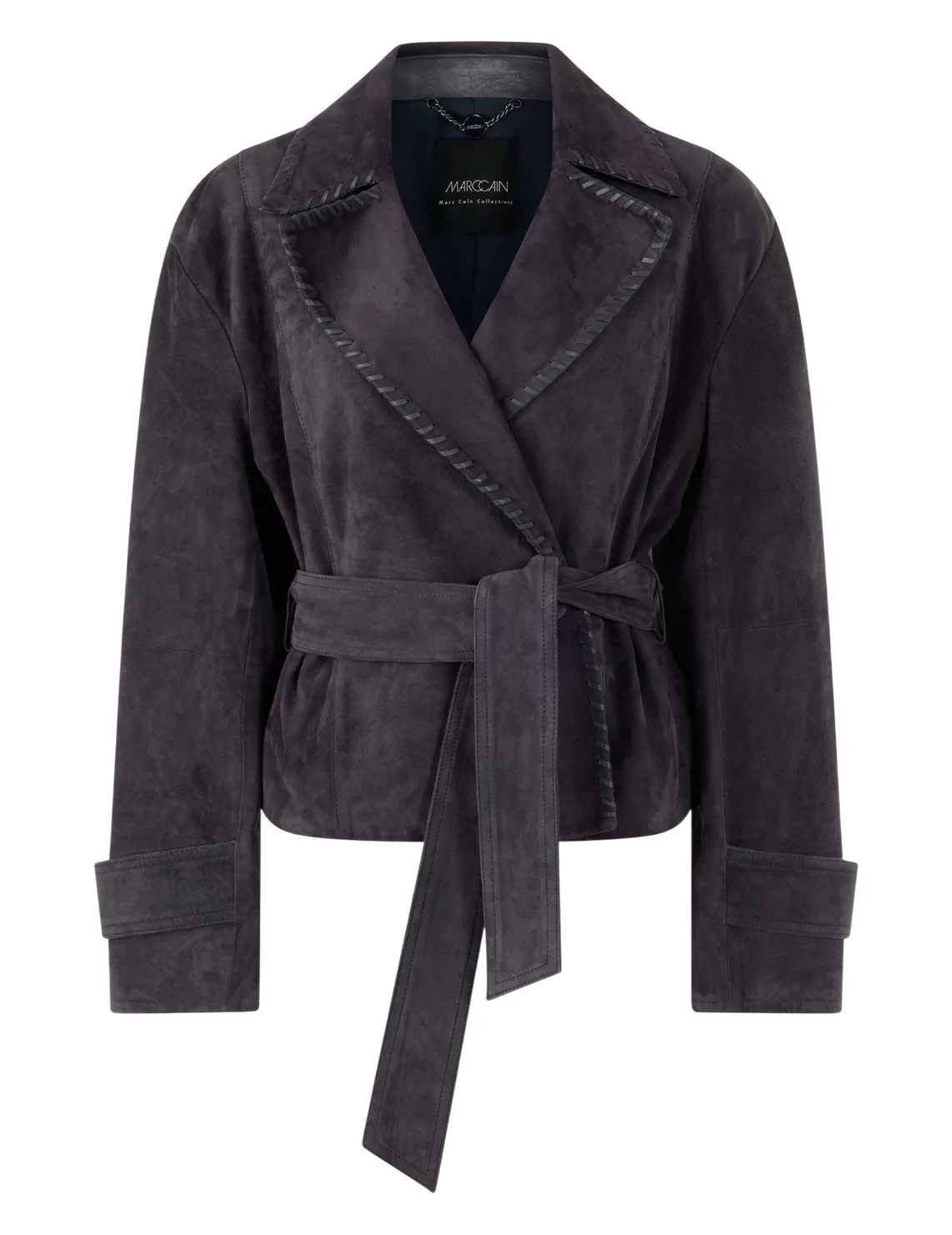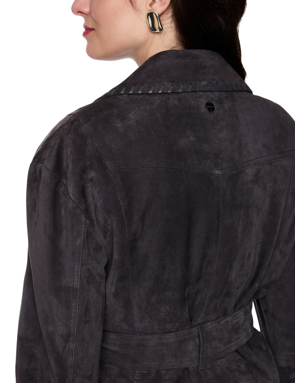 Куртка изготовлена из натуральной кожи высокого качества, подкладка из полиэстера и эластомультиэстера. Модель выполнена в прямом крое. Имеет отложной воротник с лацканами, пояс в тон, длинные рукава и застежку на кнопки. Оформлена декоративным швами.