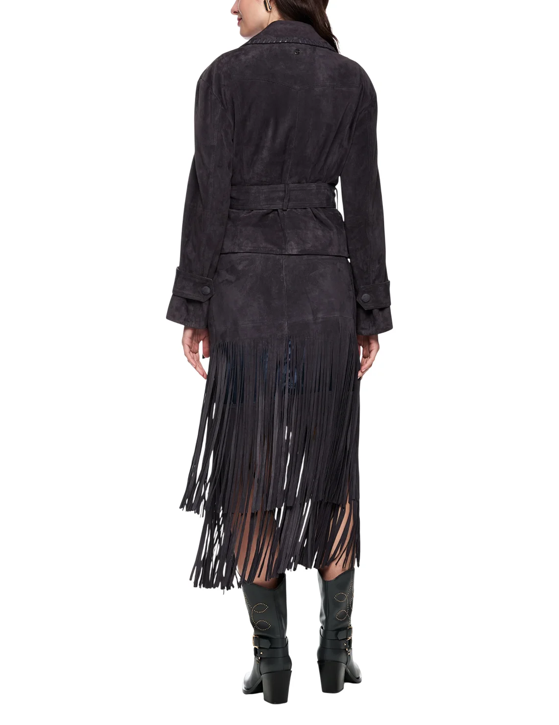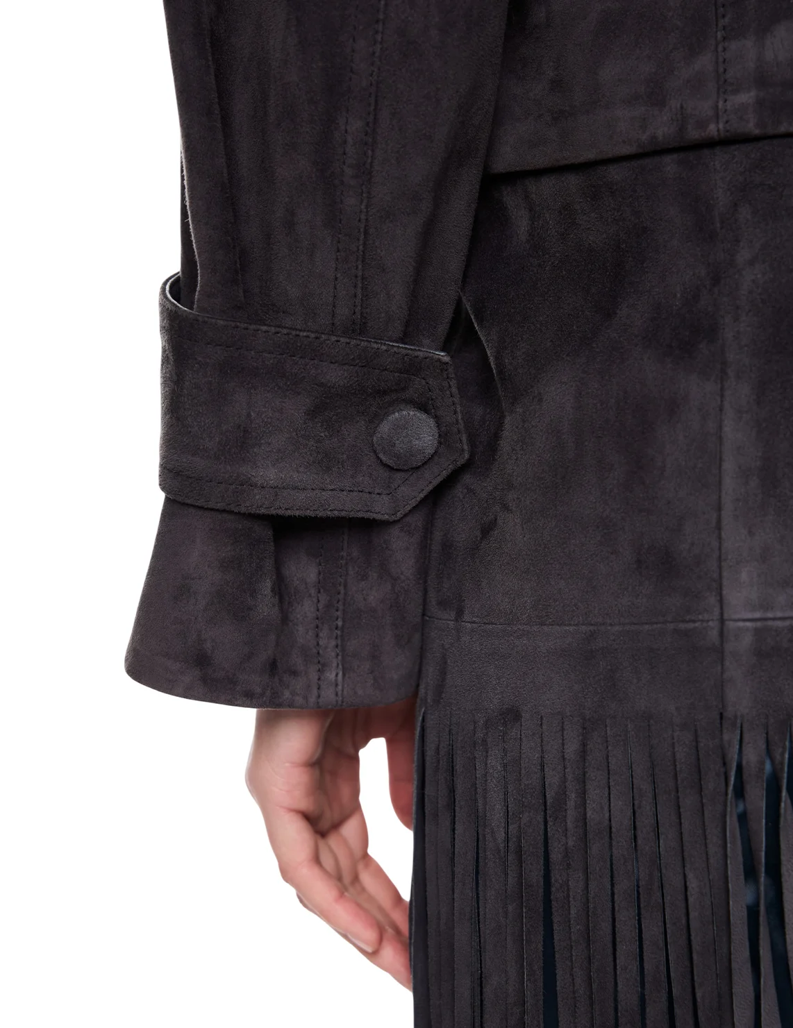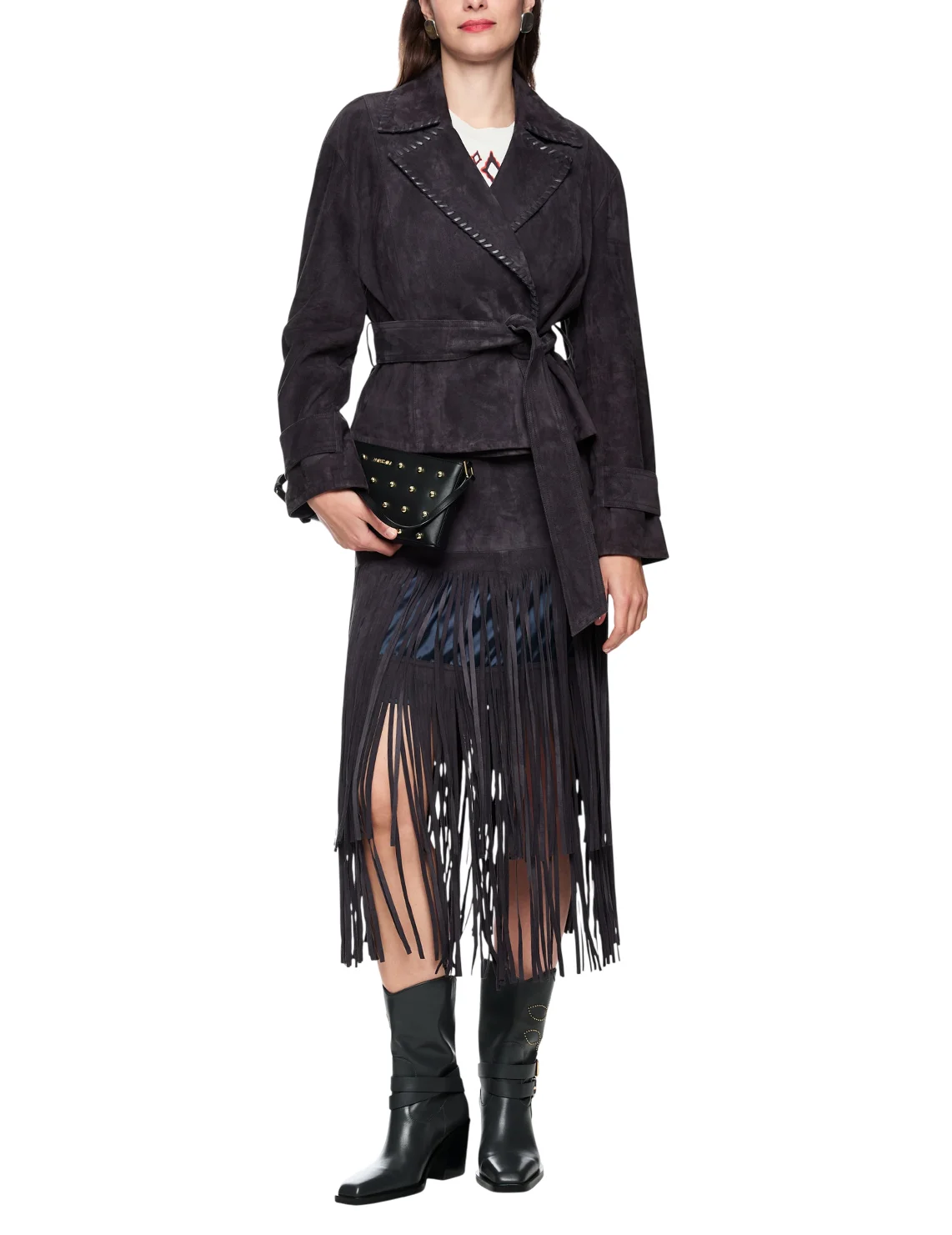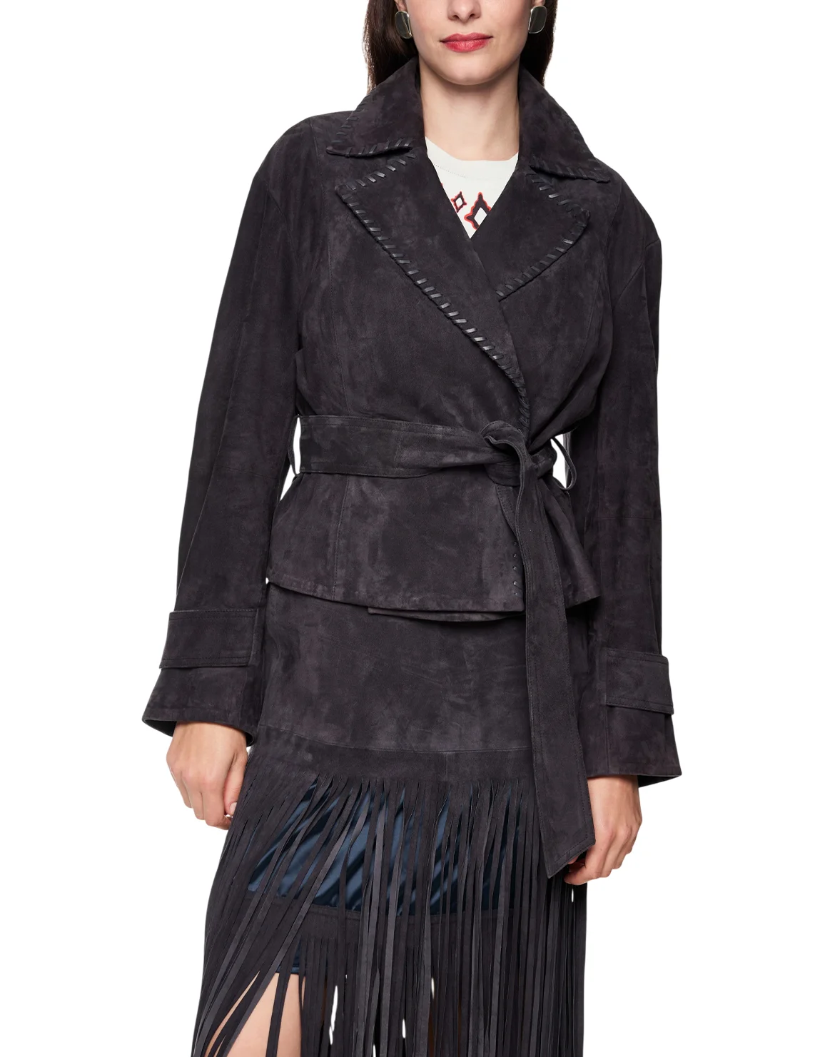 Куртка изготовлена из натуральной кожи высокого качества, подкладка из полиэстера и эластомультиэстера. Модель выполнена в прямом крое. Имеет отложной воротник с лацканами, пояс в тон, длинные рукава и застежку на кнопки. Оформлена декоративным швами.
