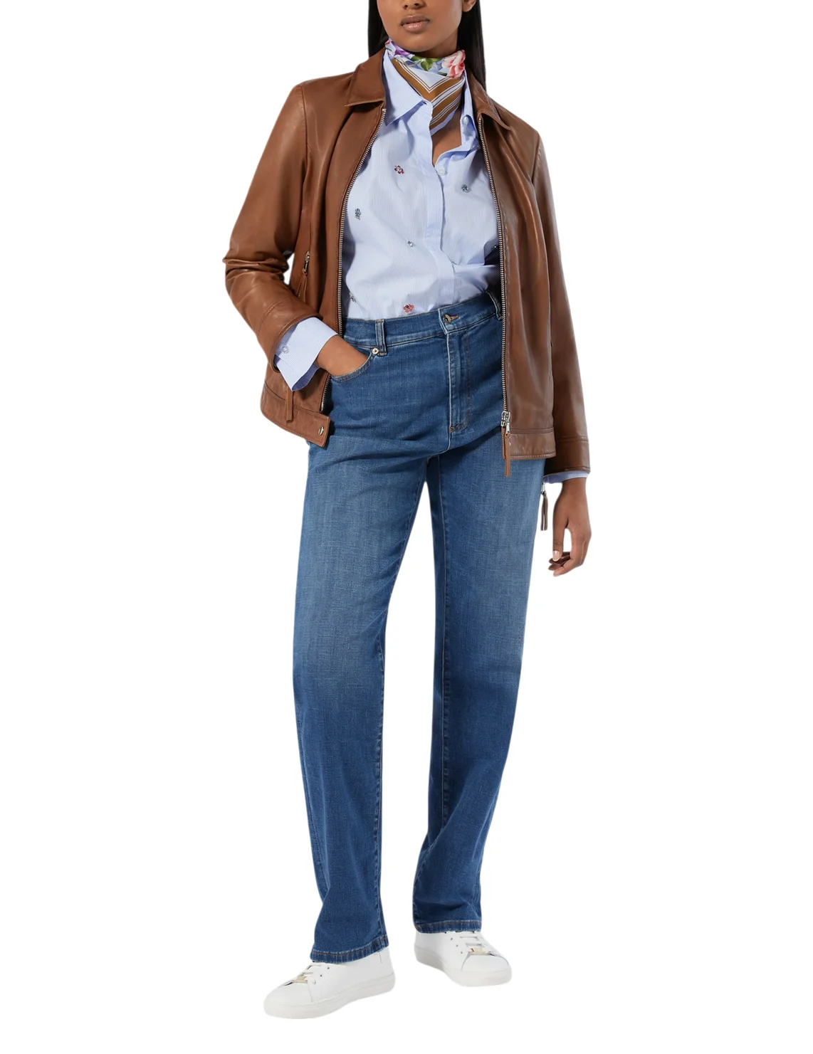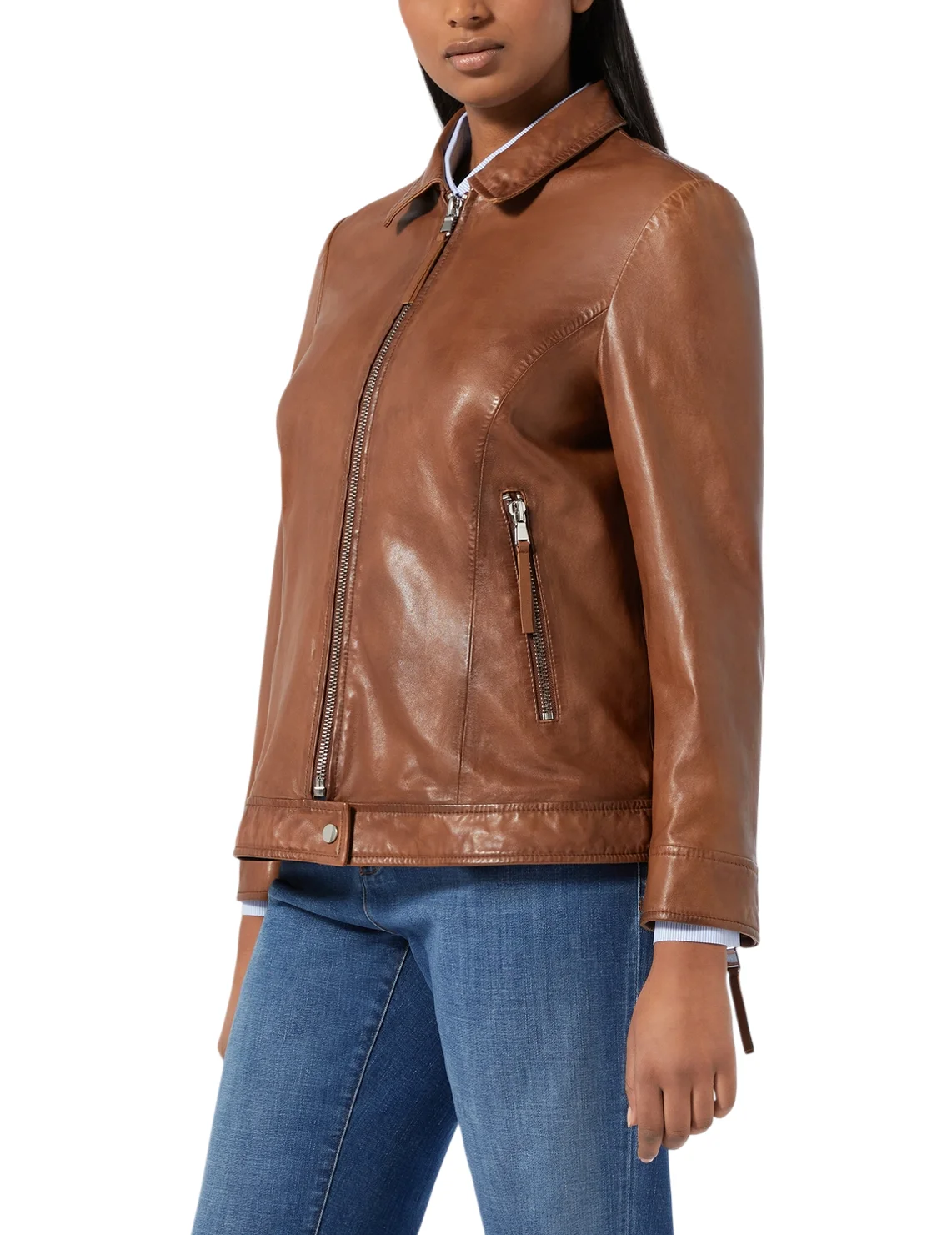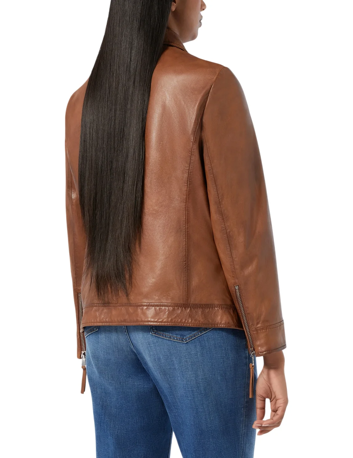 Куртка изготовлена из 100% кожи высокого качества, подкладка из полиэстера. Модель выполнена в прямом крое. Имеет отложной воротник, длинные рукава с манжетами и змейками сзади, застежку-молнию с кнопкой и боковые прорезные карманы.