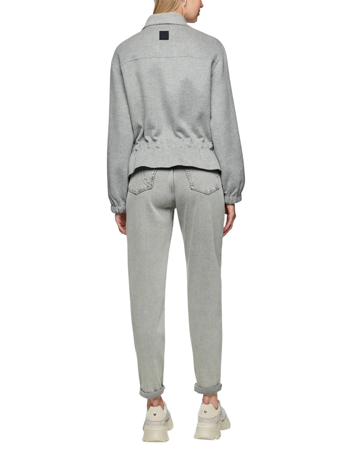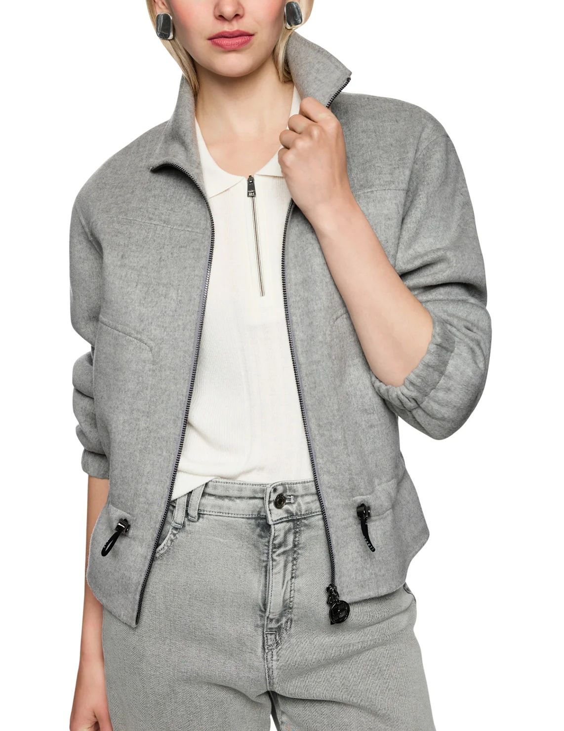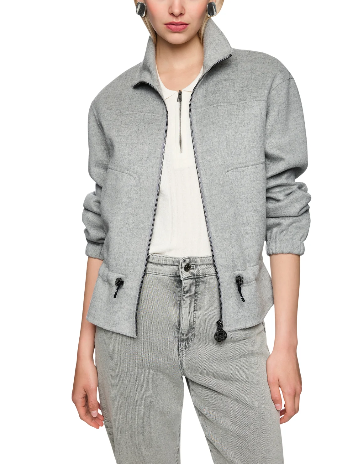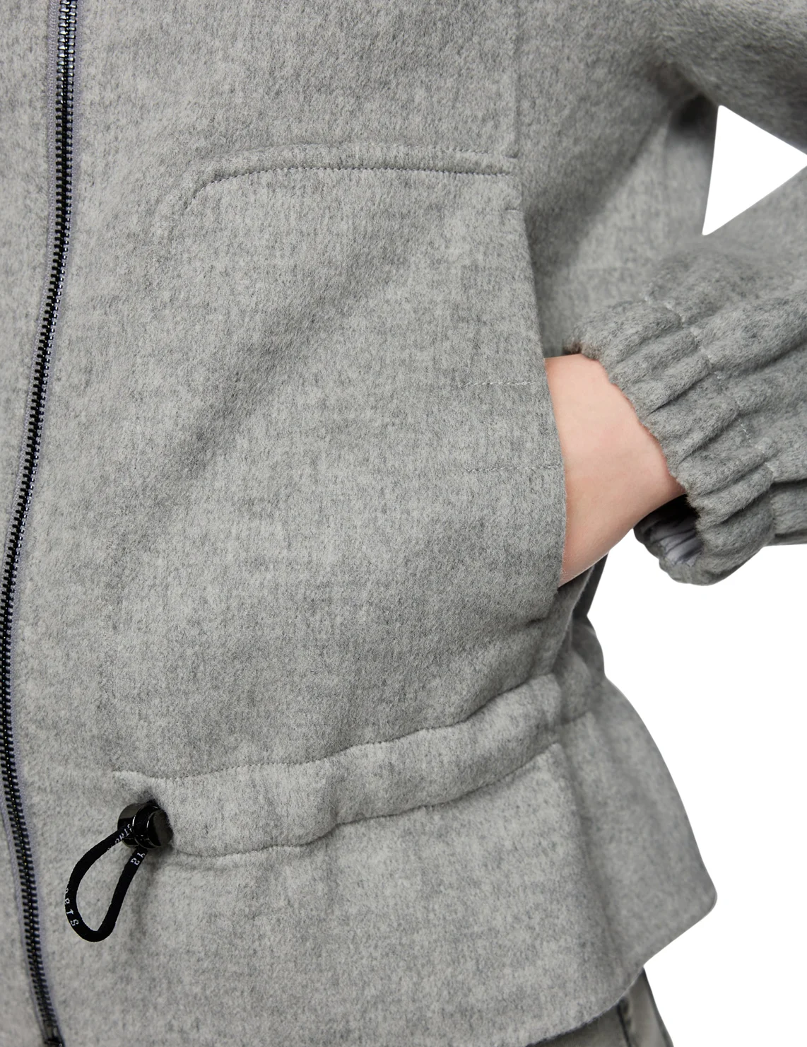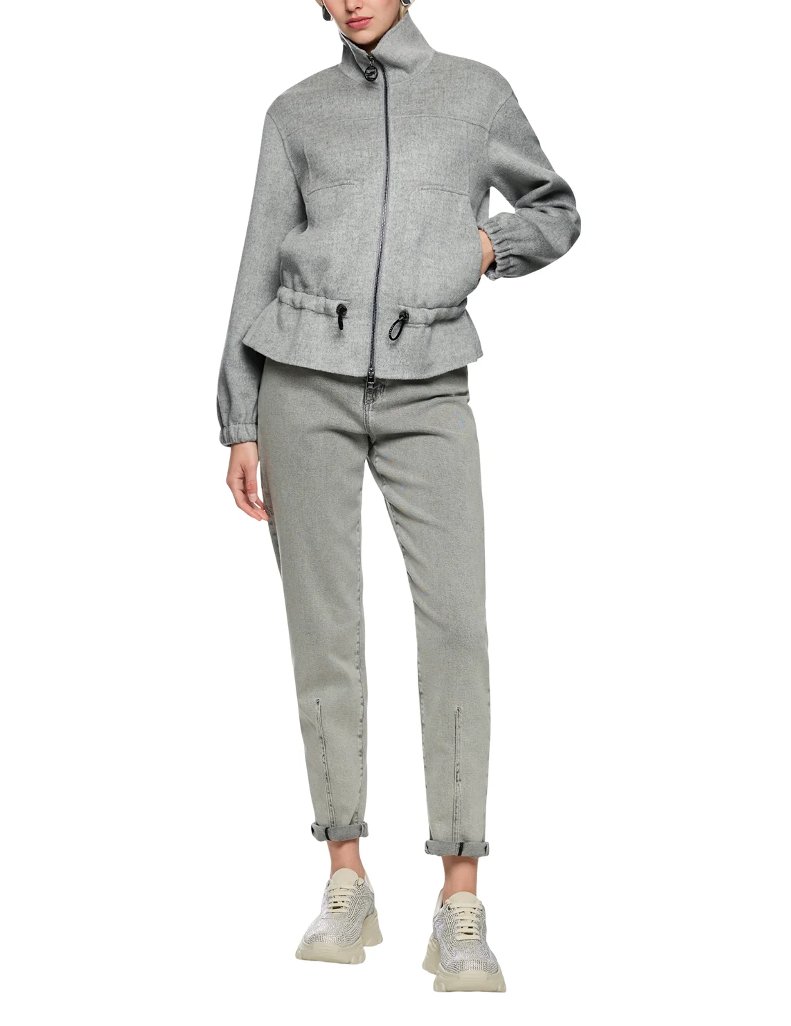 Куртка изготовлена из шерсти и полиамида. Модель выполнена в прямом крое. Имеет воротник-стойку, кулиску, накладные карманы, длинные рукава с манжетами и двустороннюю застежку-молнию.