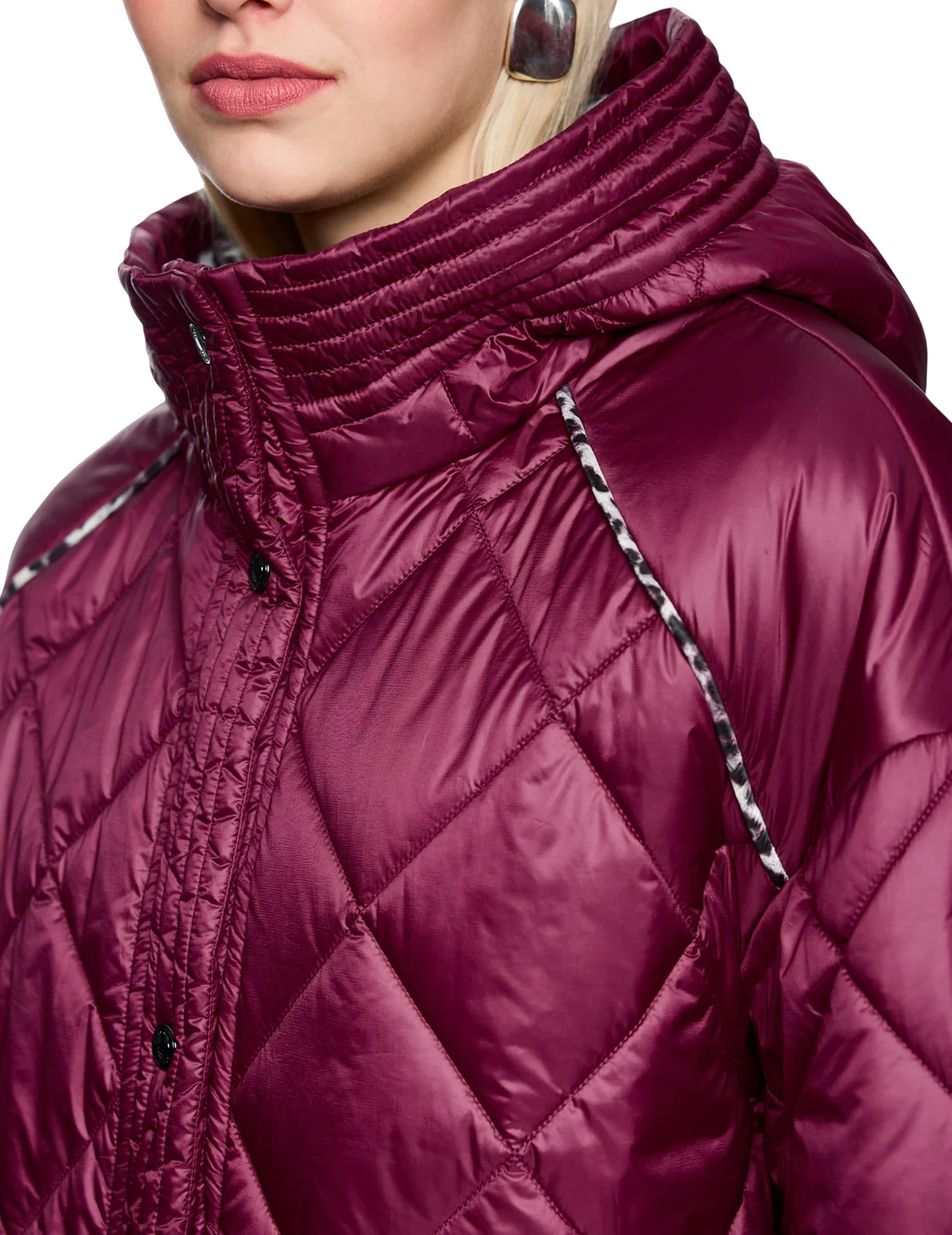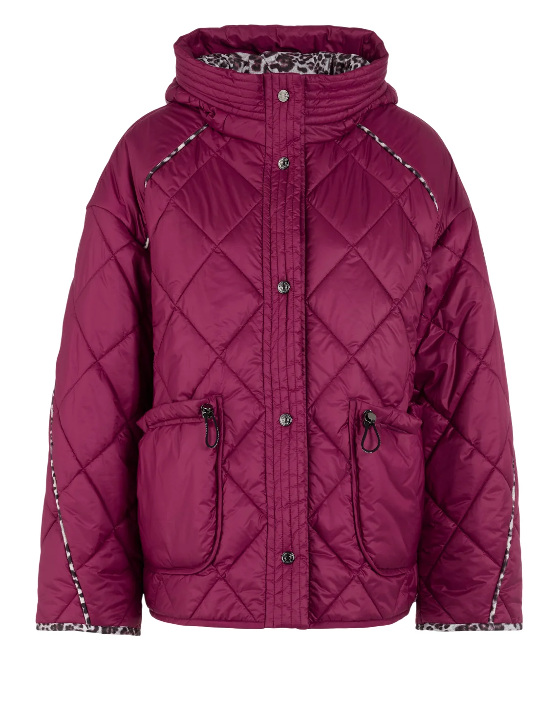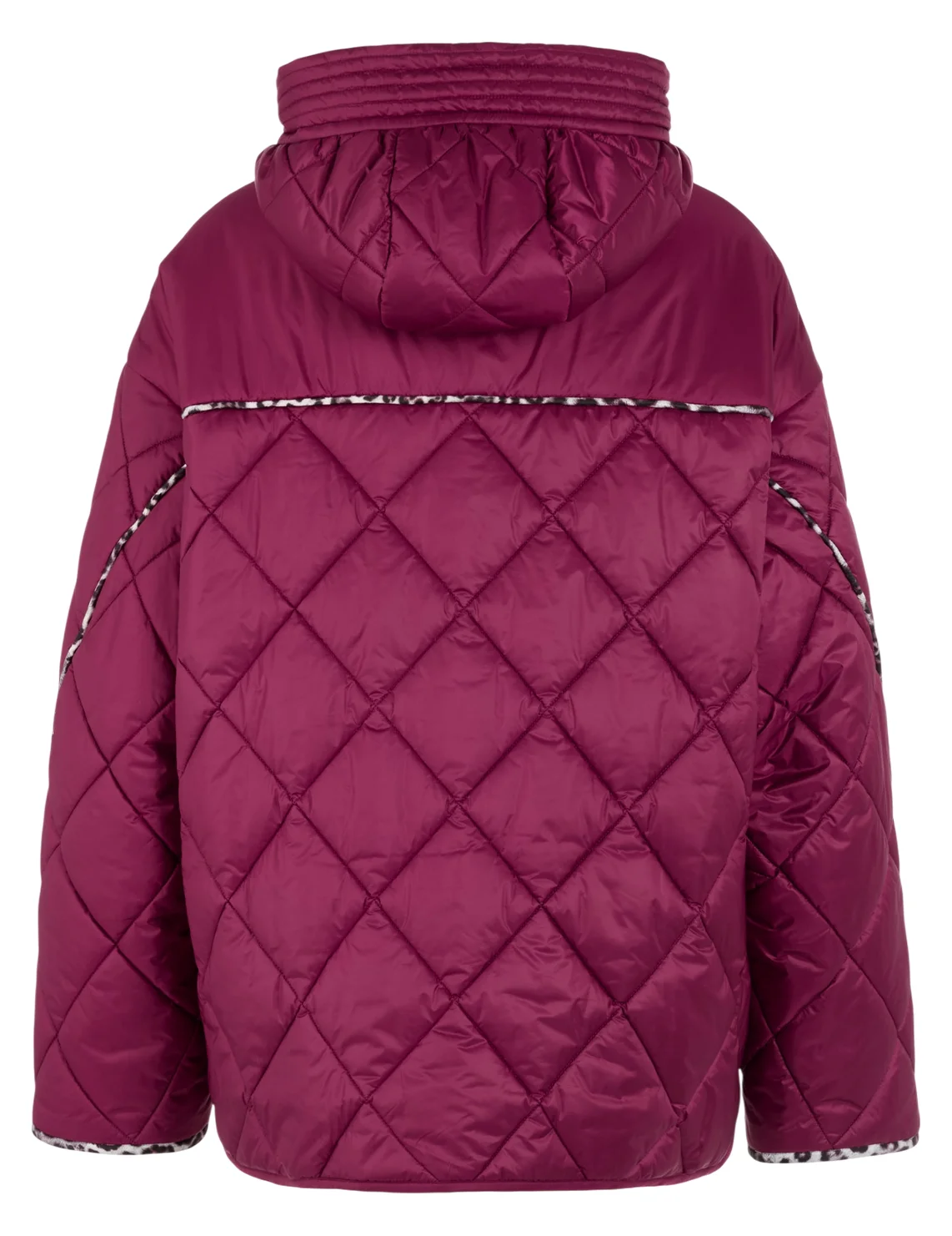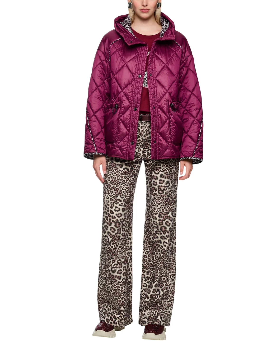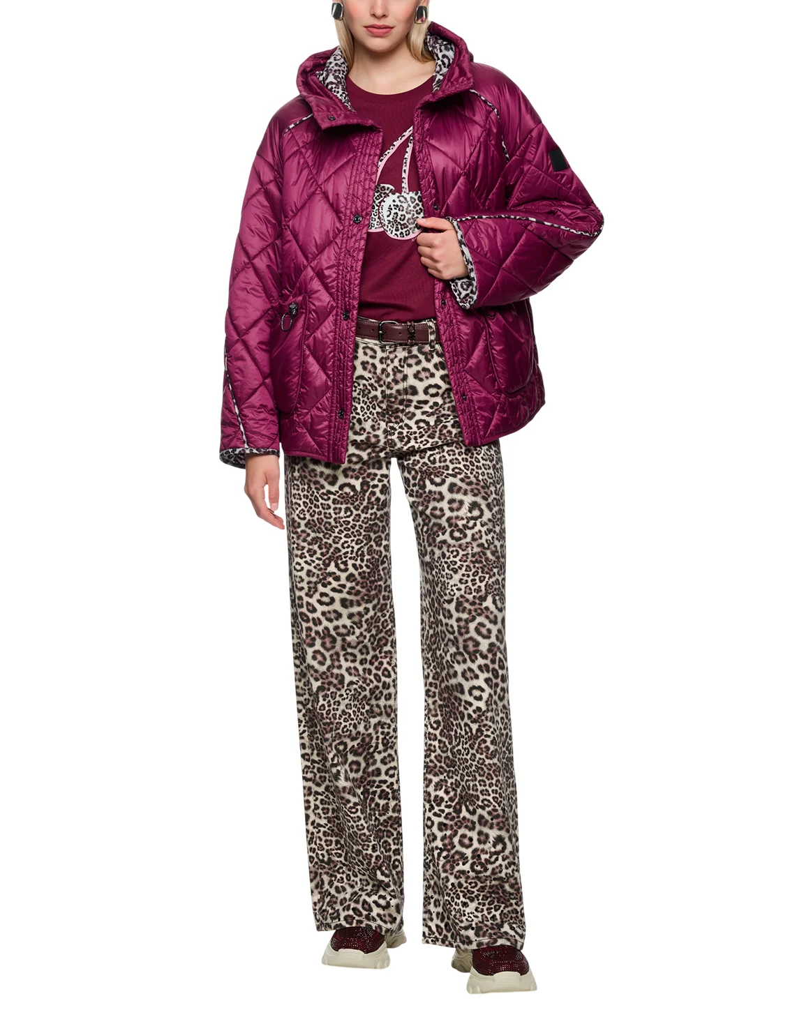 Куртка изготовлена из 100% полиэстера, наполнитель и подкладка также из полиэстера. Модель выполнена в свободном крое. Имеет воротник-стойку, капюшон, накладные карманы с кулисками, длинные рукава и застежку на кнопках. Декорирована вставками с анималистичным принтом.