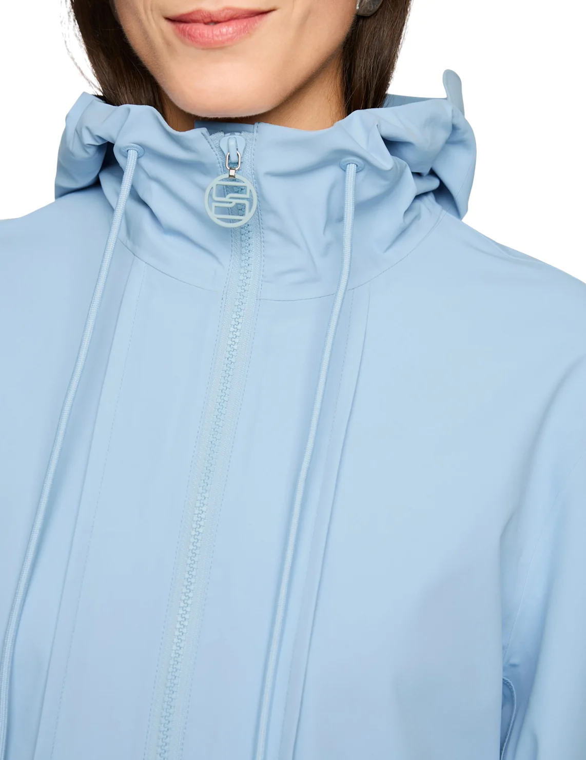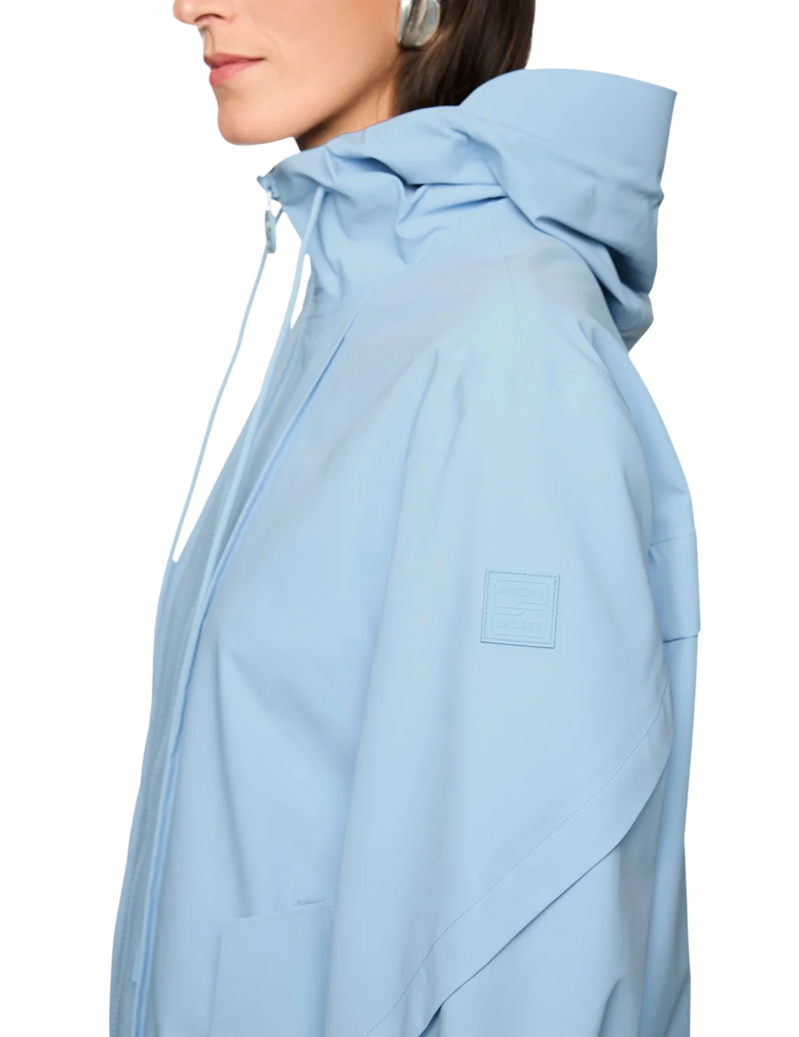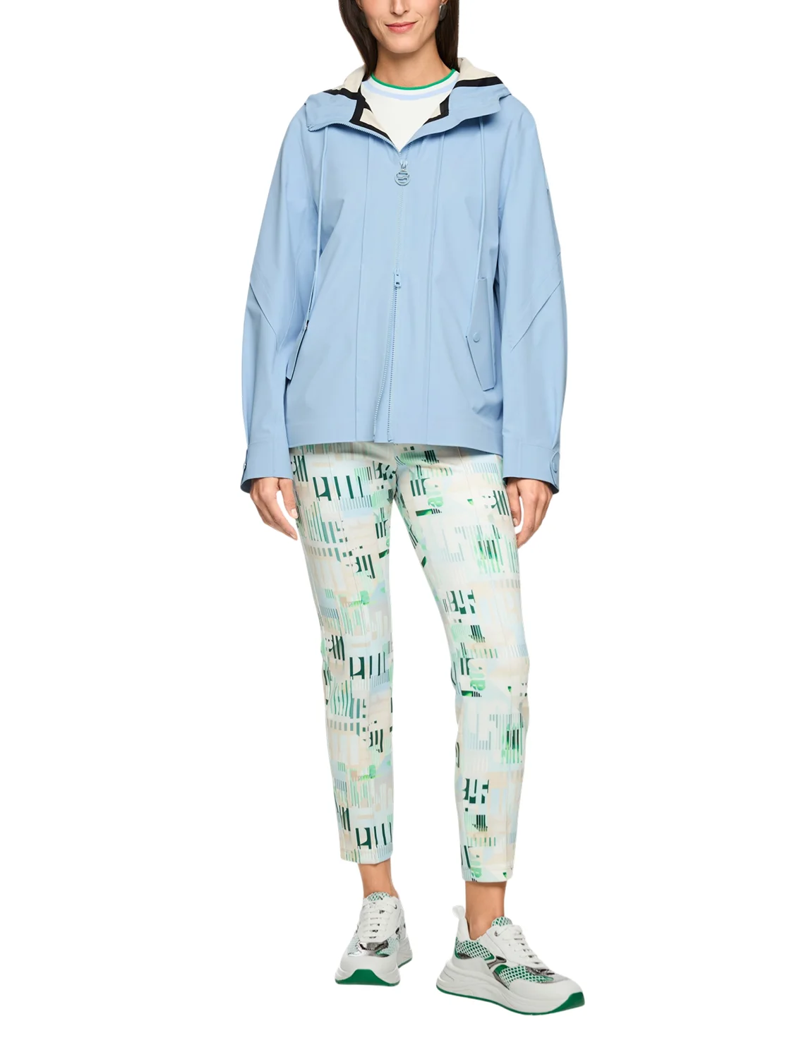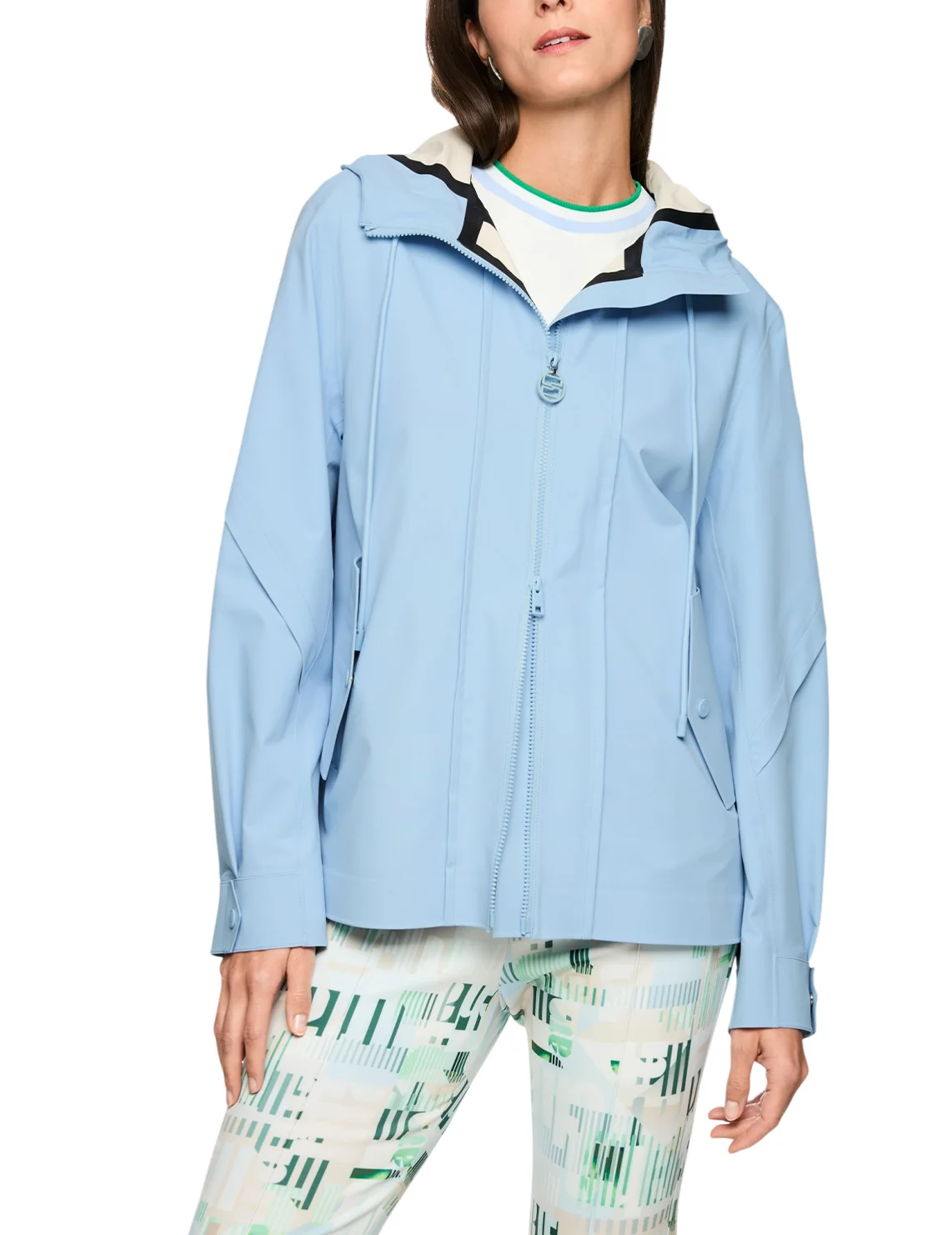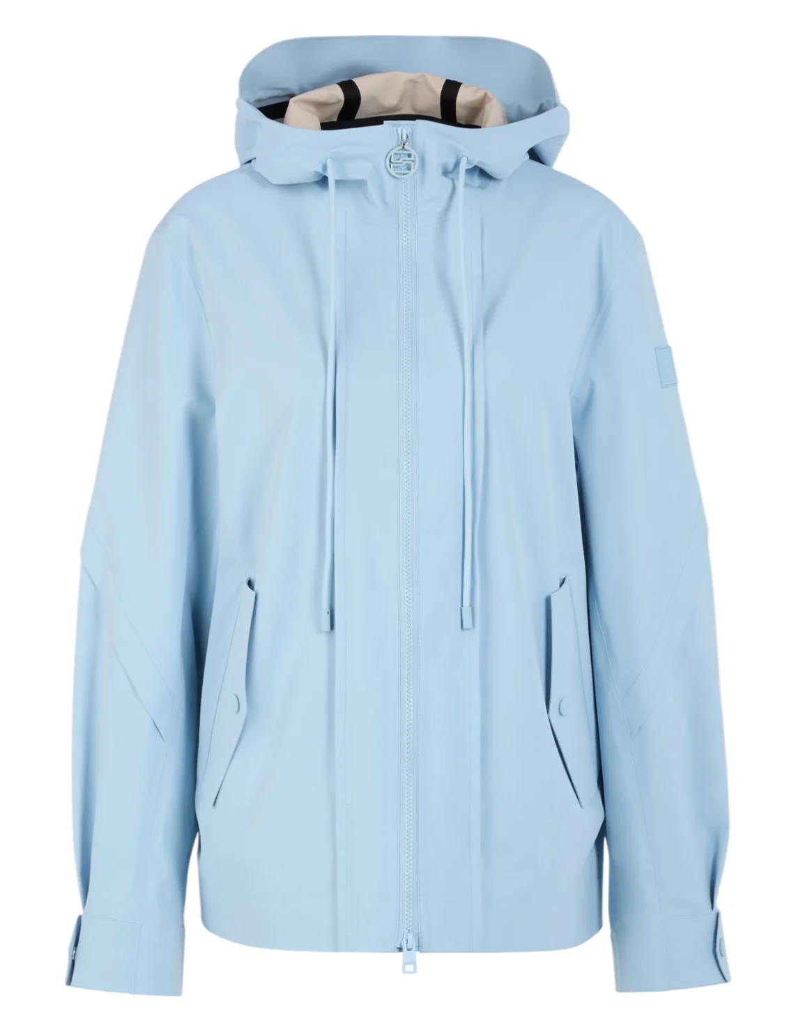 Куртка изготовлена из полиамида и эластана, подкладка из полиэстера. Модель выполнена в свободном крое. Имеет воротник-стойку, капюшон с кулиской, карманы с клапанами, длинные рукава с манжетами, разрез сзади и двустороннюю застежку на молнии.