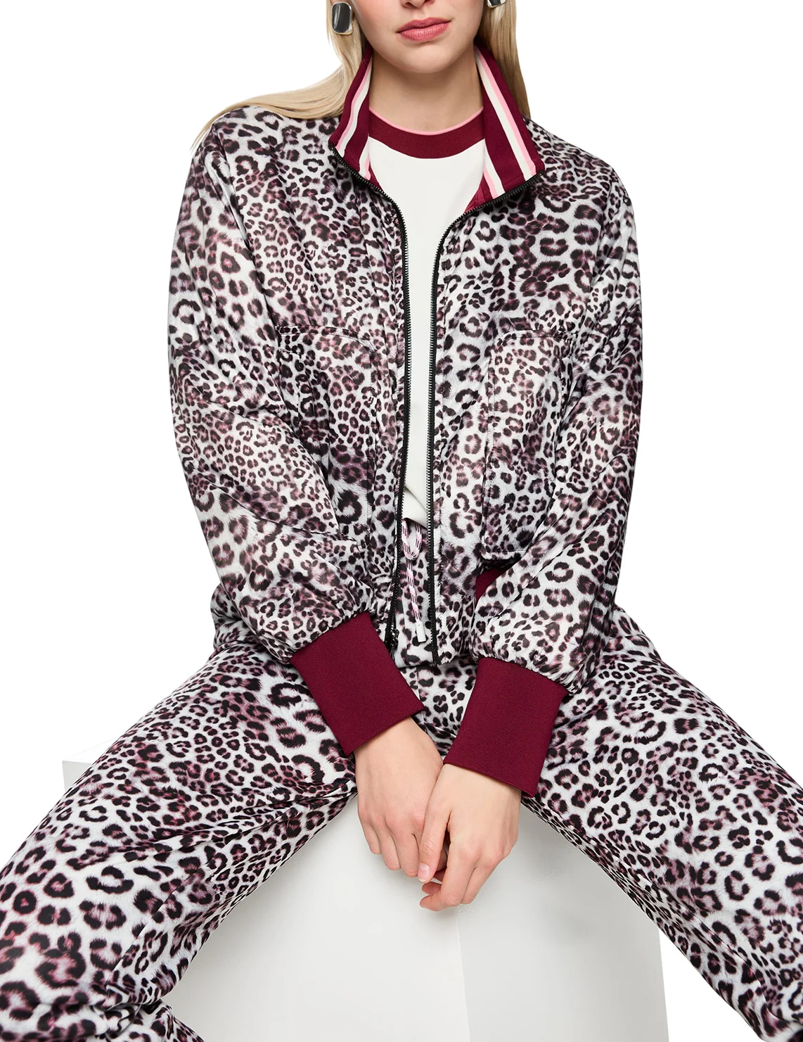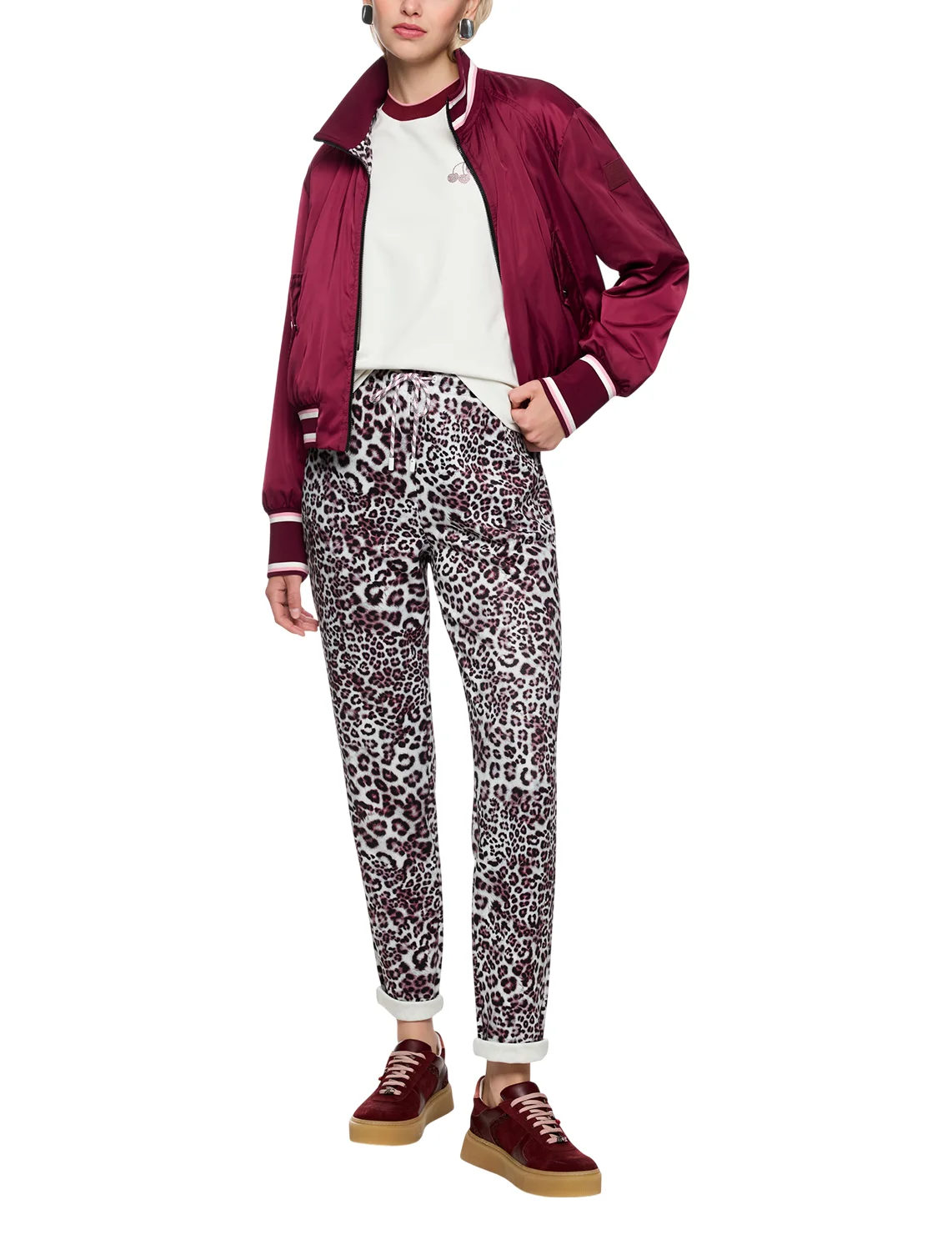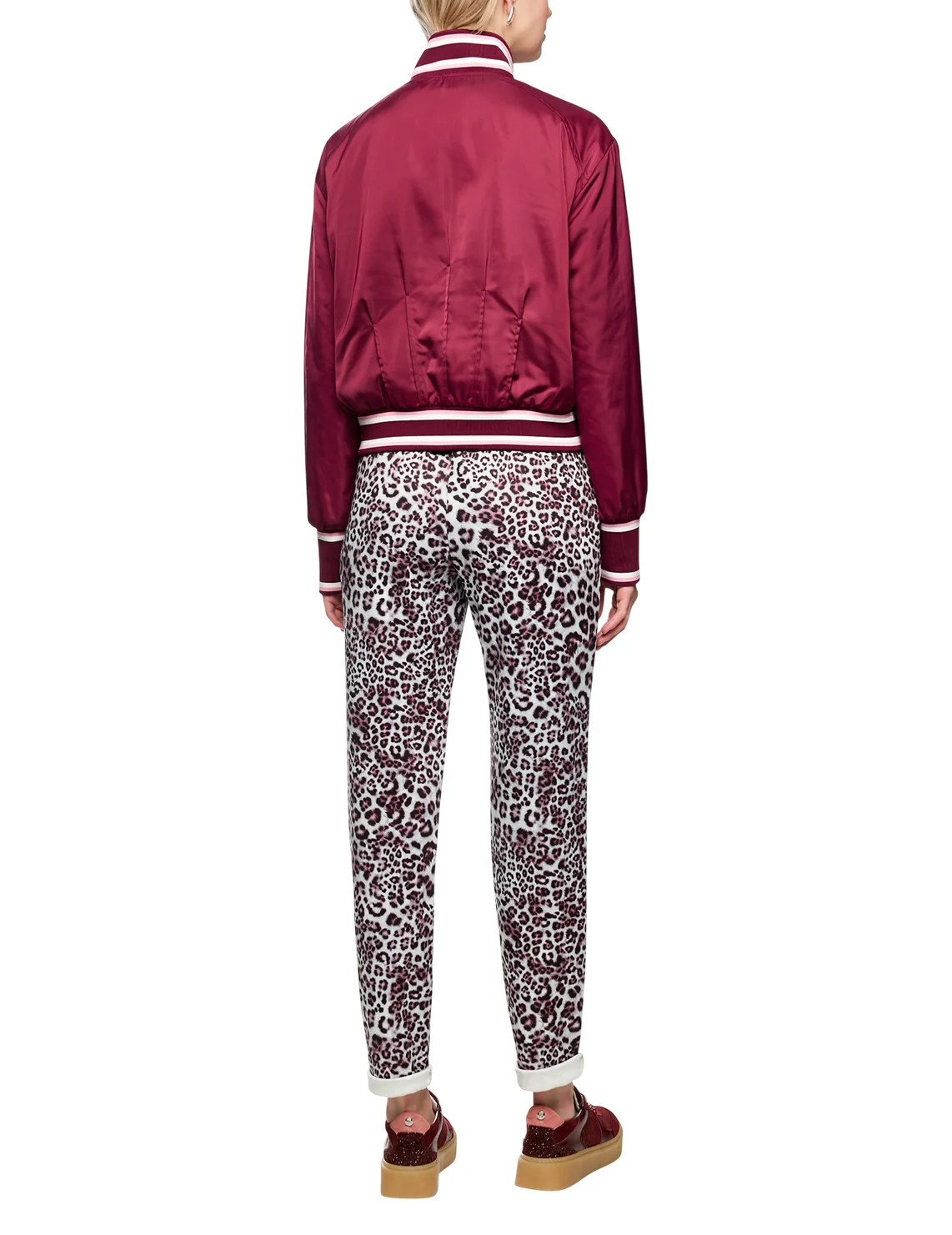 Двусторонняя куртка изготовлена из 100% полиэстера. Модель выполнена в прямом крое. Имеет воротник-стойку, длинные рукава с манжетами, двустороннюю застежку-молнию, карманы с клапанами с одной стороны и накладные карманы с другой. Декорирована анималистичным принтом.