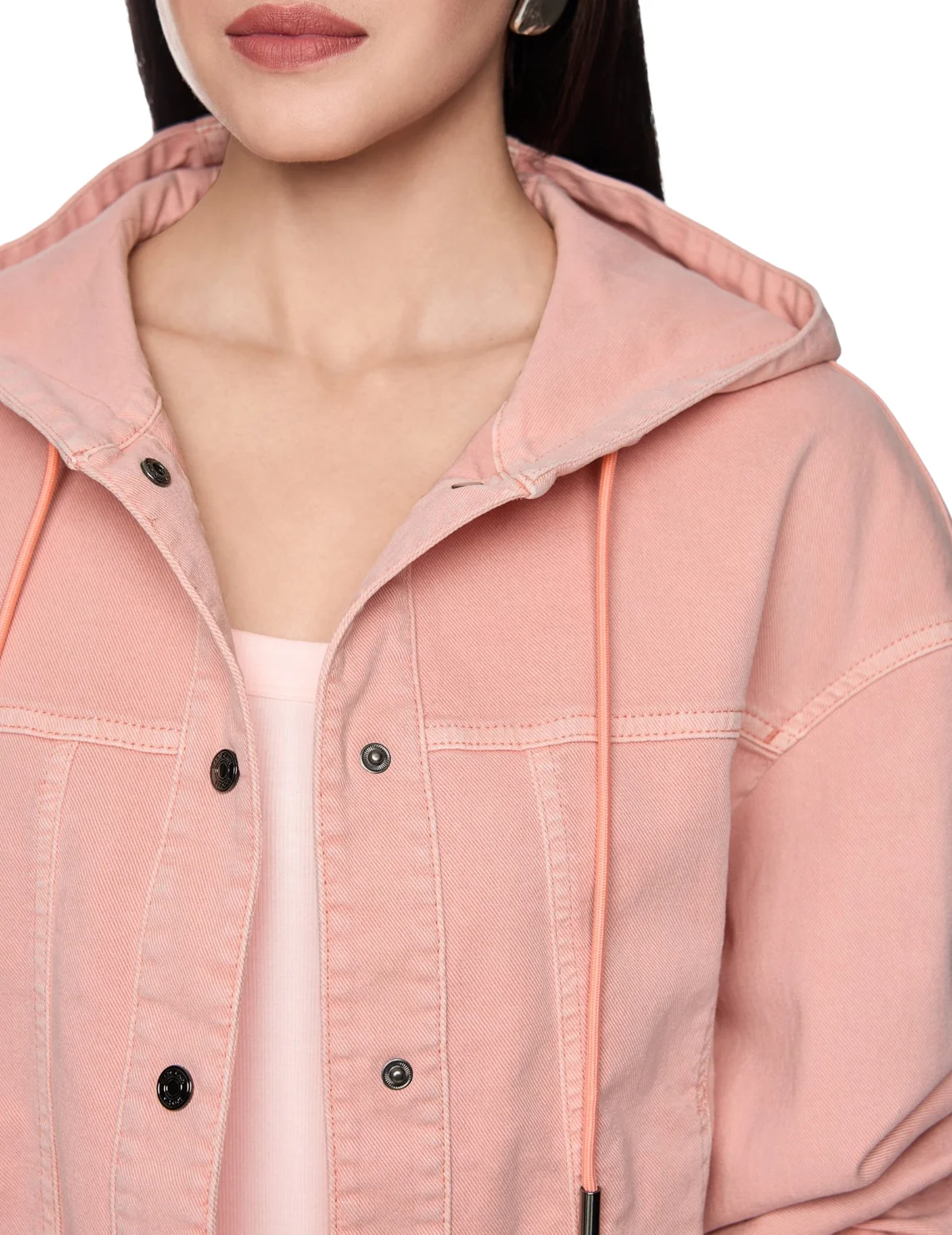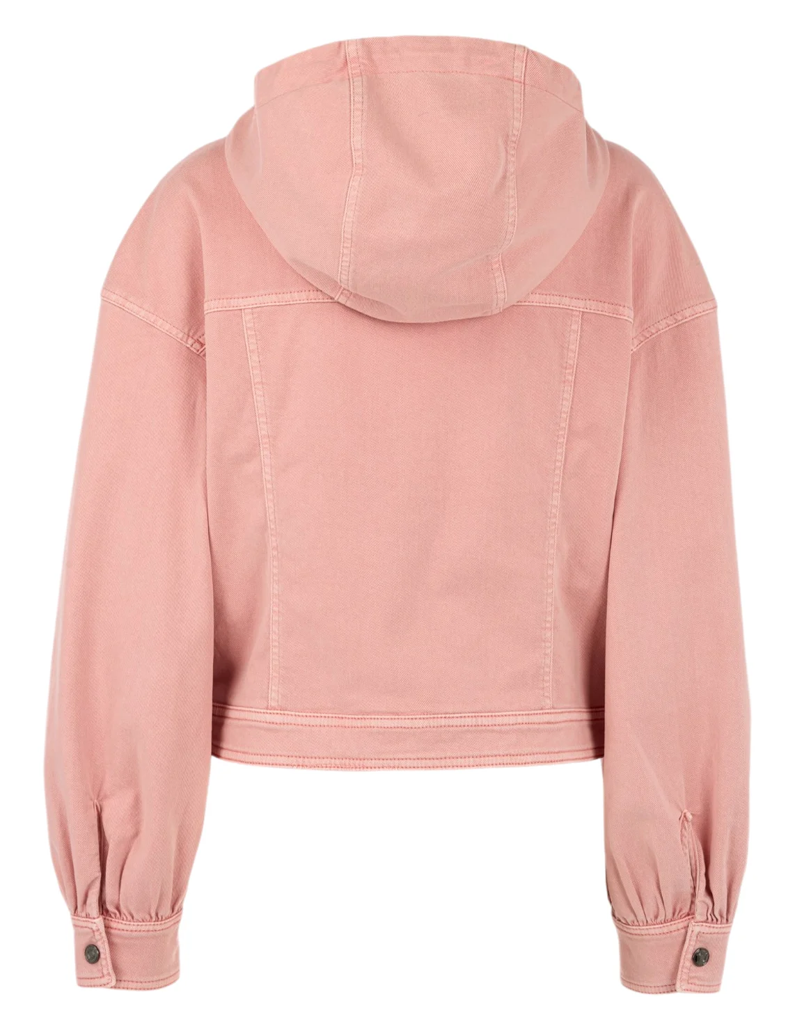Джинсовая куртка изготовлена из хлопка и эластана. Модель выполнена в прямом крое. Имеет капюшон, боковые карманы, длинные рукава с манжетами. Застёгивается на кнопки.