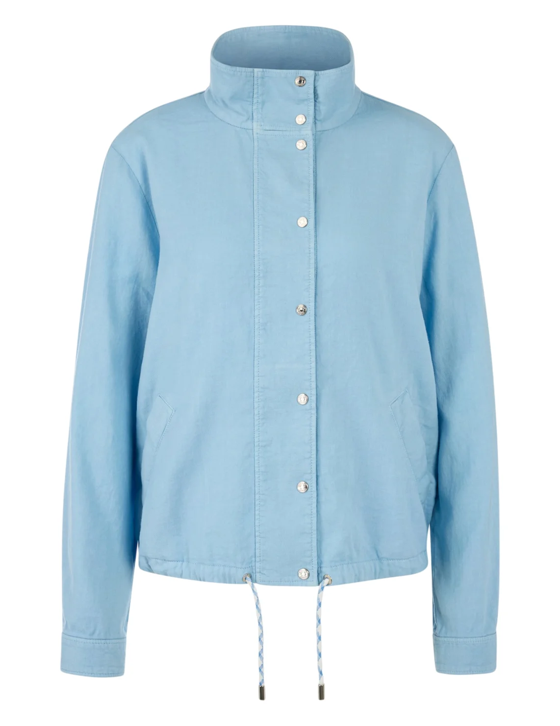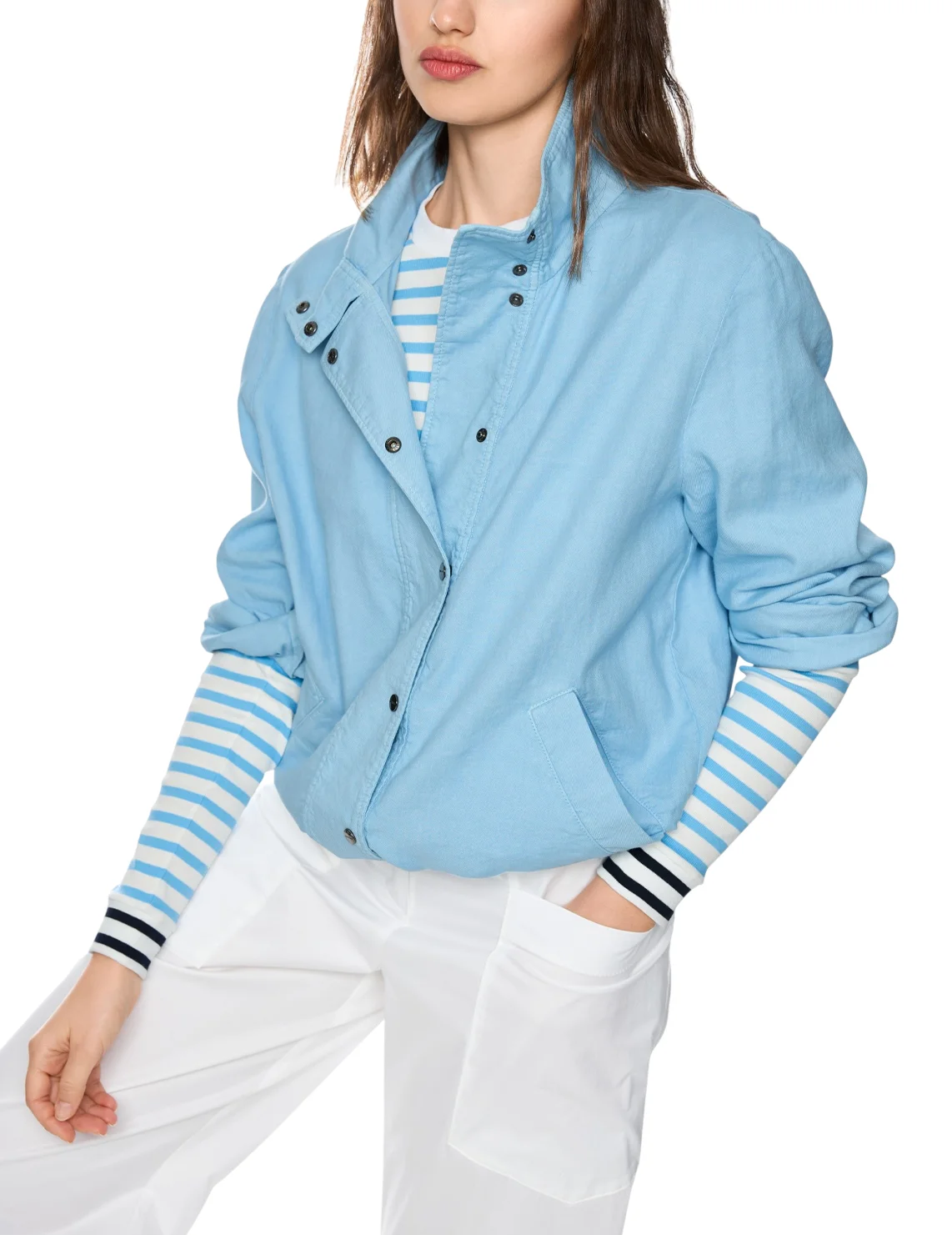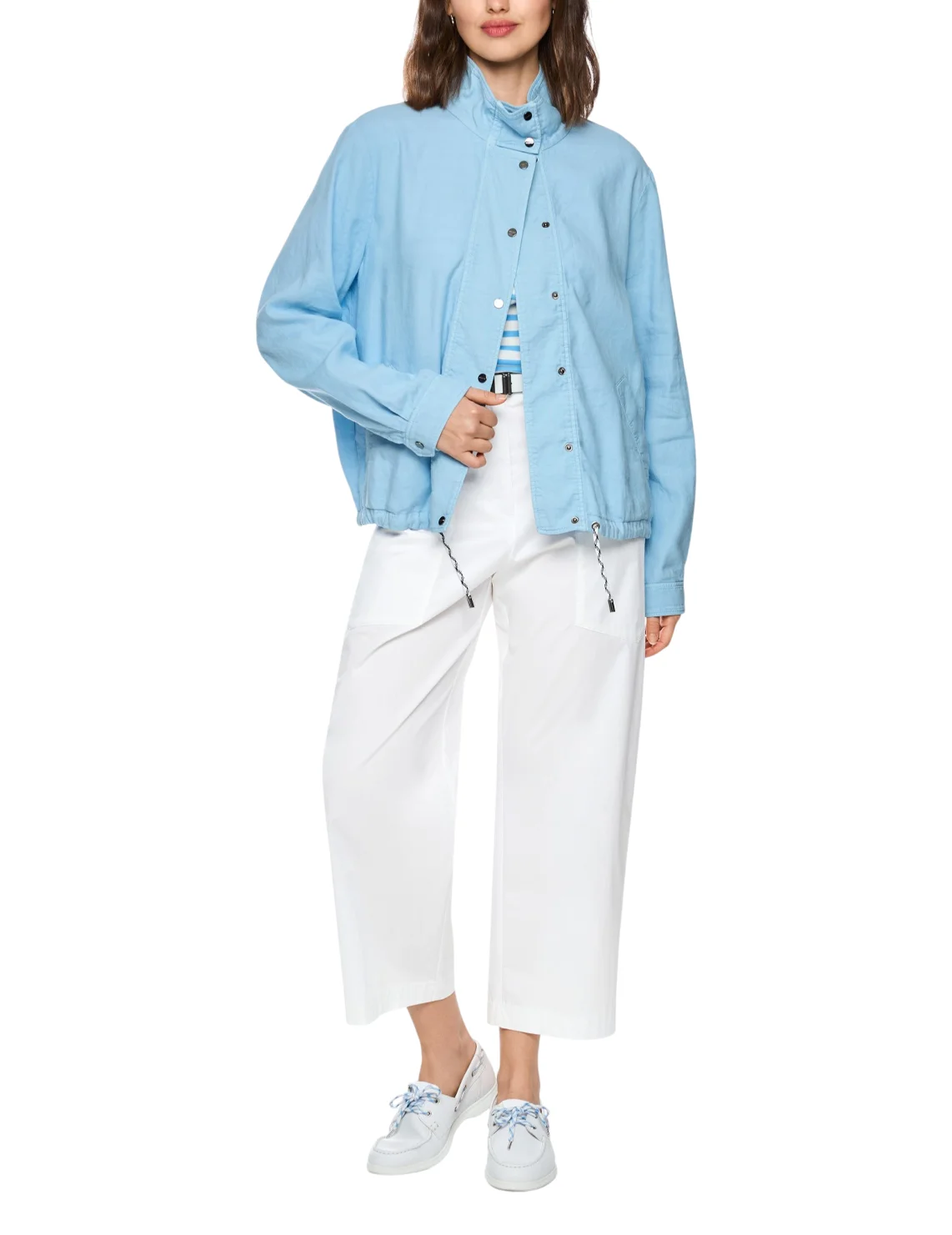 Куртка-бомбер изготовлена из хлопка, льна и эластана. Модель свободного кроя. Имеет длинные рукава с манжетами, воротник-стойку, кулиску на подоле. Застёгивается на кнопки.