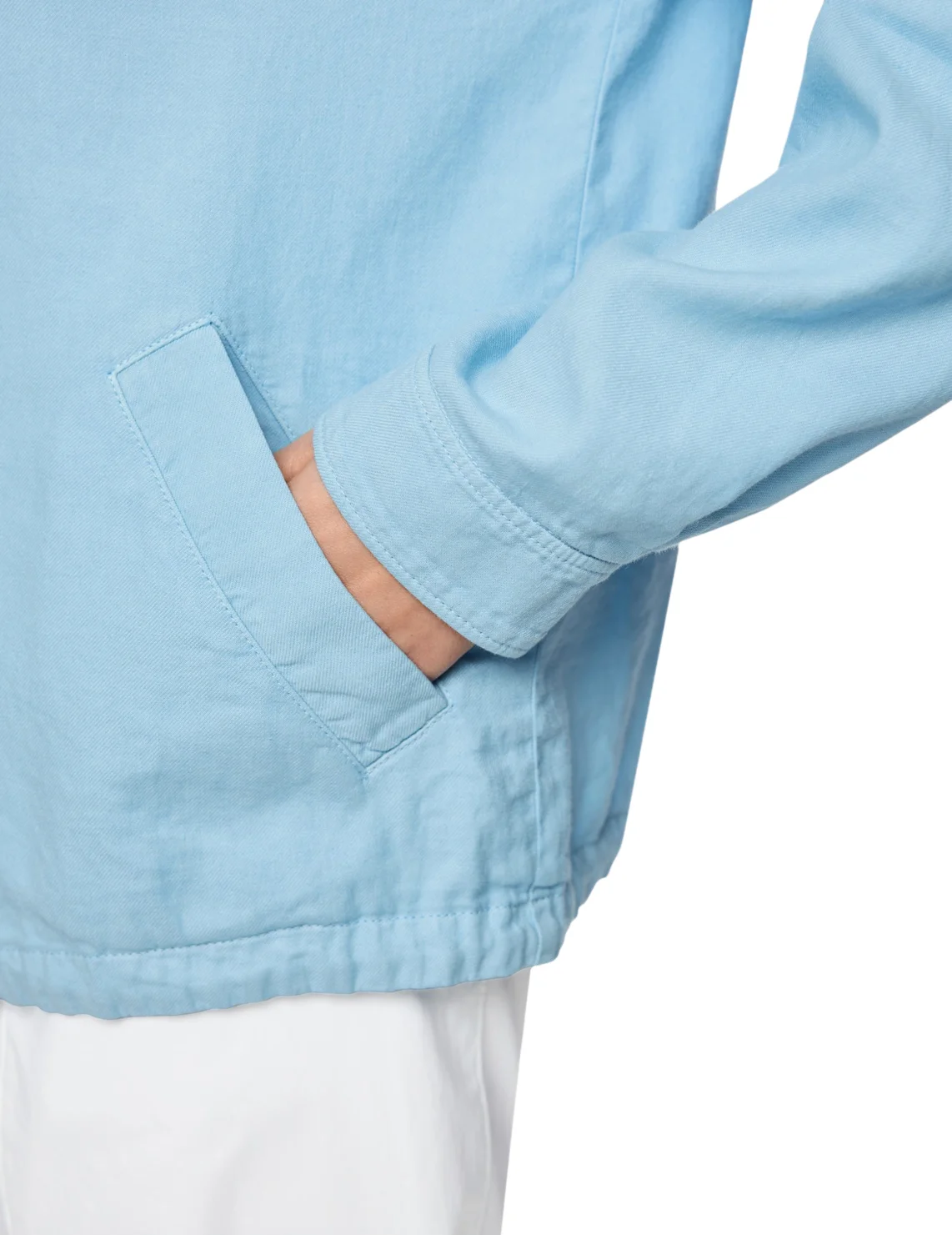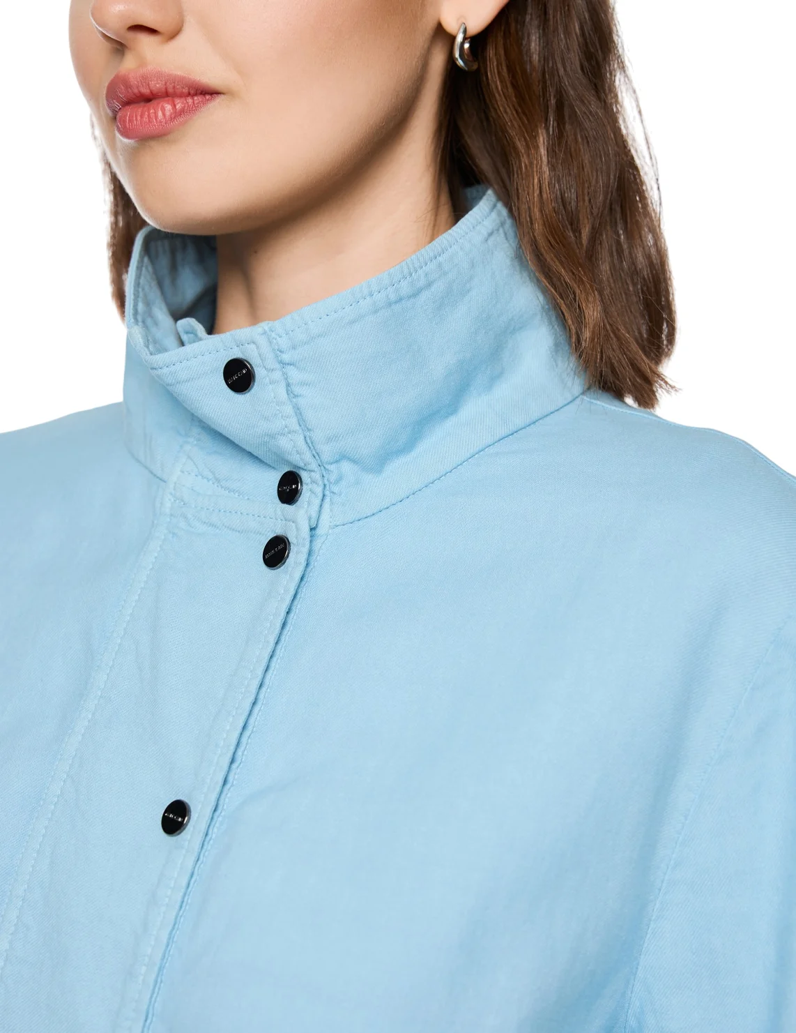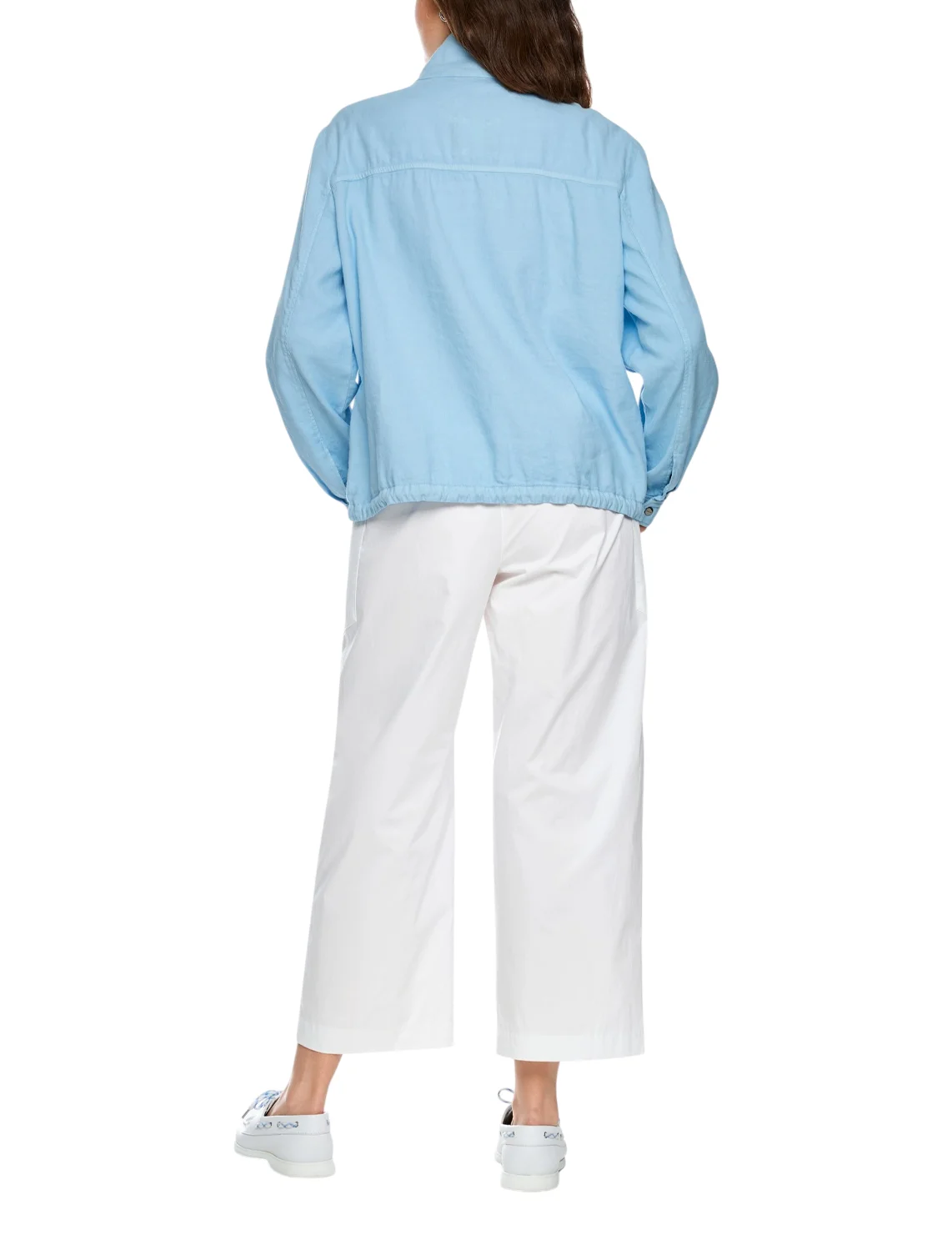 Куртка-бомбер изготовлена из хлопка, льна и эластана. Модель свободного кроя. Имеет длинные рукава с манжетами, воротник-стойку, кулиску на подоле. Застёгивается на кнопки.