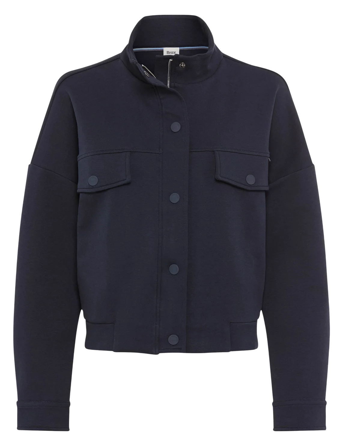 Куртка изготовлена из хлопка, полиэстера и эластана. Модель выполнена в прямом крое. Имеет воротник-стойку, заниженную плечевую линию, боковые прорезные карманы, нагрудные карманы с клапанами, длинные рукава с манжетами и застежку-молнию с кнопками.