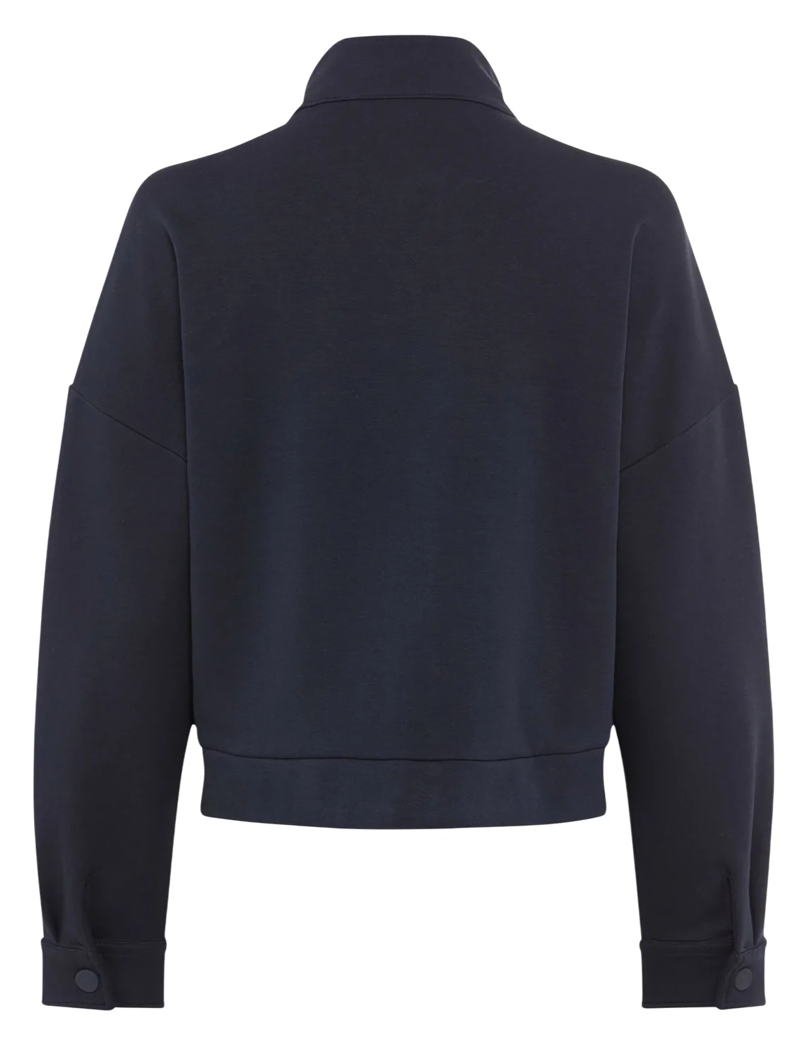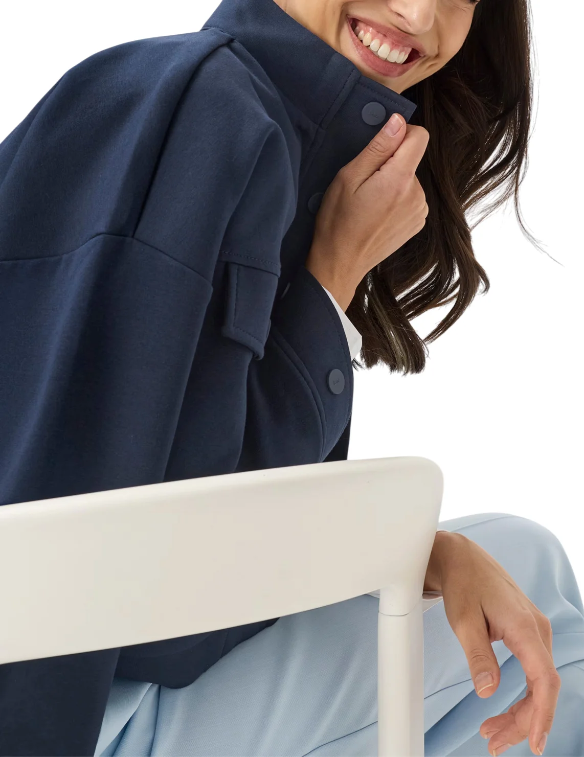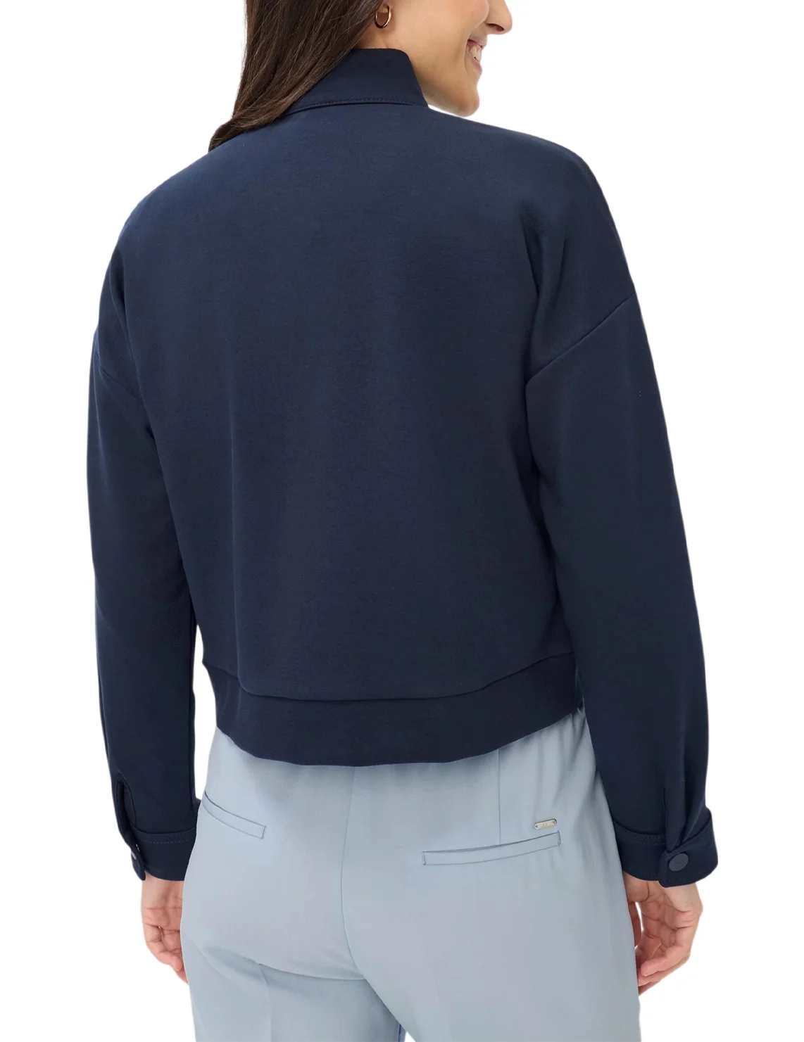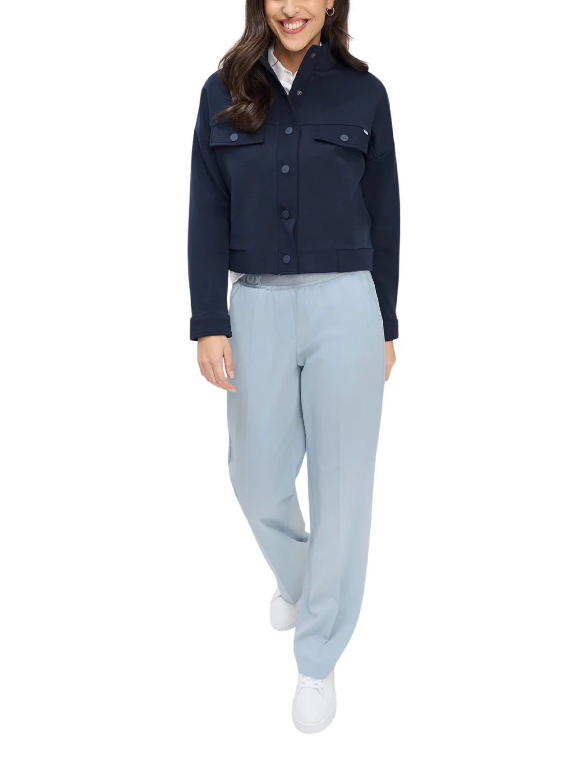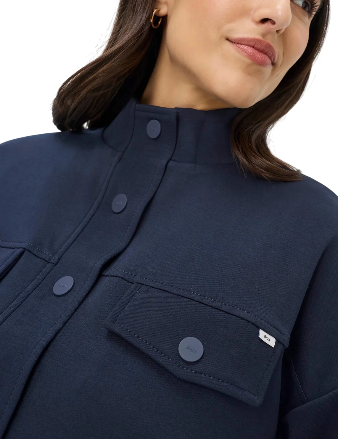 Куртка изготовлена из хлопка, полиэстера и эластана. Модель выполнена в прямом крое. Имеет воротник-стойку, заниженную плечевую линию, боковые прорезные карманы, нагрудные карманы с клапанами, длинные рукава с манжетами и застежку-молнию с кнопками.