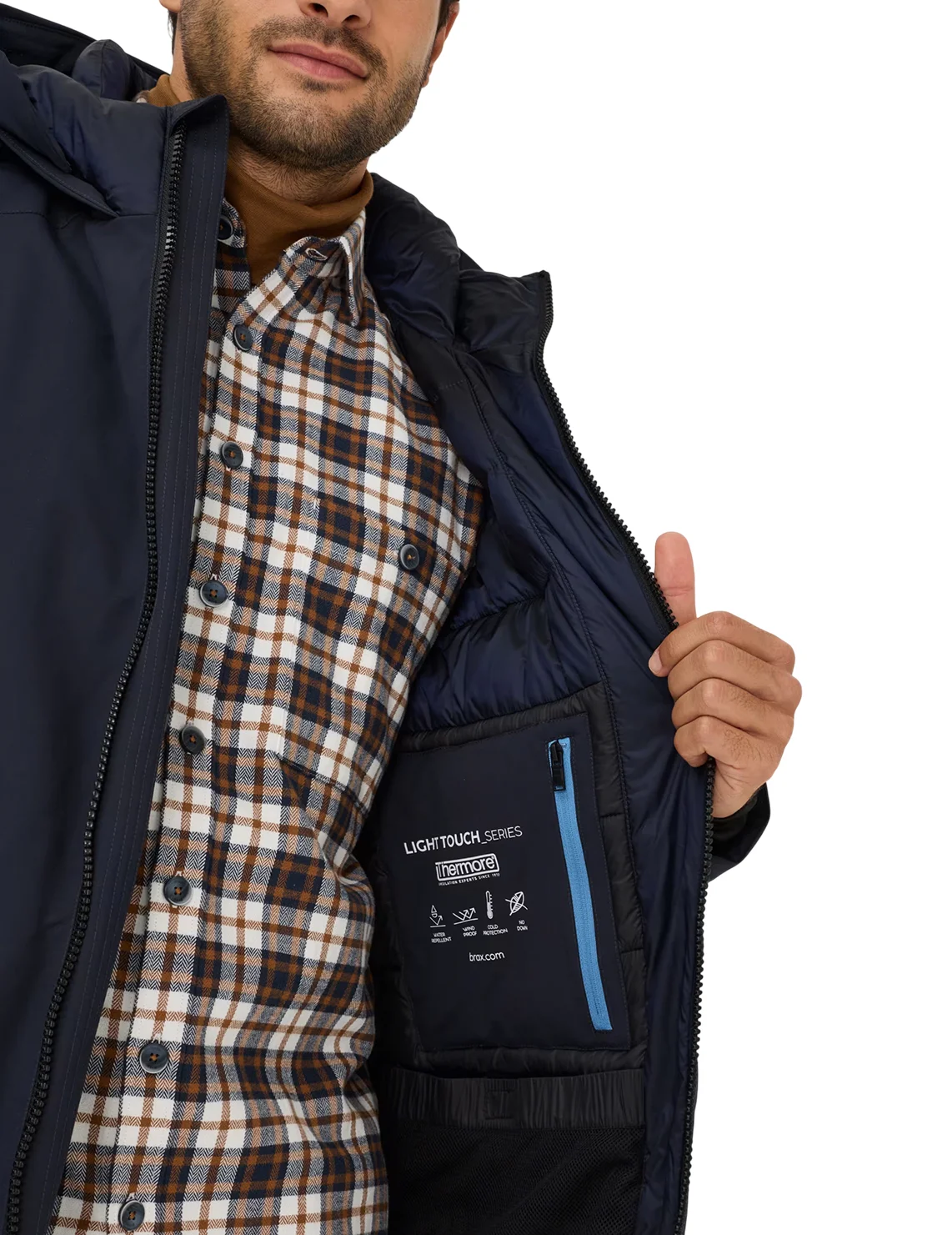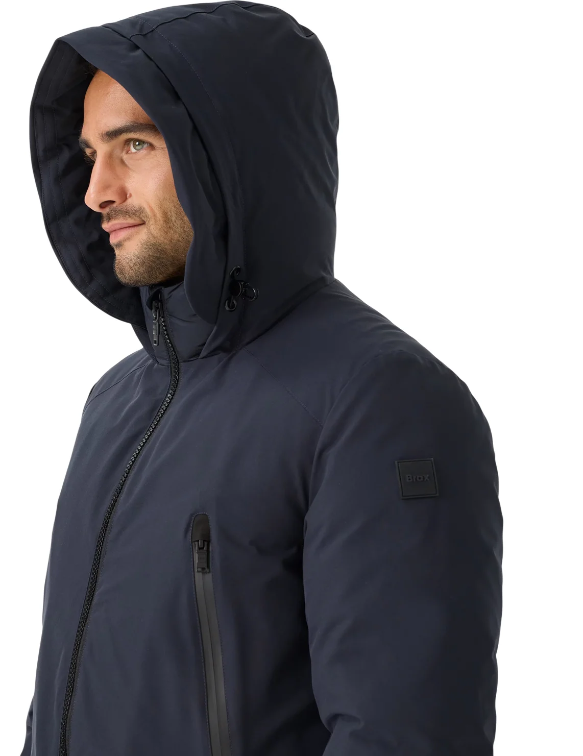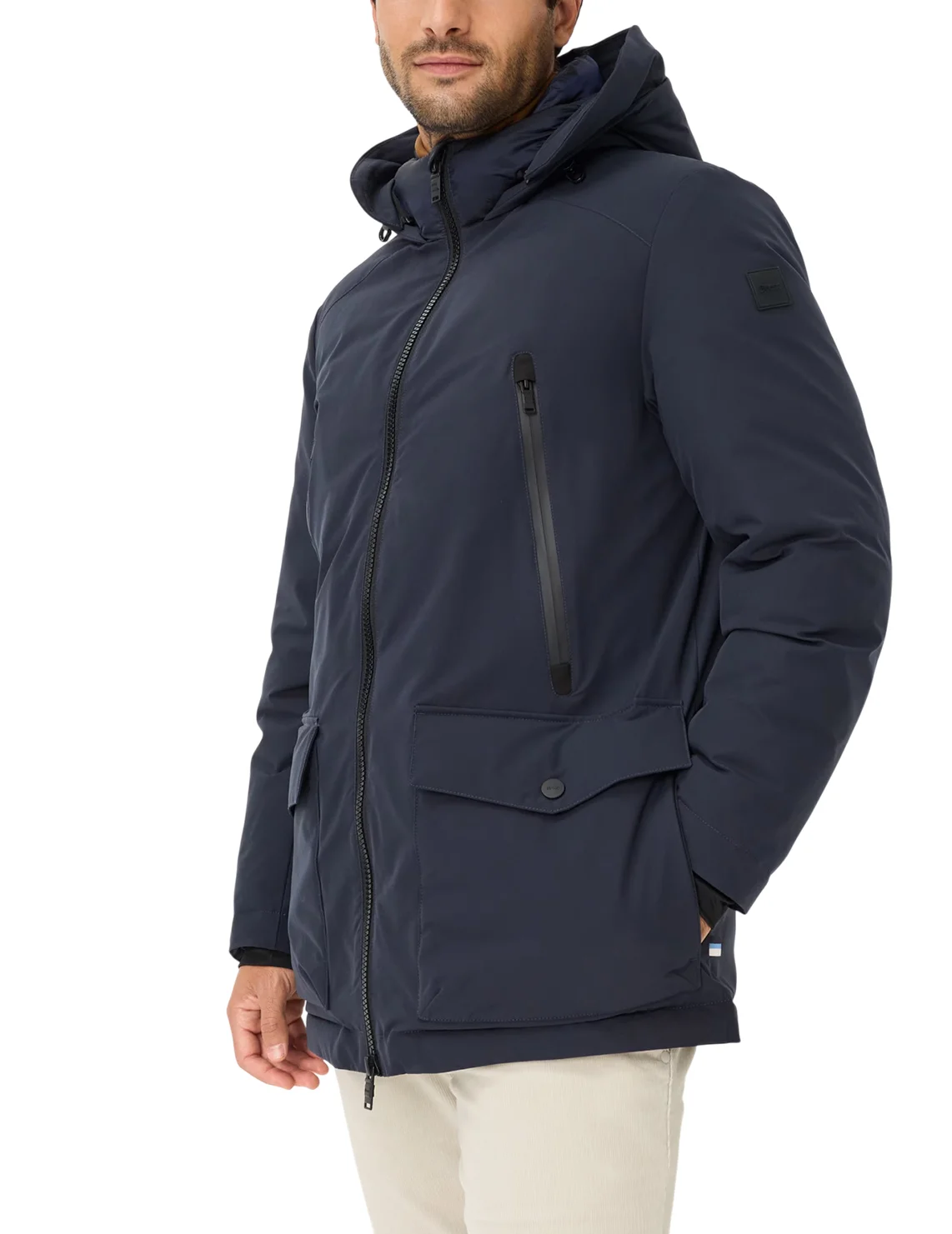 Куртка изготовлена из 100% полиэстера, подкладка из 100% полиамида. Модель выполнена в прямом крое. Имеет воротник-стойку, капюшон с кулиской, прорезные нагрудные карманы на молнии, карманы с клапанами, боковые прорезные карманы, длинные рукава и двустороннюю застежку-молнию.