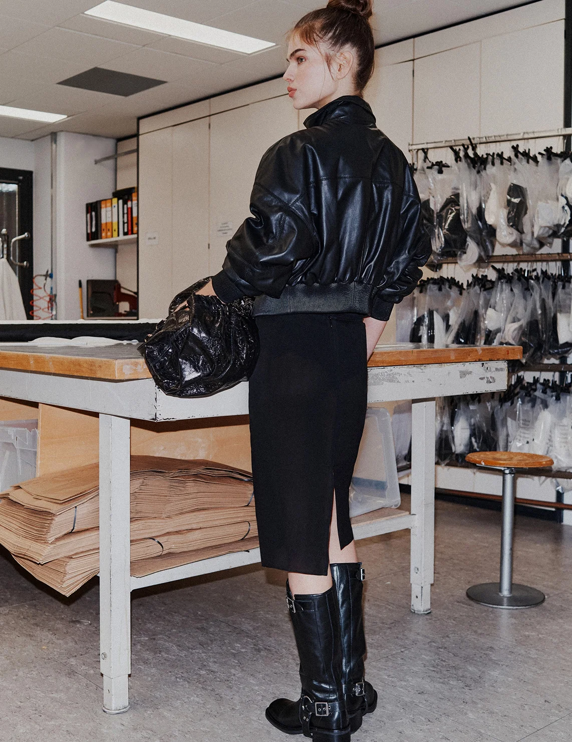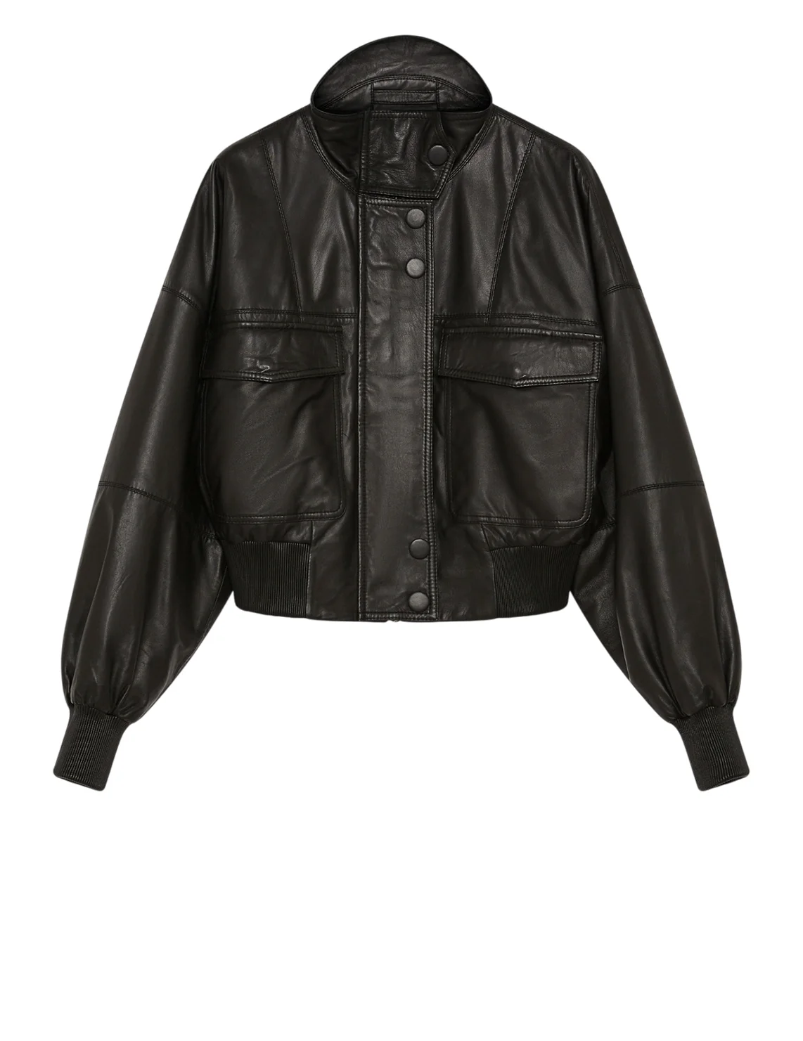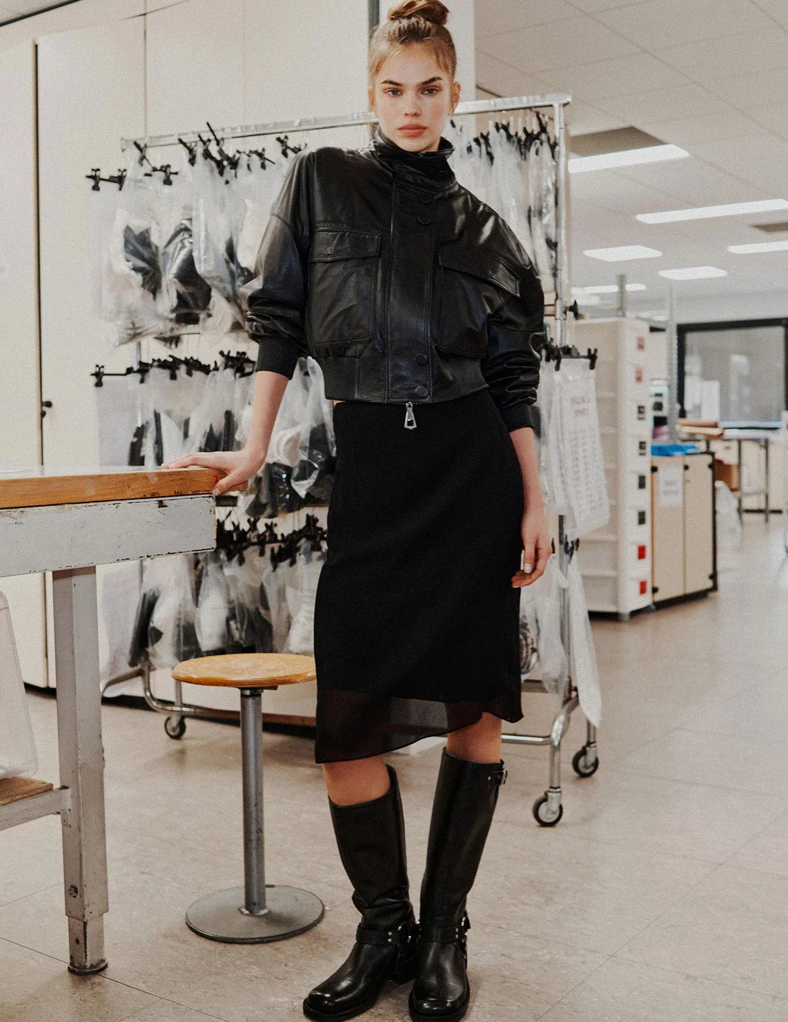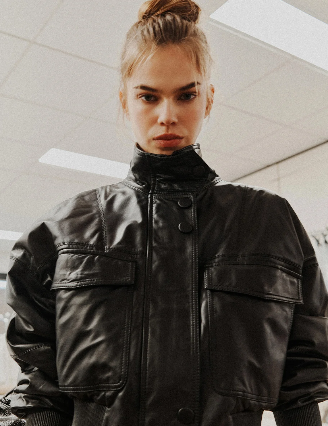 Куртка изготовлена из 100% кожи высокого качества, подкладка из вискозы, полиамида и эластана. Модель выполнена в прямом крое. Имеет воротник-стойку, длинные рукава с манжетами, накладные карманы с клапанами, застежку на молнии и кнопках. Модель входит в специальную коллекцию Marella Codesign, созданную в сотрудничестве со Стеллой Максвелл.