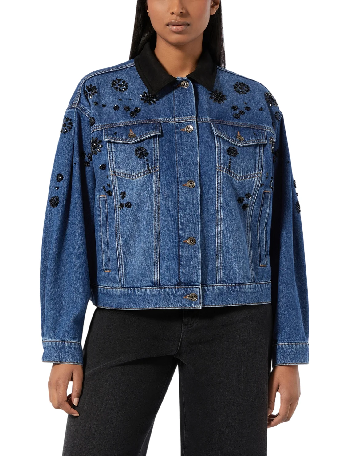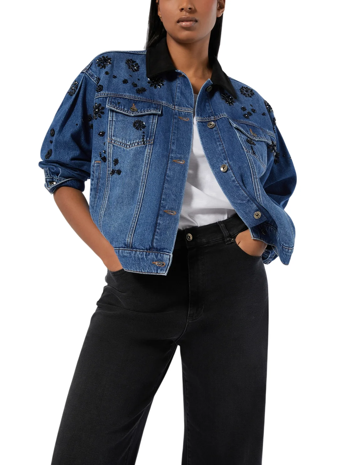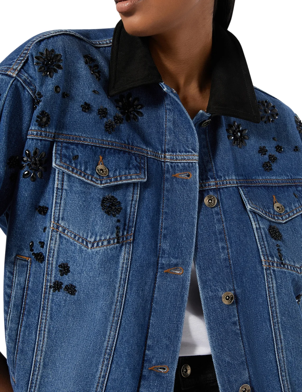 Джинсовая куртка изготовлена из 100% хлопка. Модель выполнена в свободном крое. Имеет отложной воротник, длинные рукава с манжетами, заниженную плечевую линию, нагрудные карманы с клапанами и застежку на пуговицы. Декорирована бисером, пайетками и стразами.