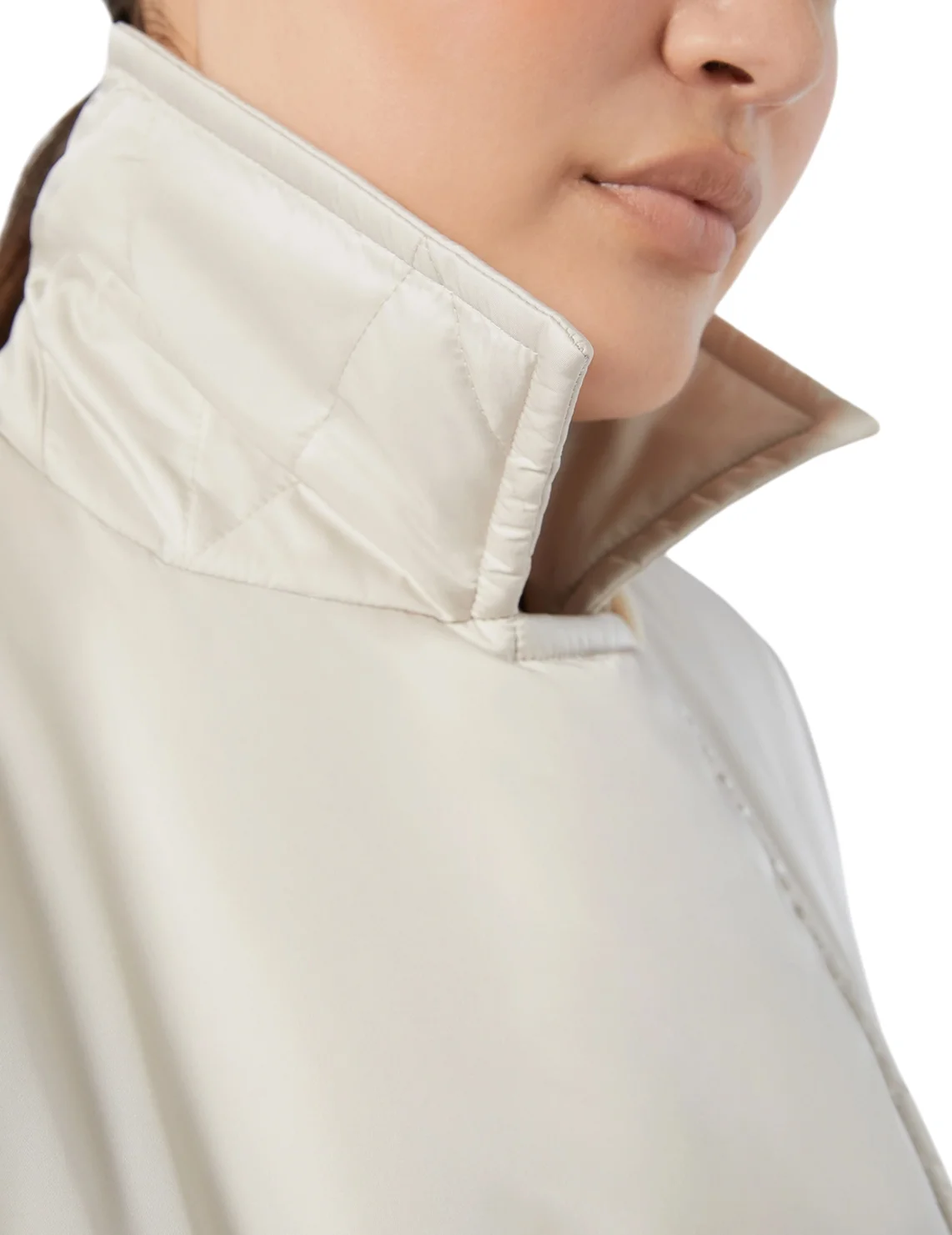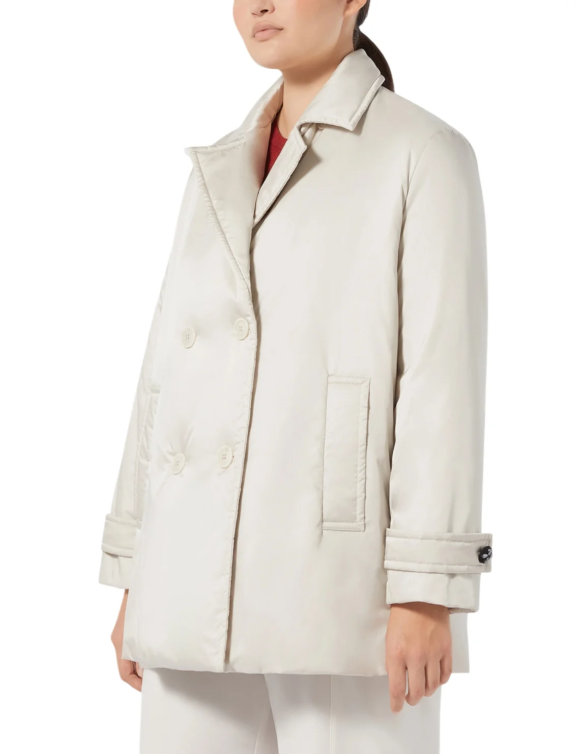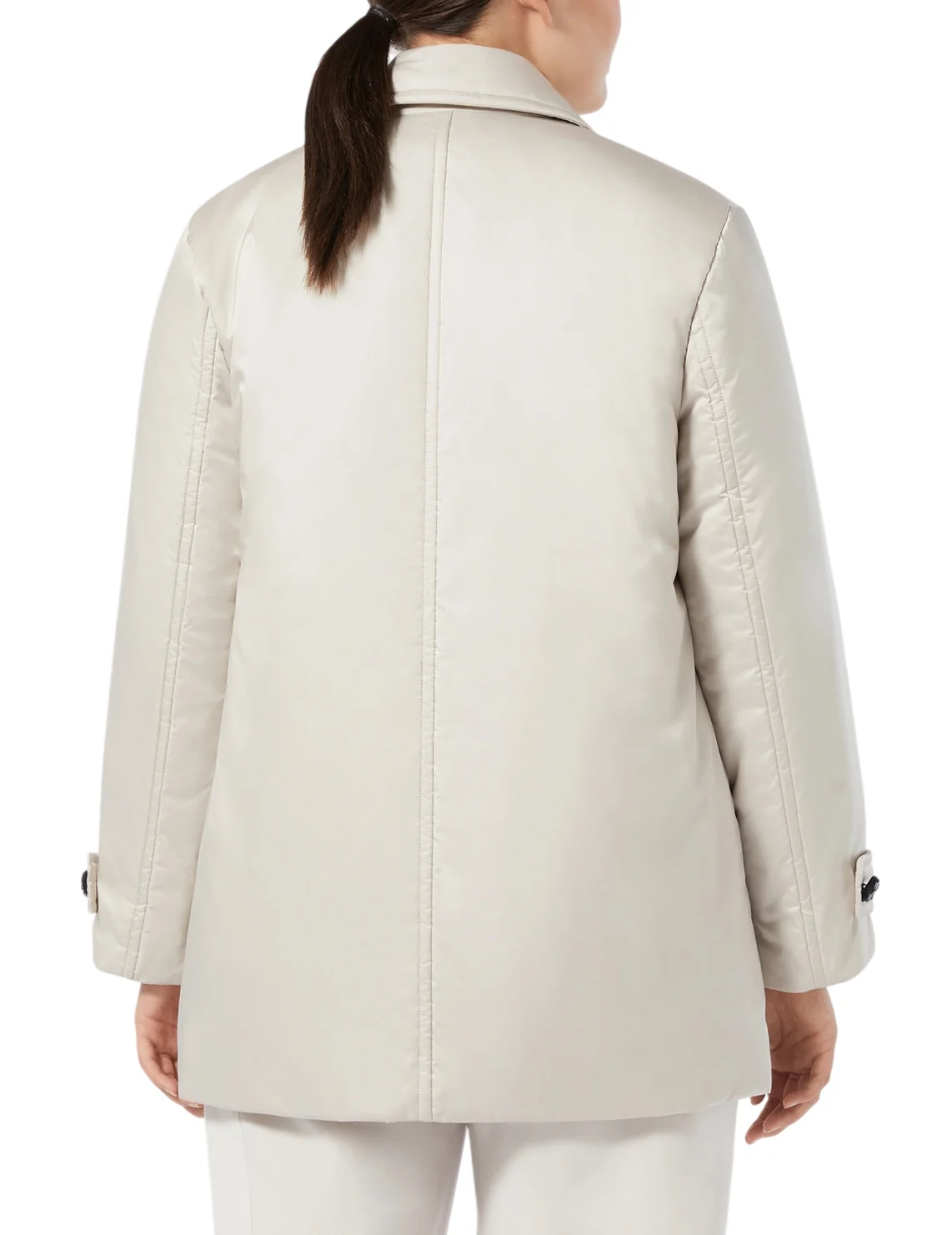 Куртка изготовлена из полиамида и полиэстера, подкладка из 100% полиэстера, наполнитель - полиэстер, шерсть и шелк. Модель выполнена в прямом крое. Имеет отложной воротник с лацканами, длинные рукава с манжетами, застежку на пуговицах и боковые карманы.