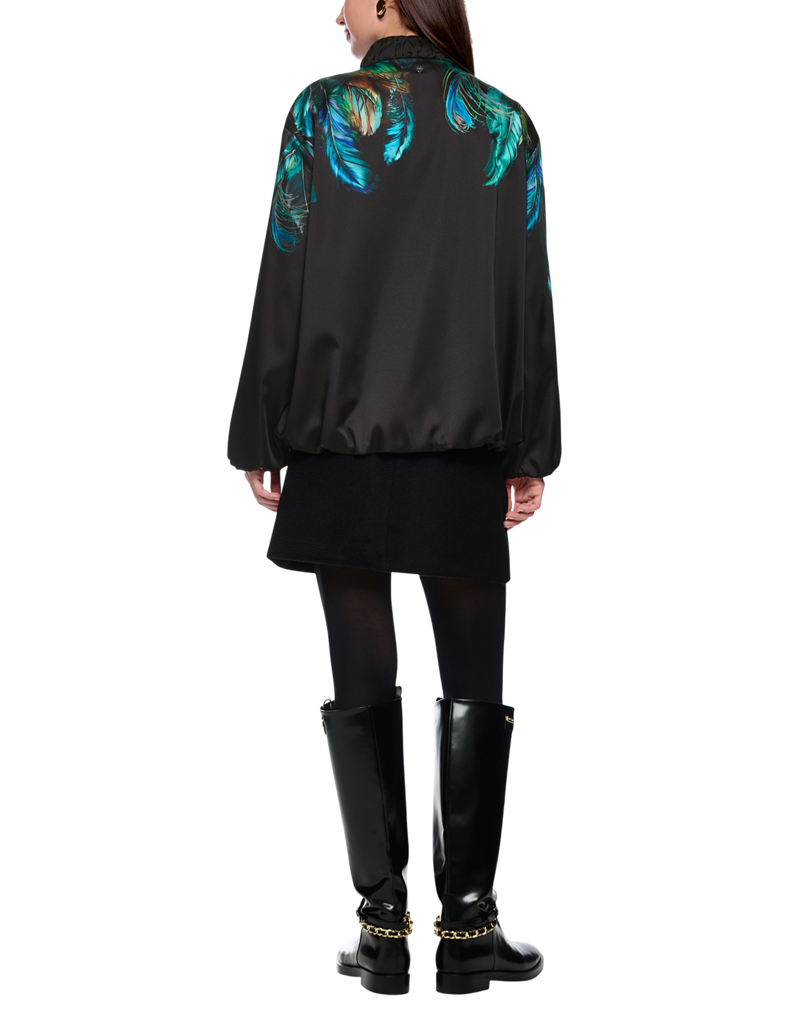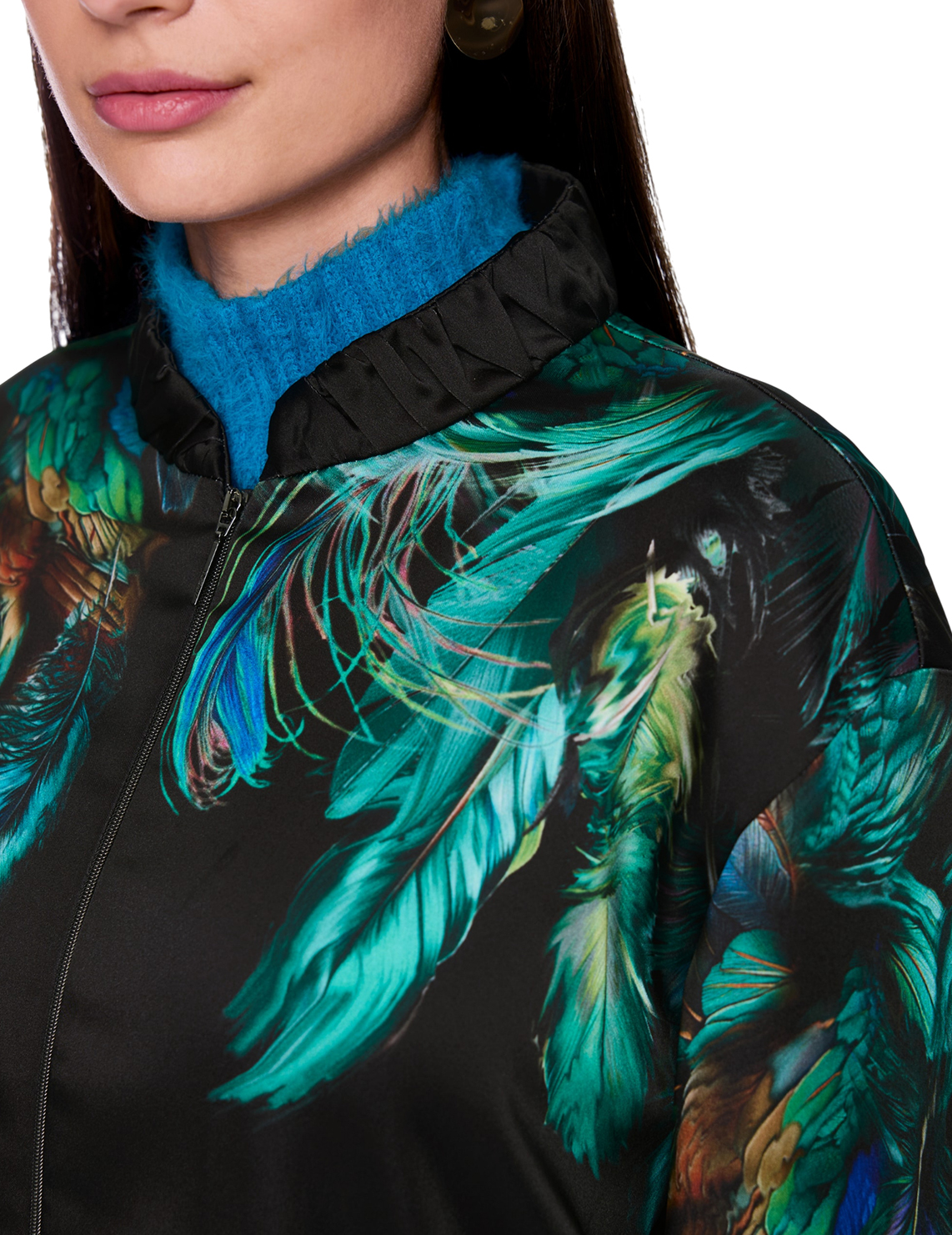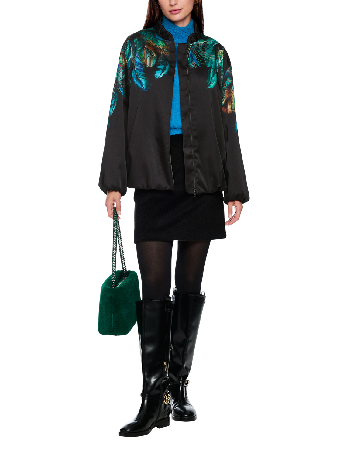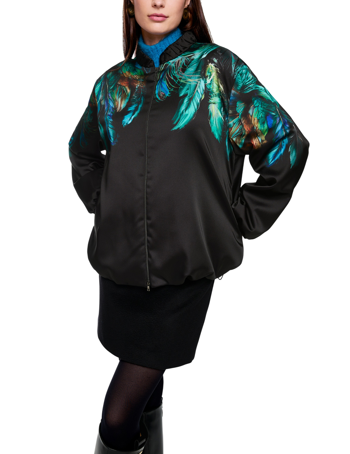 Куртка изготовлена из полиэстера и эластана, подкладка из полиэстера и хлопка. Модель выполнена в свободном крое. Имеет воротник-стойку, прорезные карманы, длинные рукава с манжетами и двустороннюю застежку-молнию. Декорирована оригинальным принтом.
