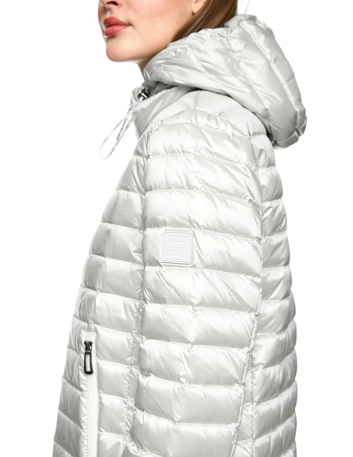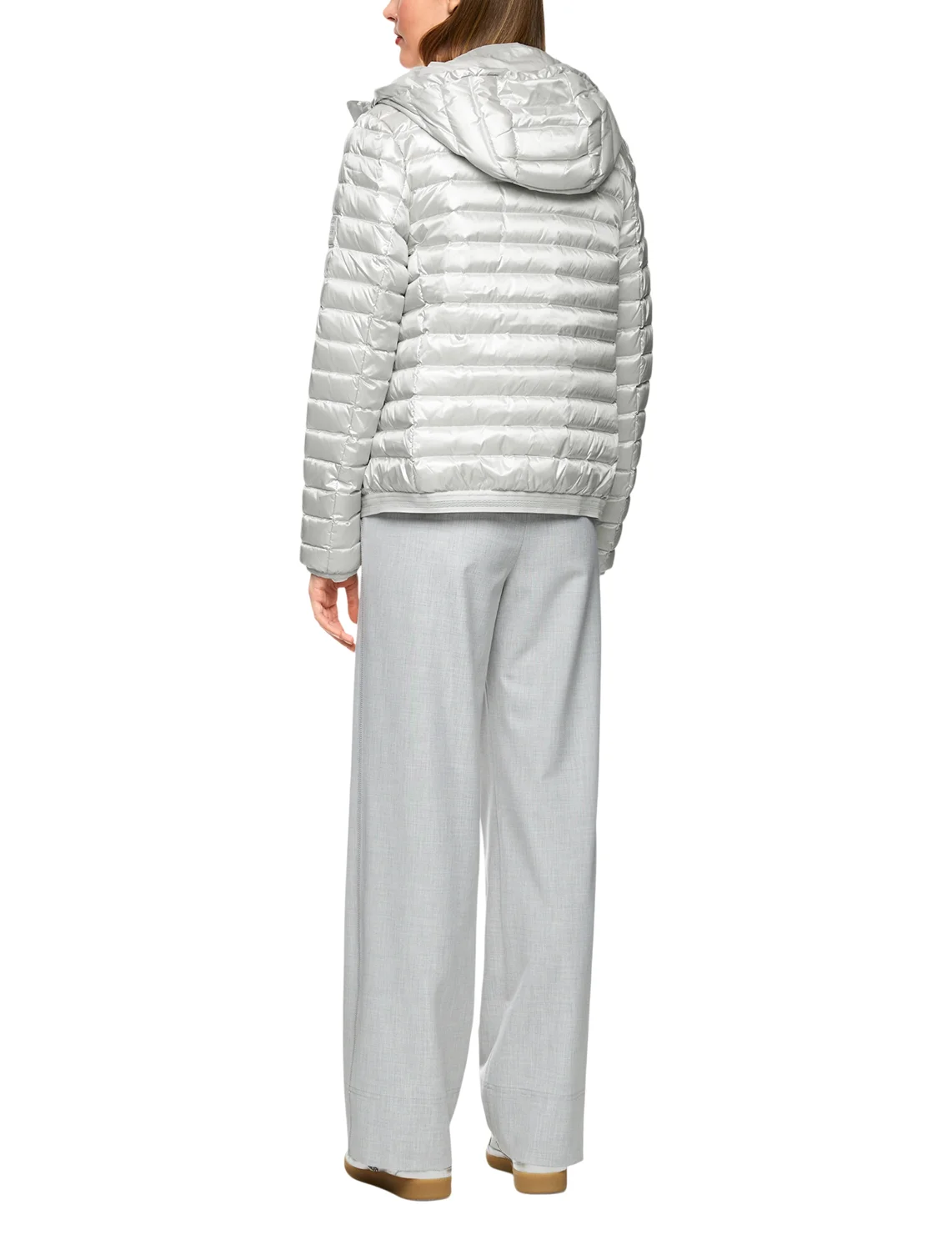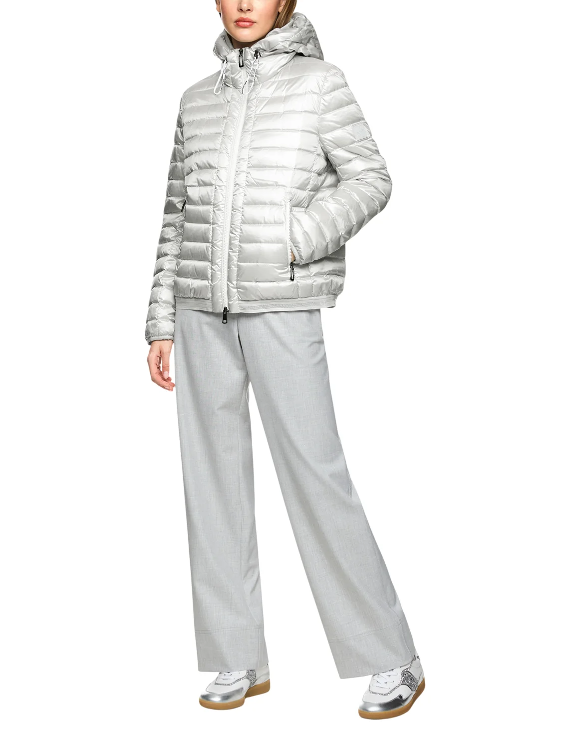 Куртка изготовлена из полиэстера и полиамида, наполнитель - пух и перо. Модель выполнена в прямом крое. Имеет капюшон с кулиской, прорезные карманы на молнии, длинные рукава с манжетами и двустороннюю застежку-молнию.