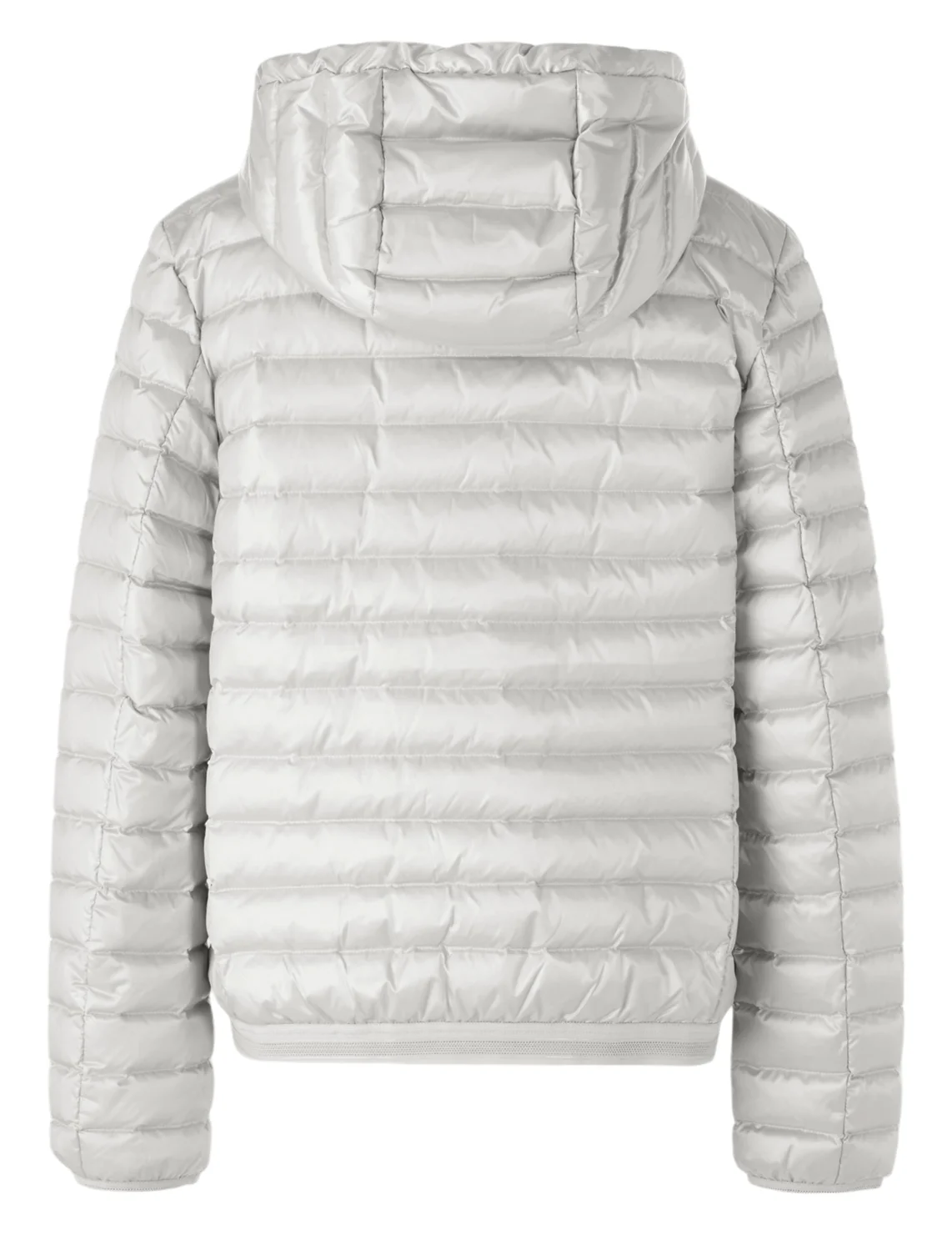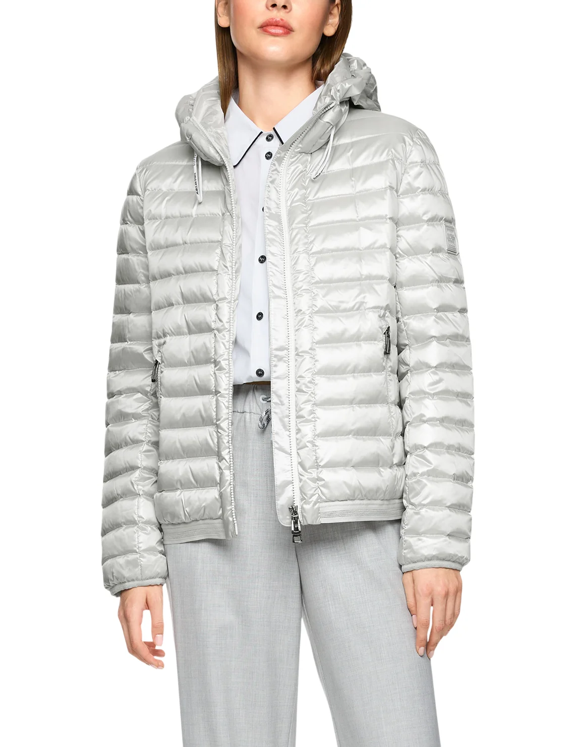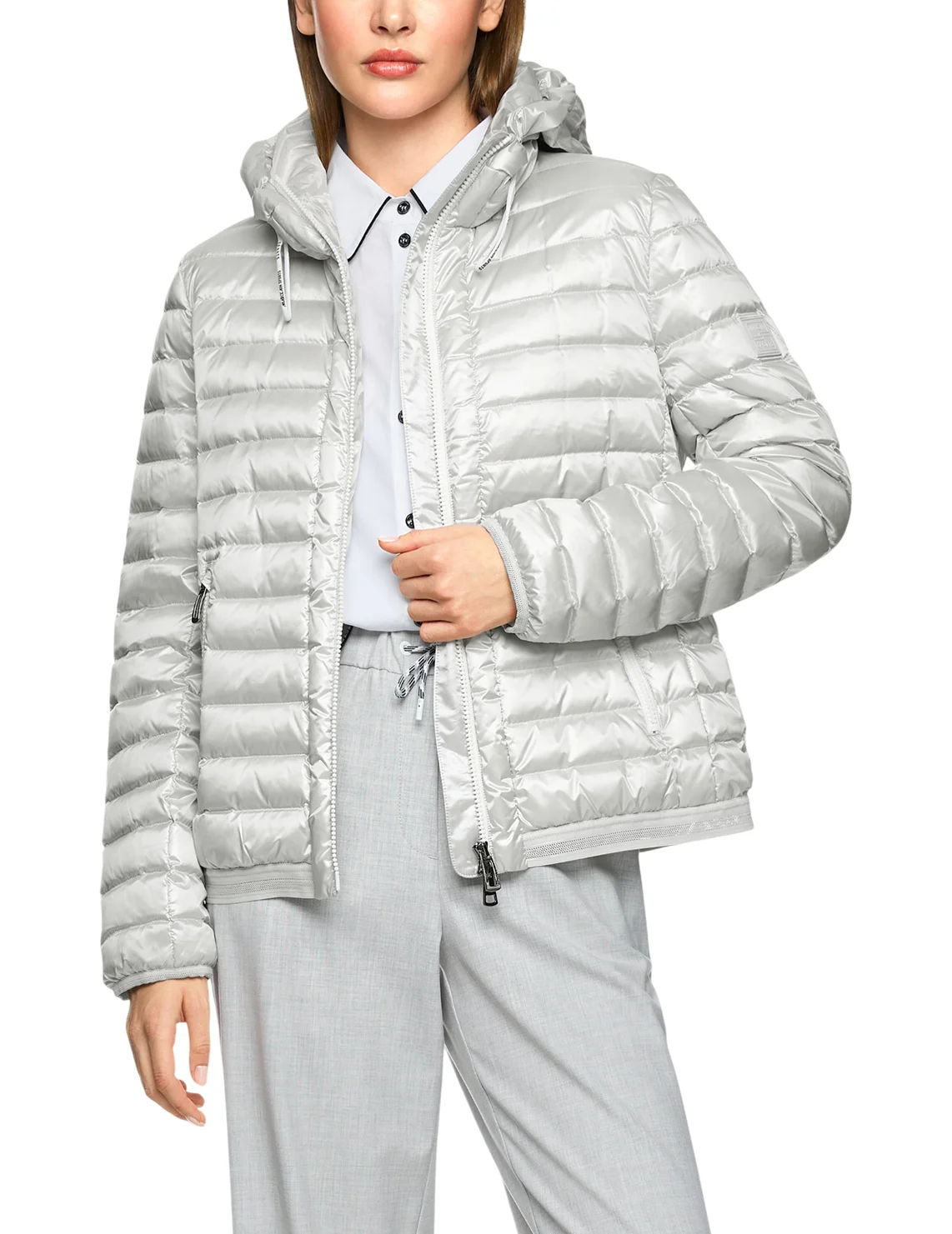 Куртка изготовлена из полиэстера и полиамида, наполнитель - пух и перо. Модель выполнена в прямом крое. Имеет капюшон с кулиской, прорезные карманы на молнии, длинные рукава с манжетами и двустороннюю застежку-молнию.
