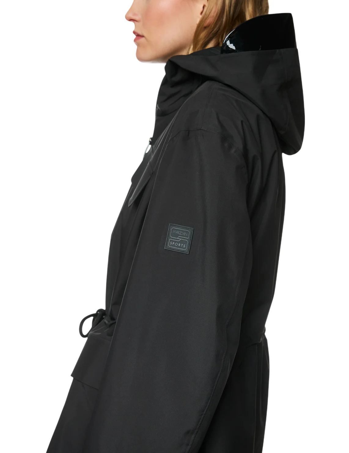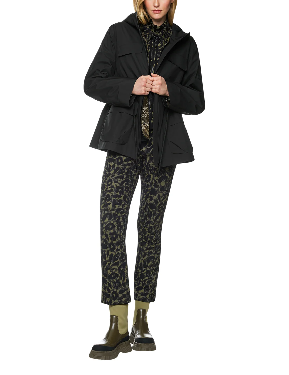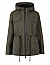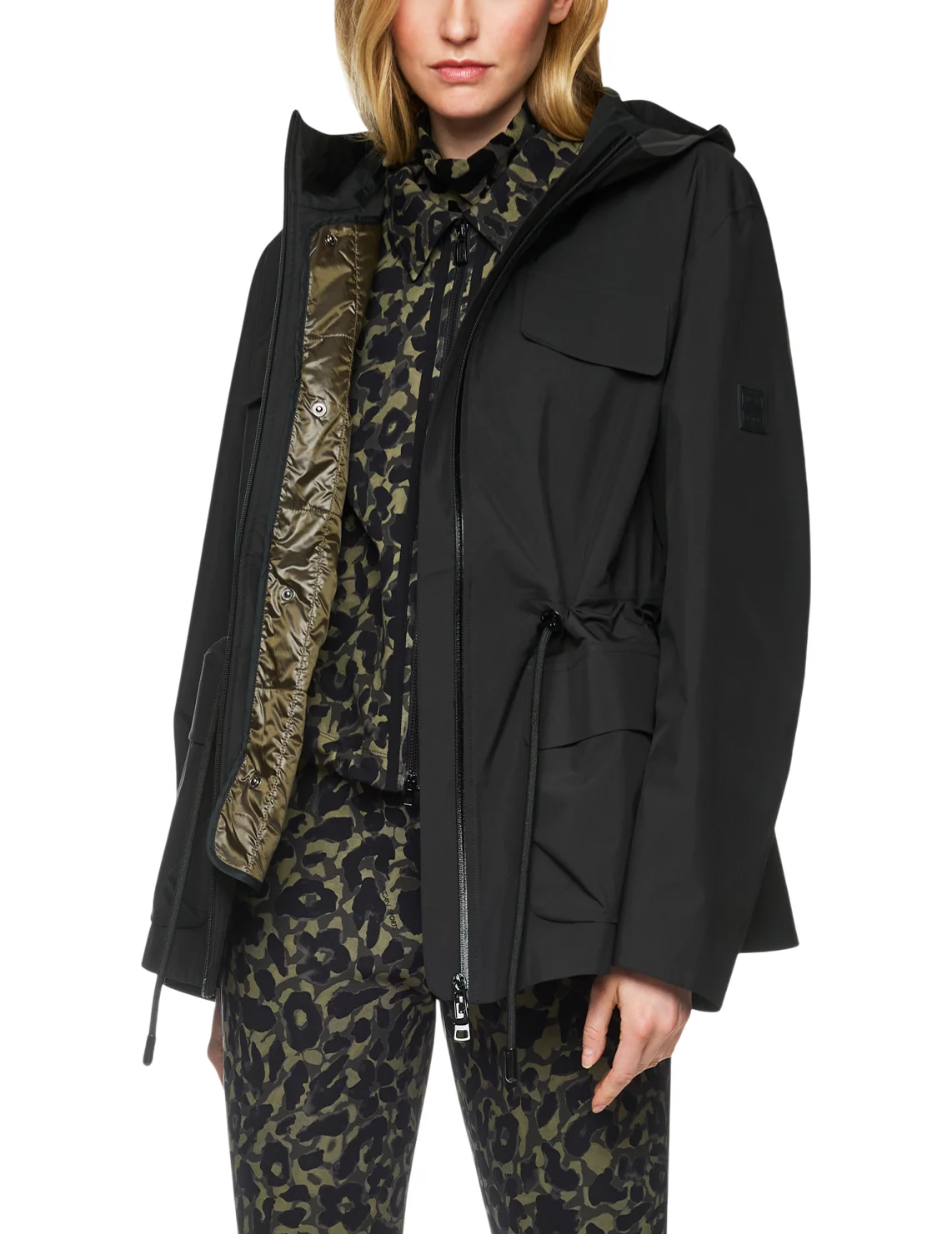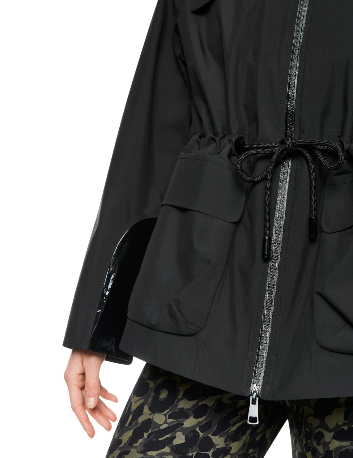 Куртка изготовлена из 100% полиэстера. Модель выполнена в прямом крое. Имеет воротник-стойку, капюшон, кулиску, карманы с клапанами, длинные рукава и двустороннюю застежку-молнию. Декорирована лакированными вставка на рукавах и капюшоне.