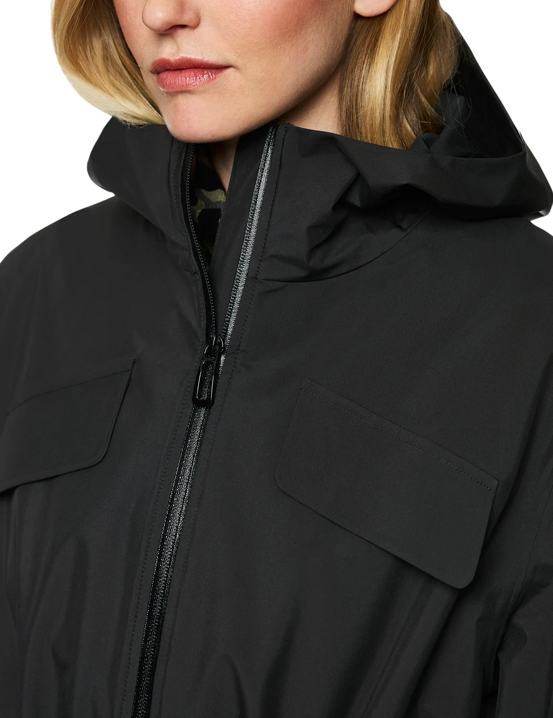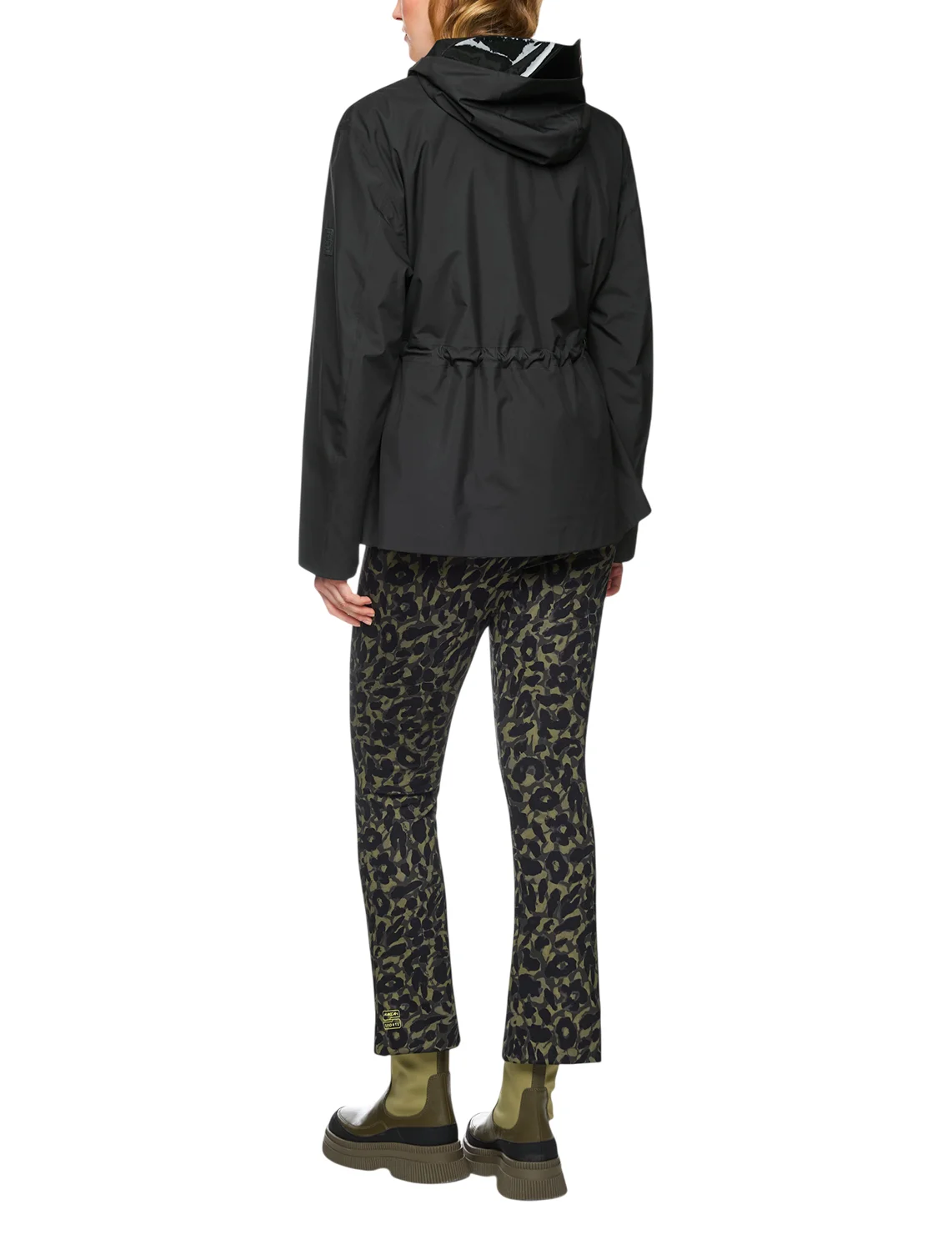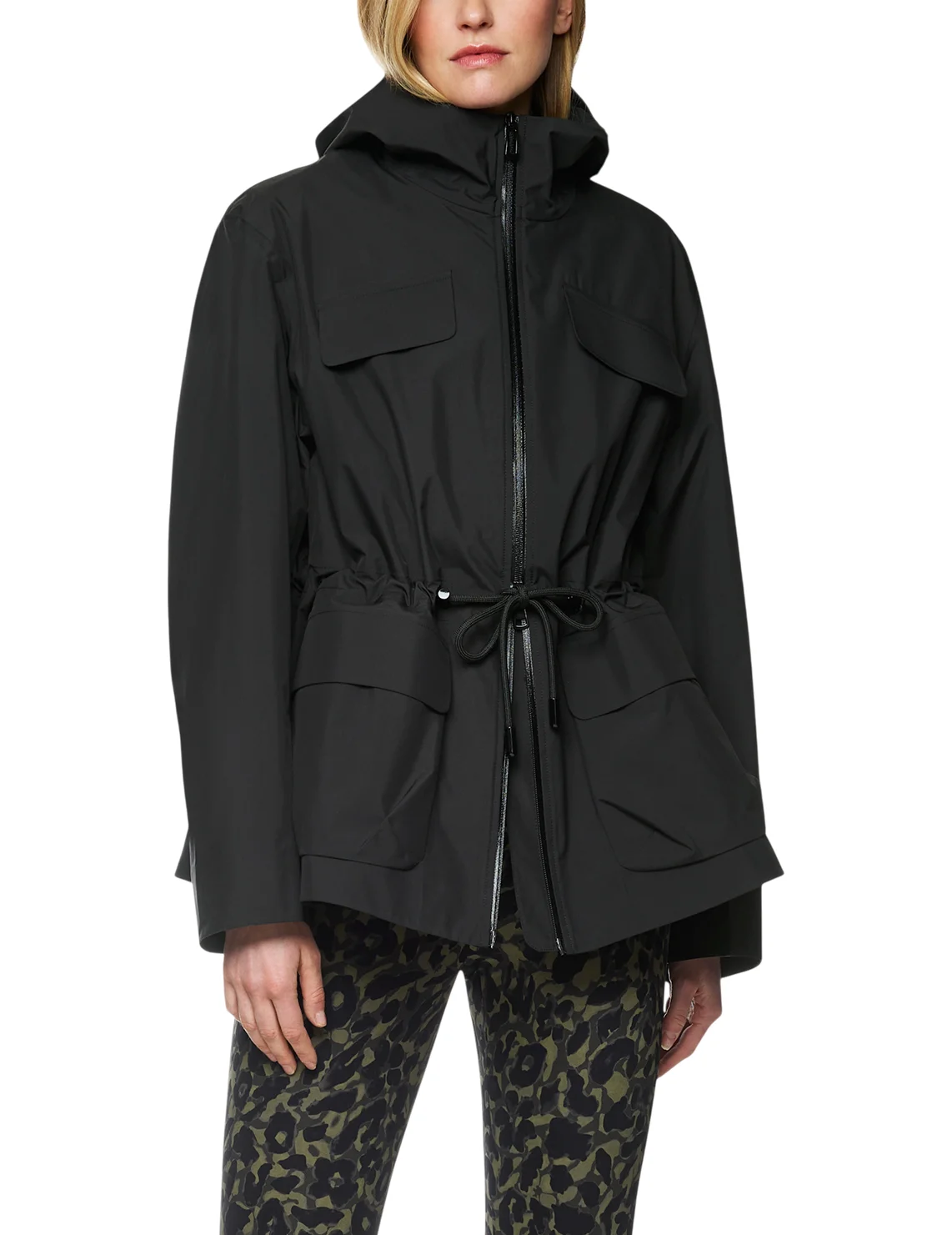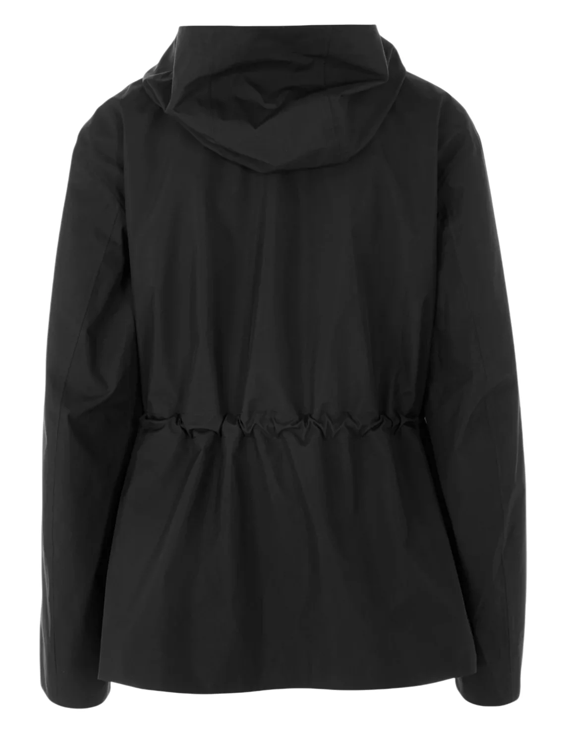 Куртка изготовлена из 100% полиэстера. Модель выполнена в прямом крое. Имеет воротник-стойку, капюшон, кулиску, карманы с клапанами, длинные рукава и двустороннюю застежку-молнию. Декорирована лакированными вставка на рукавах и капюшоне.