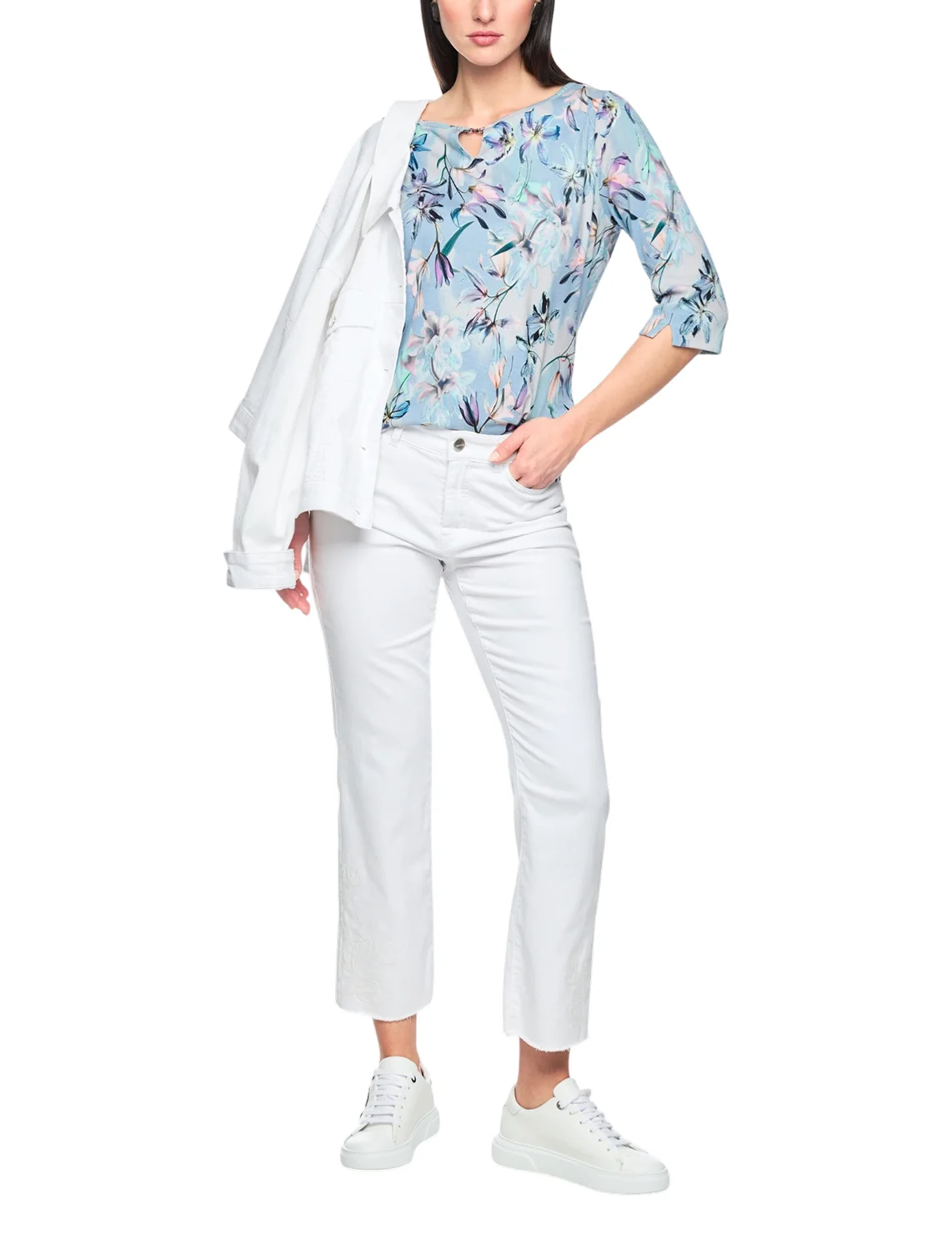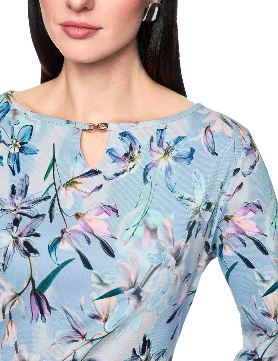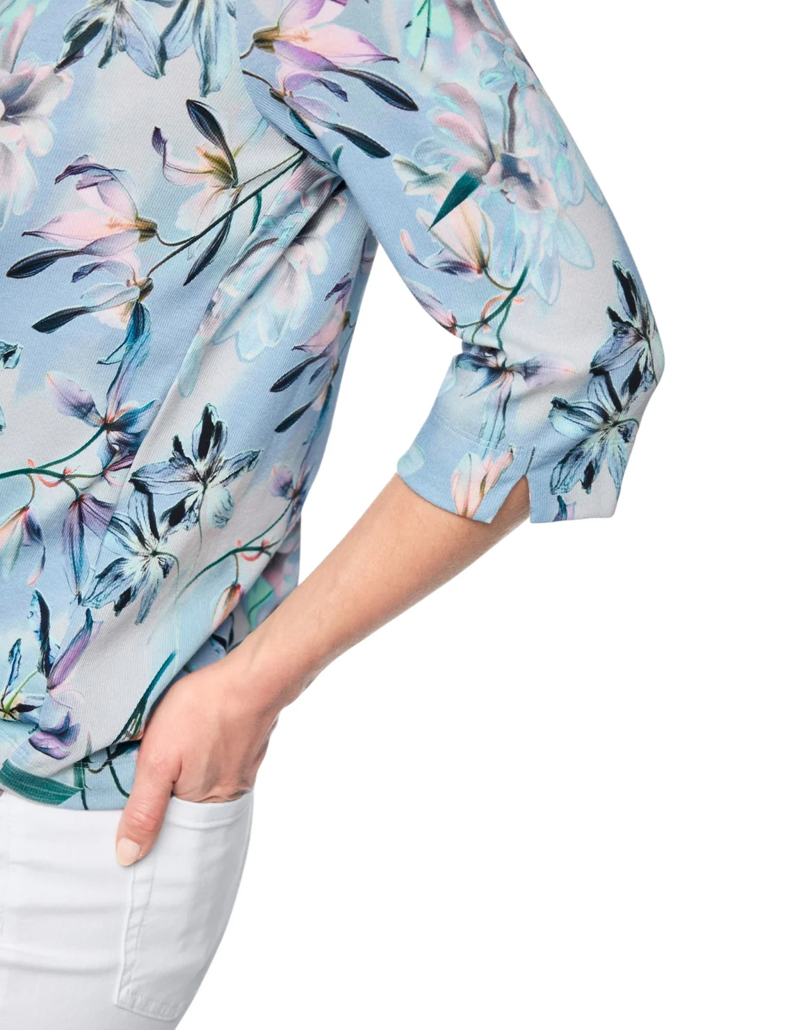 Лонгслив изготовлен из хлопка и эластана. Модель выполнена в прямом крое. Имеет круглый вырез горловины, V-образный вырез и рукава длиной 3/4 с разрезами. Декорирован цветочным принтом.