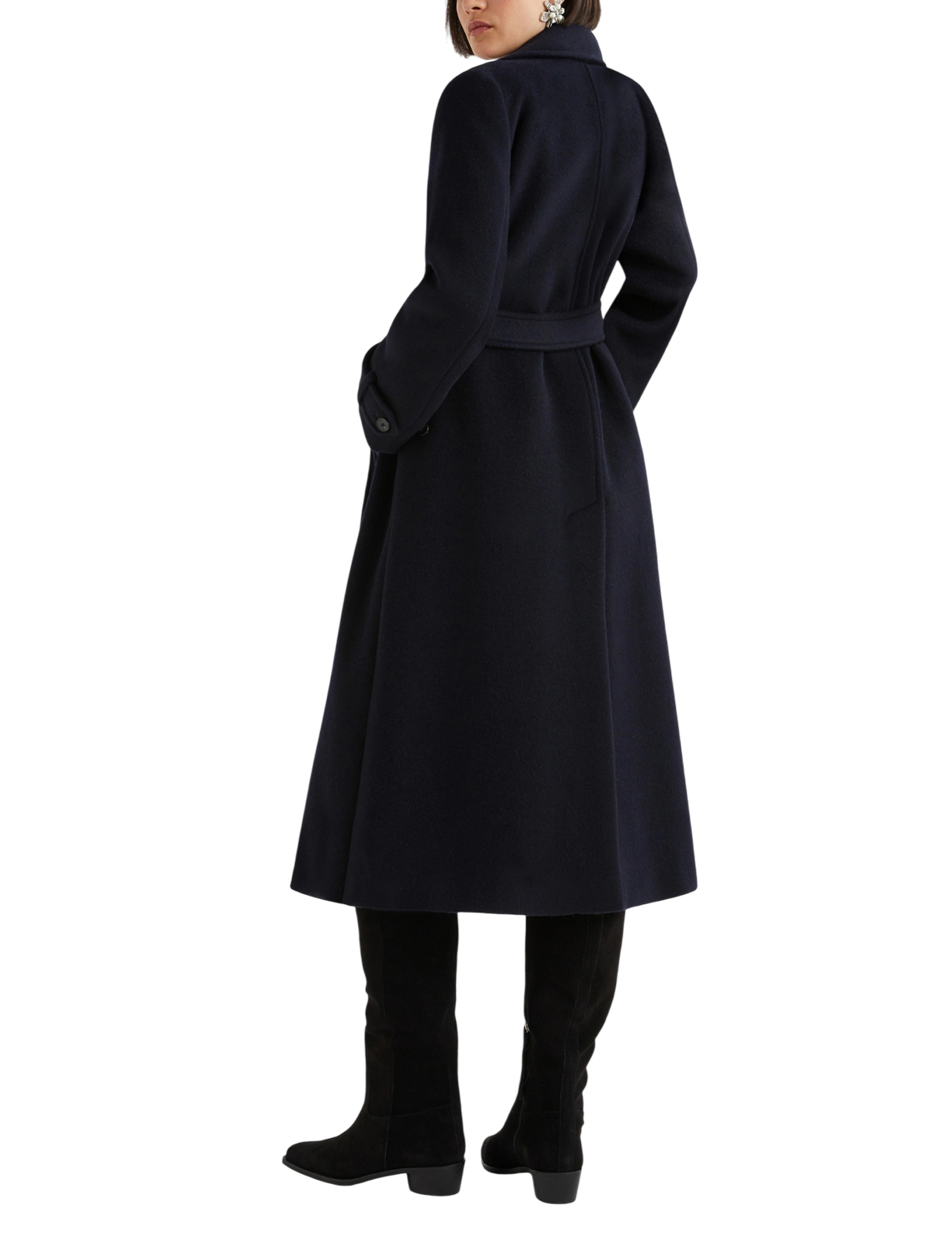 Двубортное пальто изготовлено из шерсти полиамида и других волокон, подкладка из ацетата. Модель выполнена в прямом крое. Имеет отложной воротник с лацканами, длинные рукава с манжетами, тканевый пояс в тон и прорезные карманы.