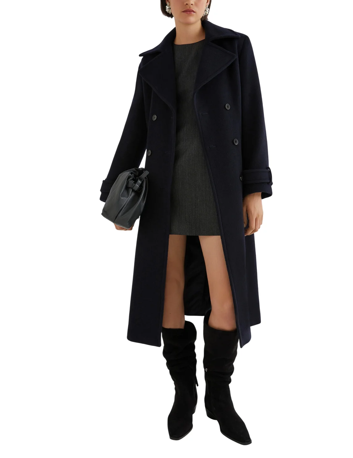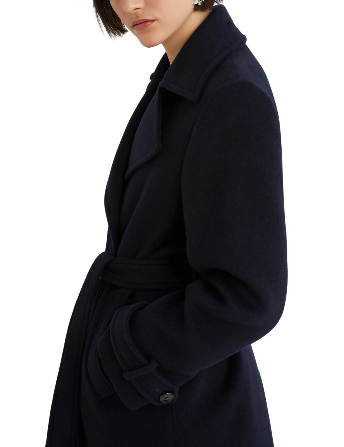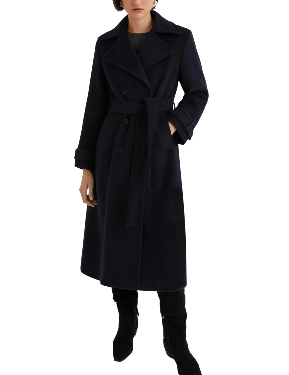 Двубортное пальто изготовлено из шерсти полиамида и других волокон, подкладка из ацетата. Модель выполнена в прямом крое. Имеет отложной воротник с лацканами, длинные рукава с манжетами, тканевый пояс в тон и прорезные карманы.