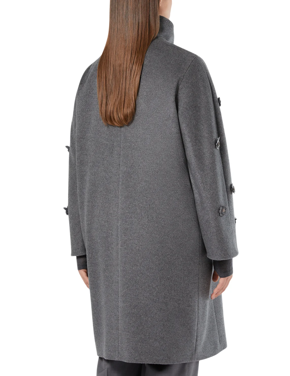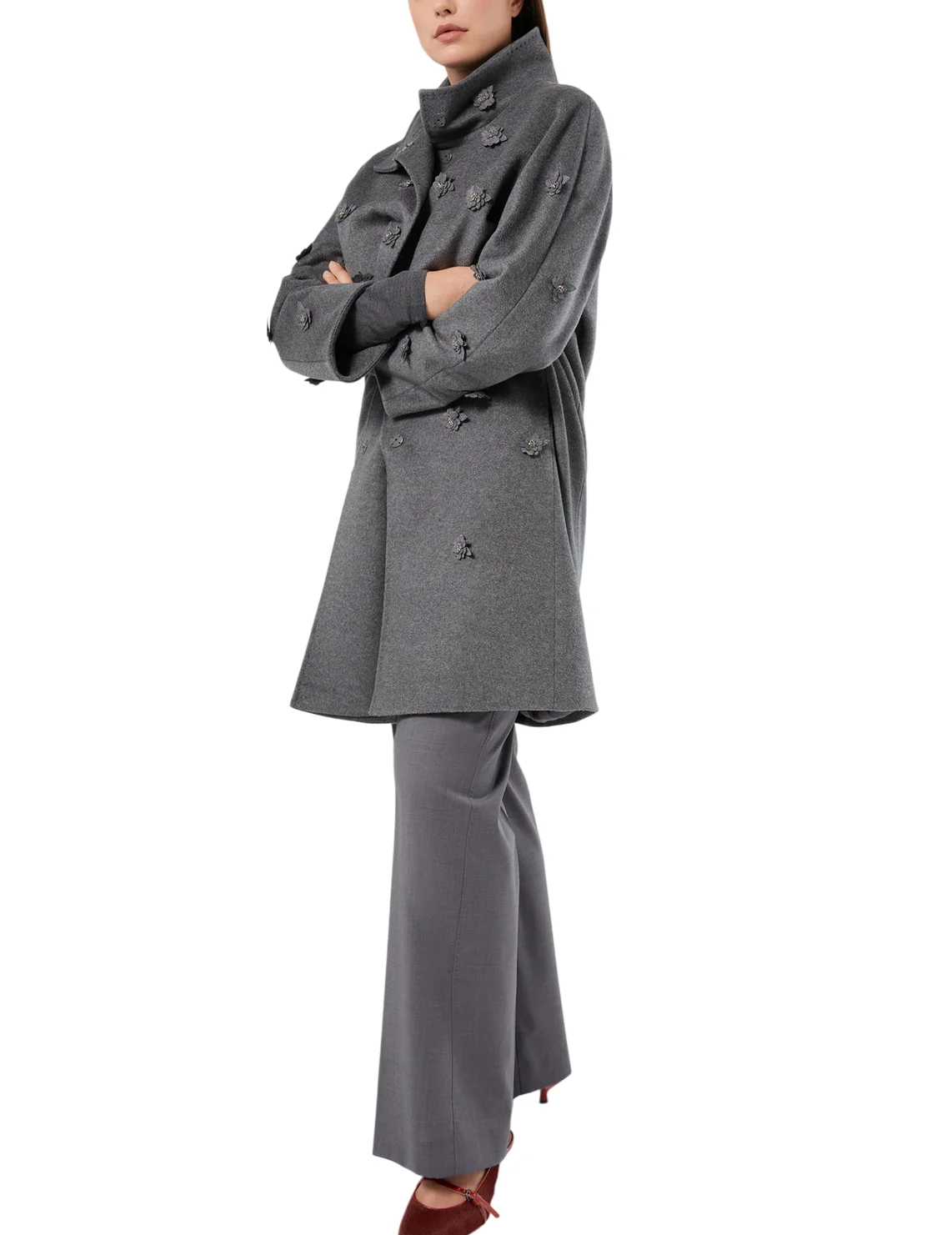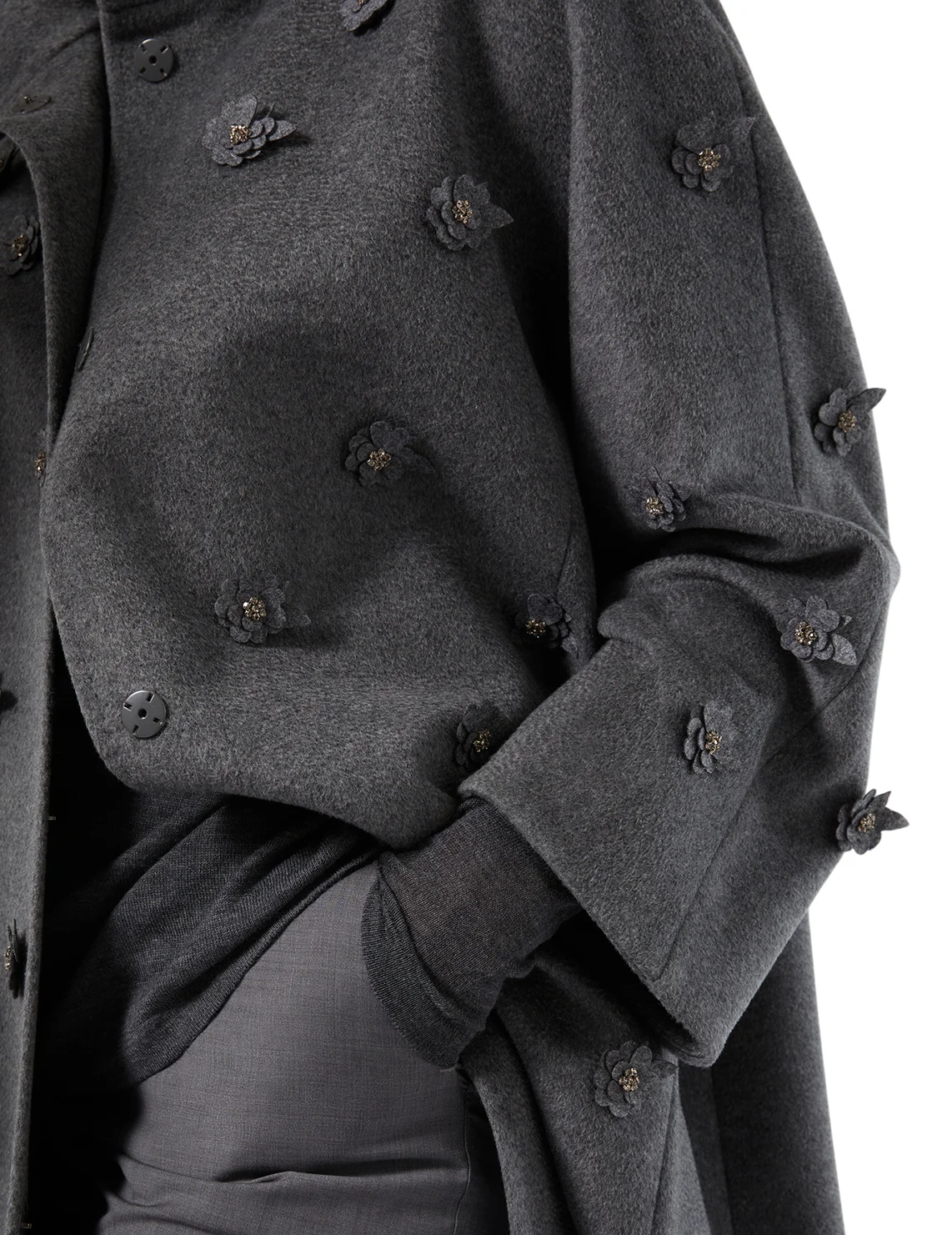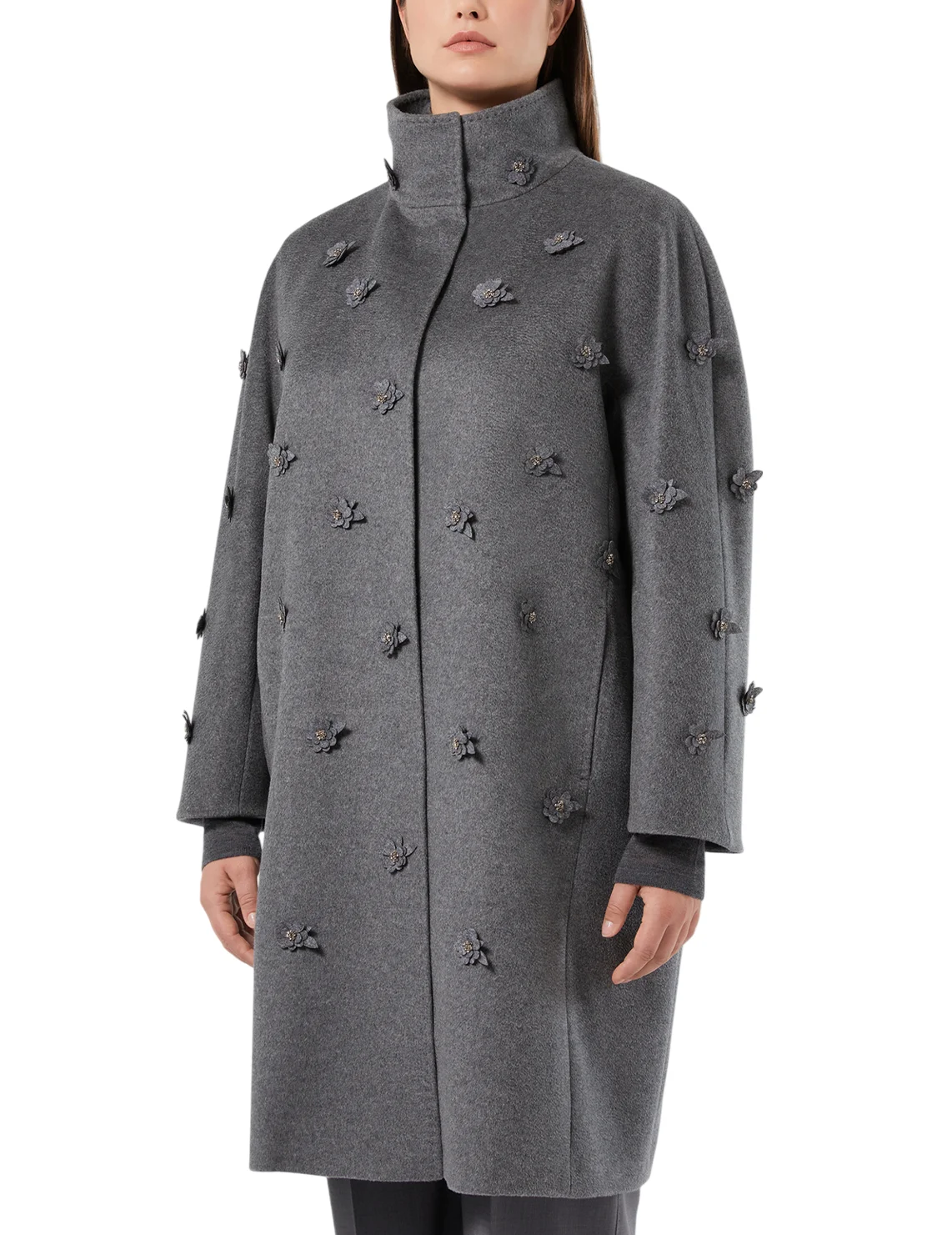 Пальто изготовлено из 100% шерсти высокого качества. Модель выполнена в прямом крое. Имеет воротник-стойку, длинные рукава, застежку на кнопках и прорезные карманы. Декорировано цветочными аппликациями.
