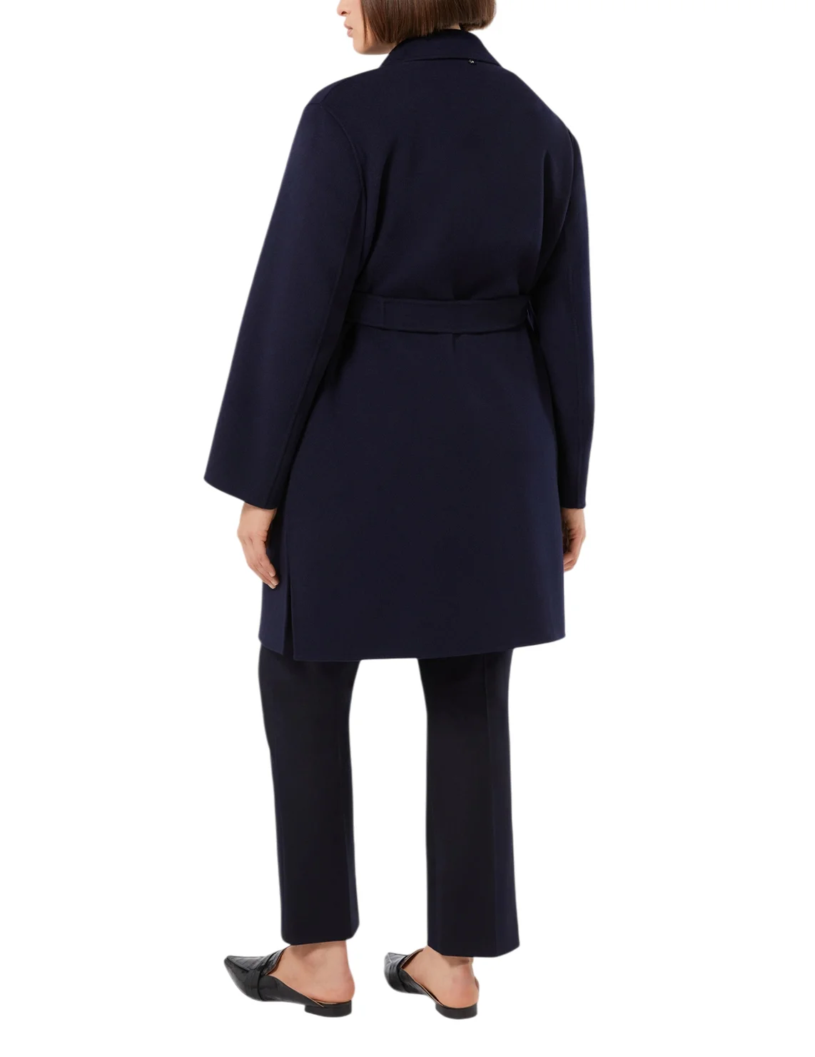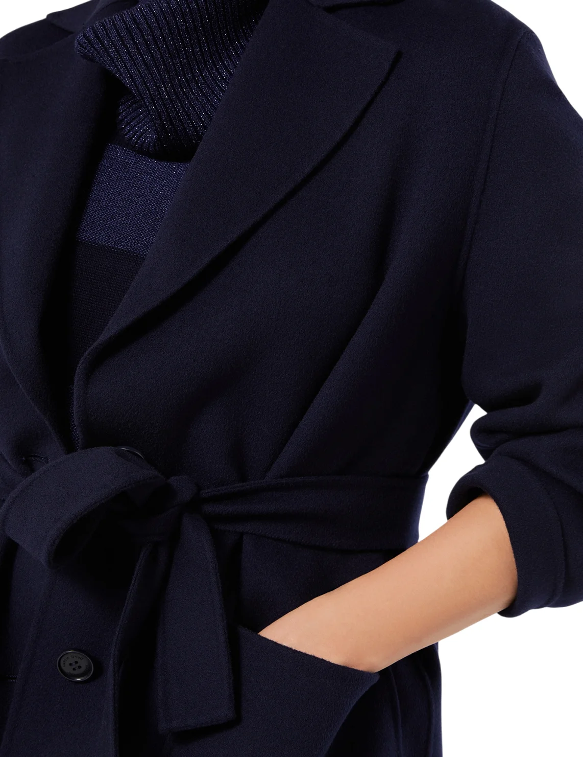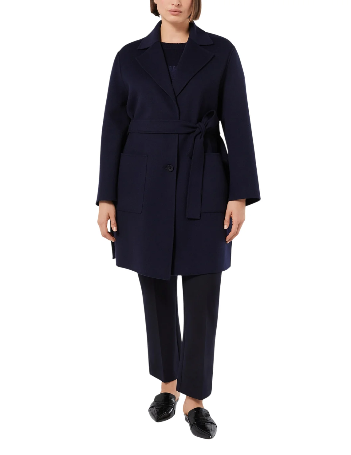 Однобортное пальто изготовлено из шерсти и полиамида. Модель выполнена в прямом крое. Имеет отложной воротник с лацканами, длинные рукава, тканевый пояс в тон, боковые разрезы и накладные карманы.