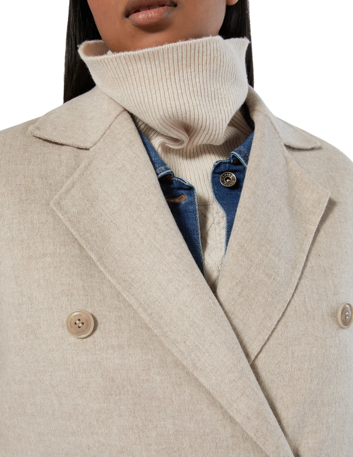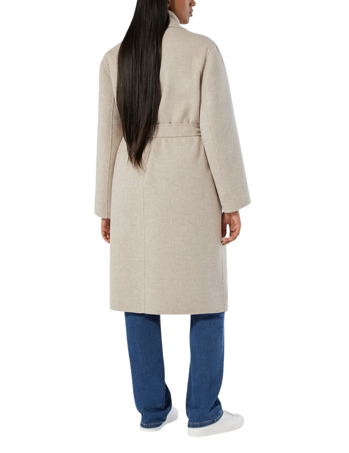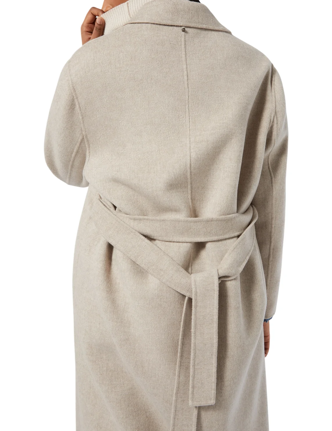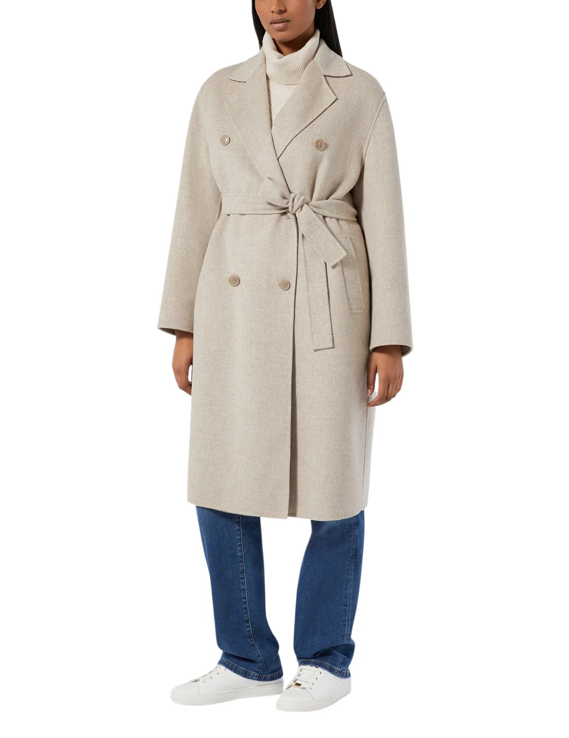 Двубортное пальто изготовлено из шерсти и полиамида. Модель выполнена в свободном крое. Имеет отложной воротник с лацканами, длинные рукава, тканевый пояс в тон и прорезные карманы.